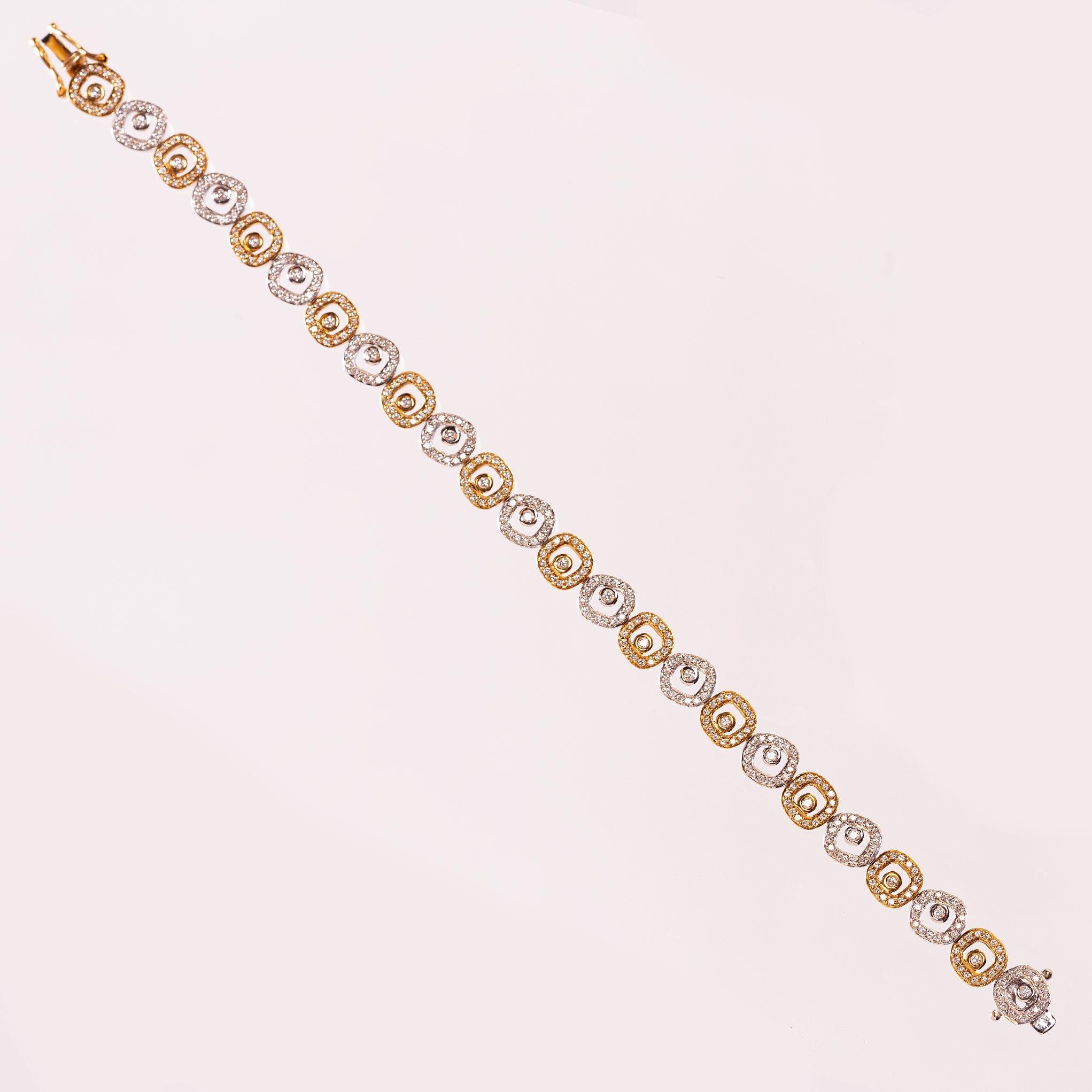 Pulsera tipo tennis en oro 18 K blanco y amarillo totalmente decorada con pequeños diamantes talla brillante. Largo 185 mm. Ancho 7,5 mm. Peso bruto 21,7 gr.