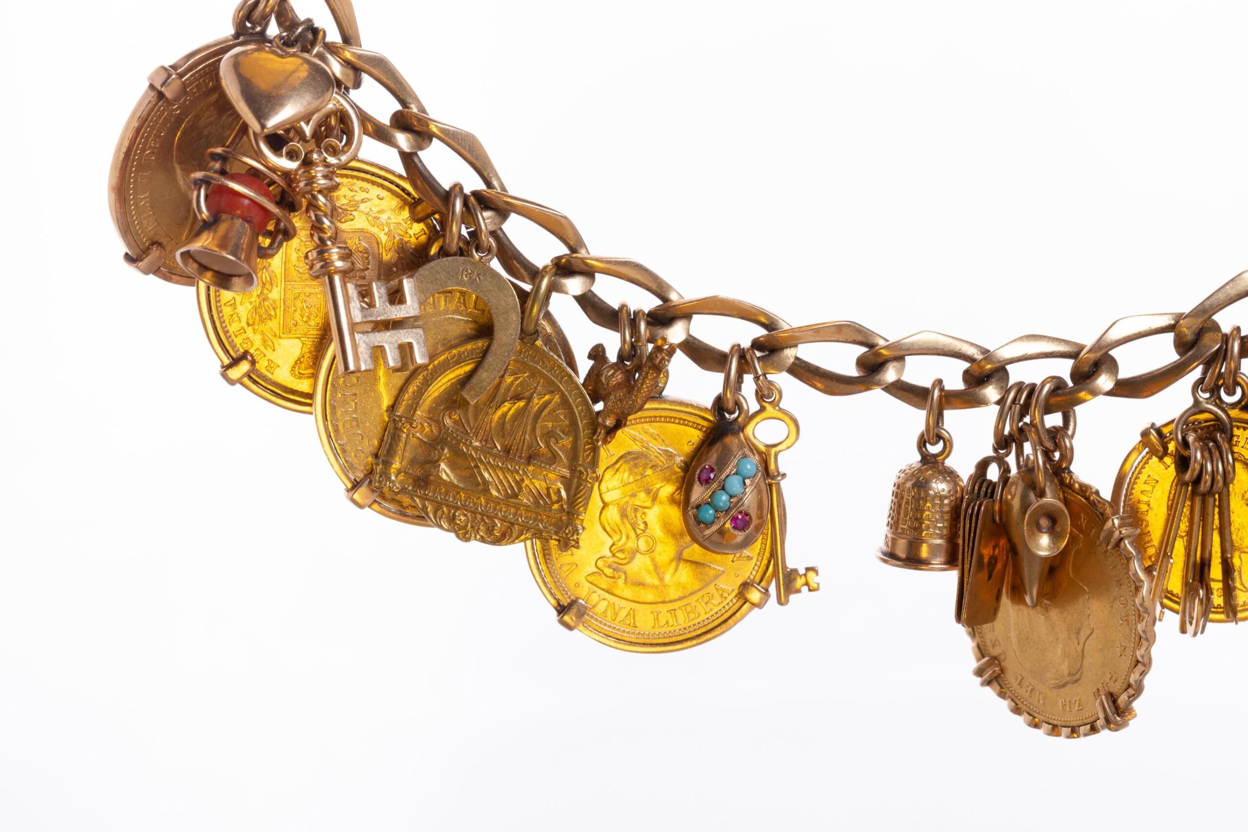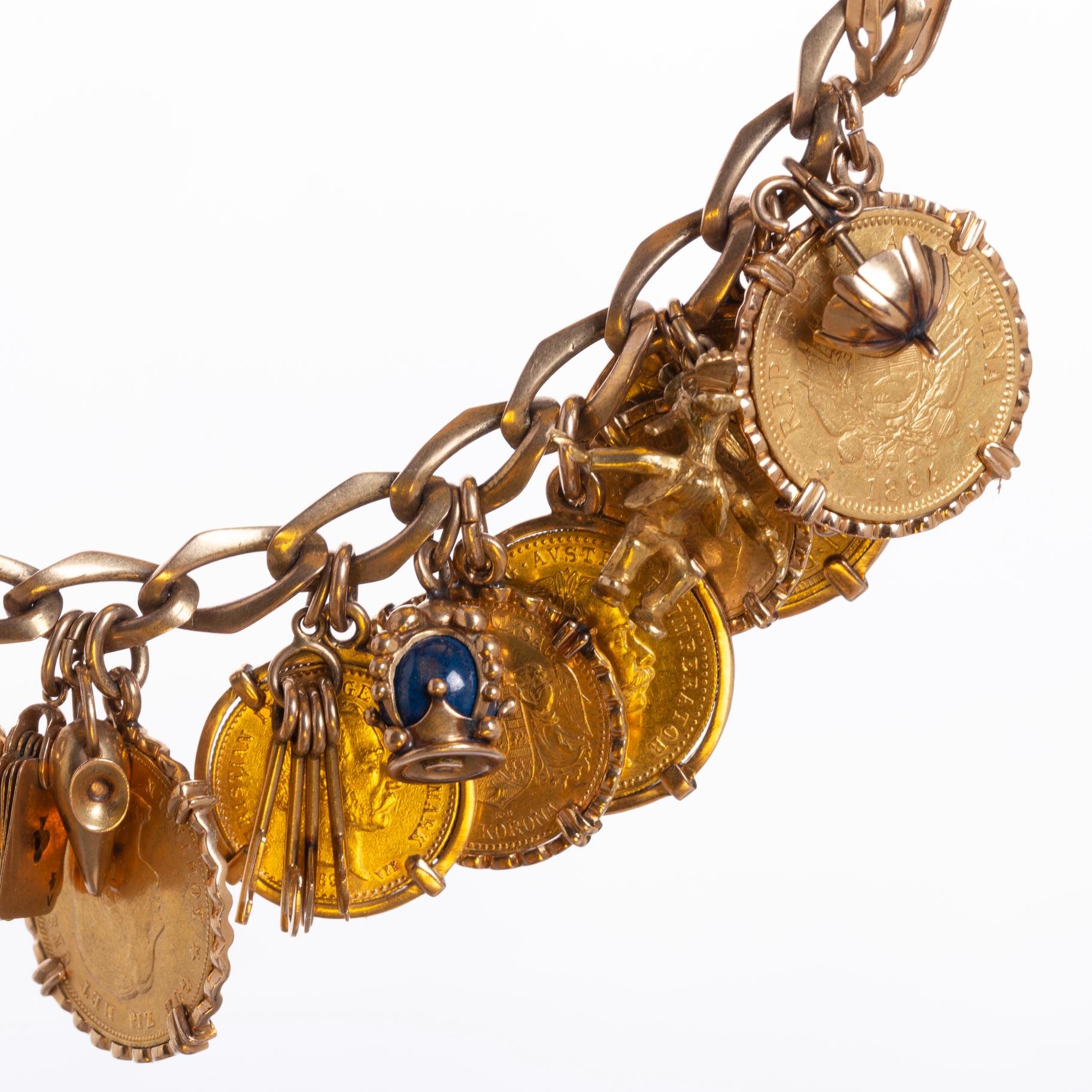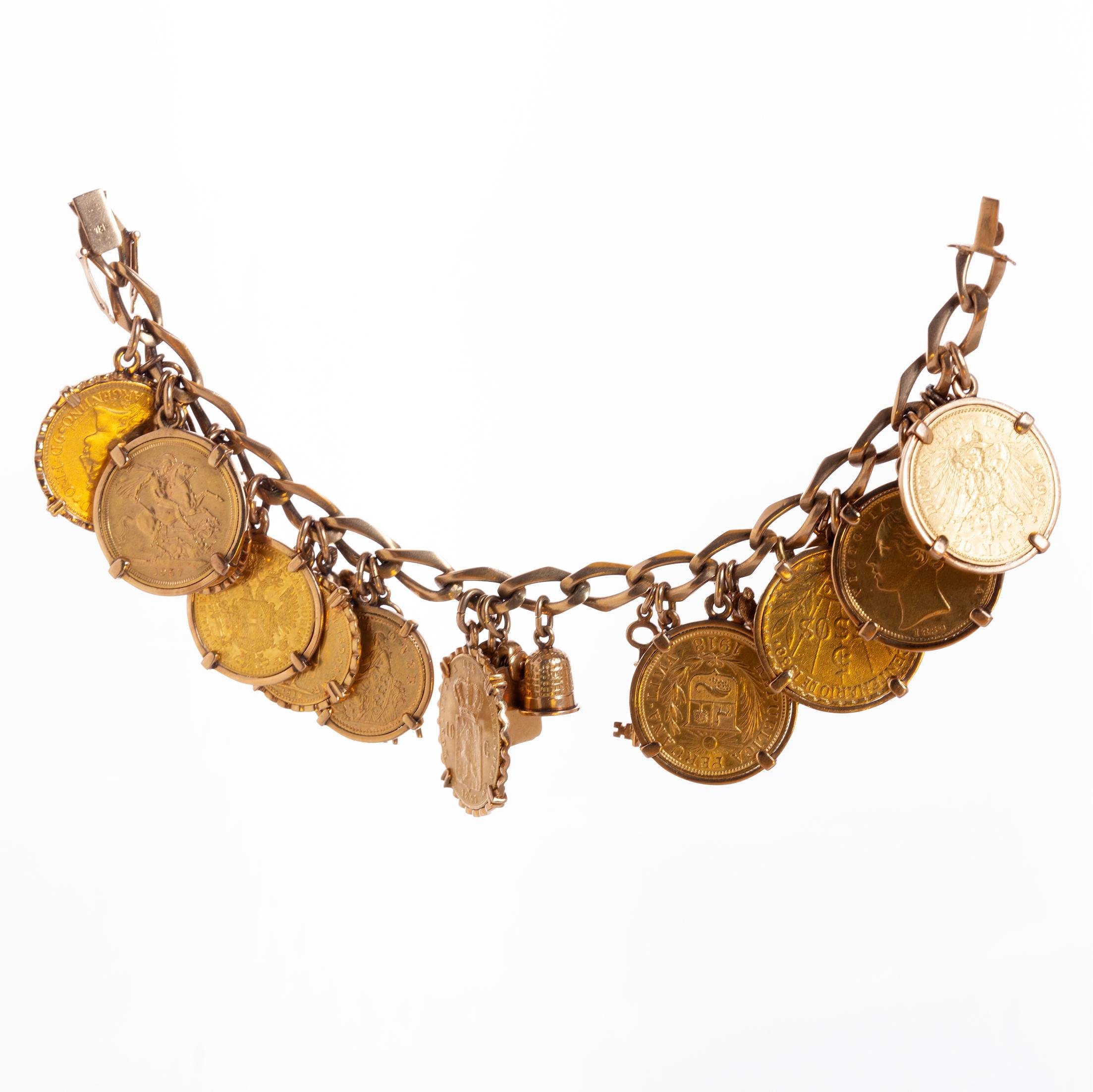 Pulsera en eslabones de oro 18 K amarillo con catorce dijes en oro 18 K amarillo y once monedas en oro: una británica denominación 1 libra del año 1869, una alemana denominación 20 marcos del año 1894, una uruguaya denominación 5 pesos del año 1930, una peruana denominación una 1 del año 1918, una neerlandesa denominación 10 coronas del año 1897, una dinamarquesa denominación 10 coronas del año 1898, una austrohúngara denominación 10 coronas del año 1910, una austrohúngara denominación 1 ducado del año 1915, una mexicana denominación 2 pesos y medio del año 1945, una británica denominación 1 libra del año 1957 y una argentina denominación 5 pesos del año 1884. Peso total 145 gr.