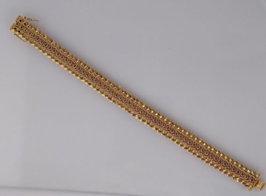 Pulsera articulada en oro 18 K amarillo. Ancho 12 mm. Largo 195 mm. Peso 26 gr.