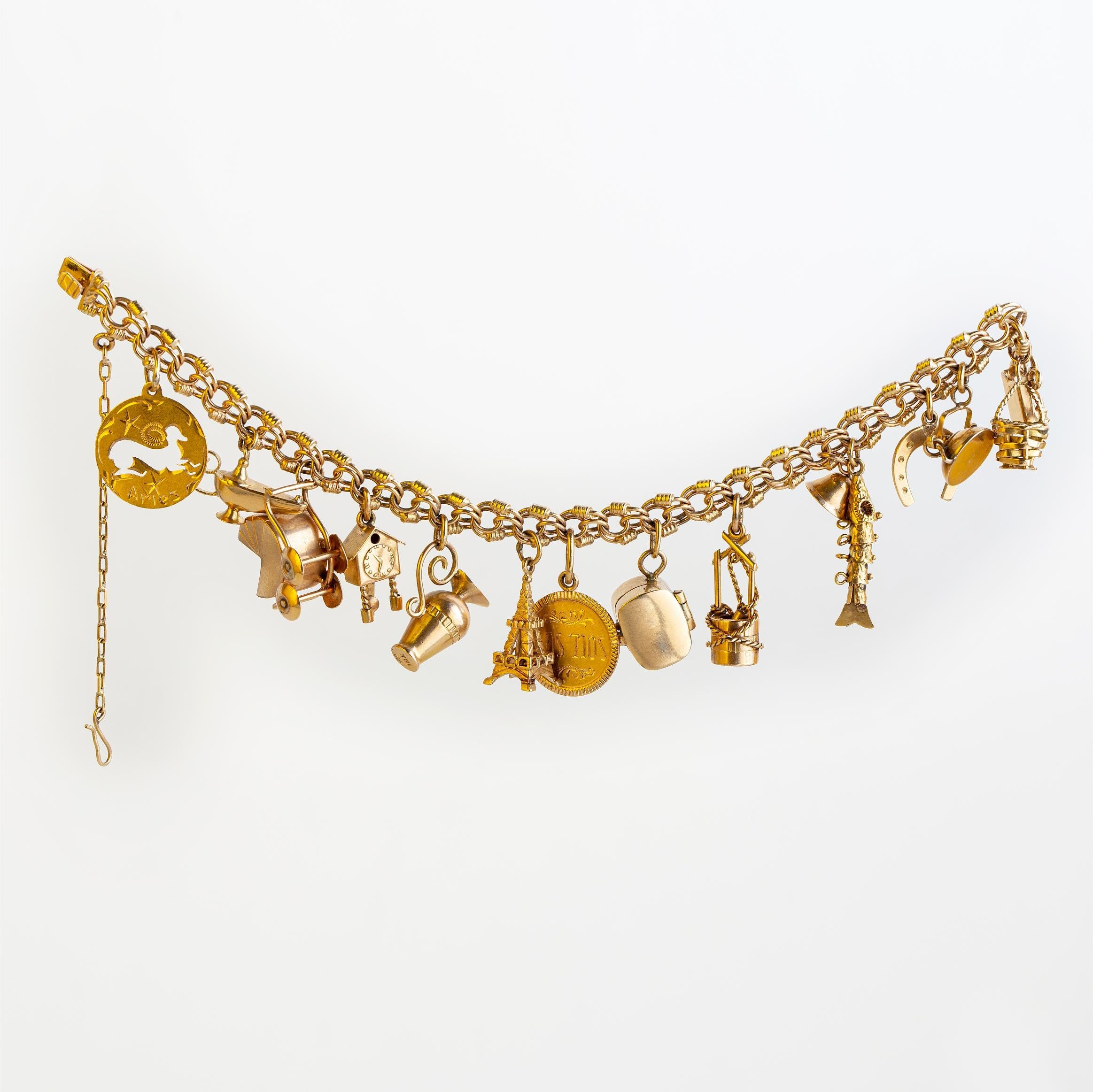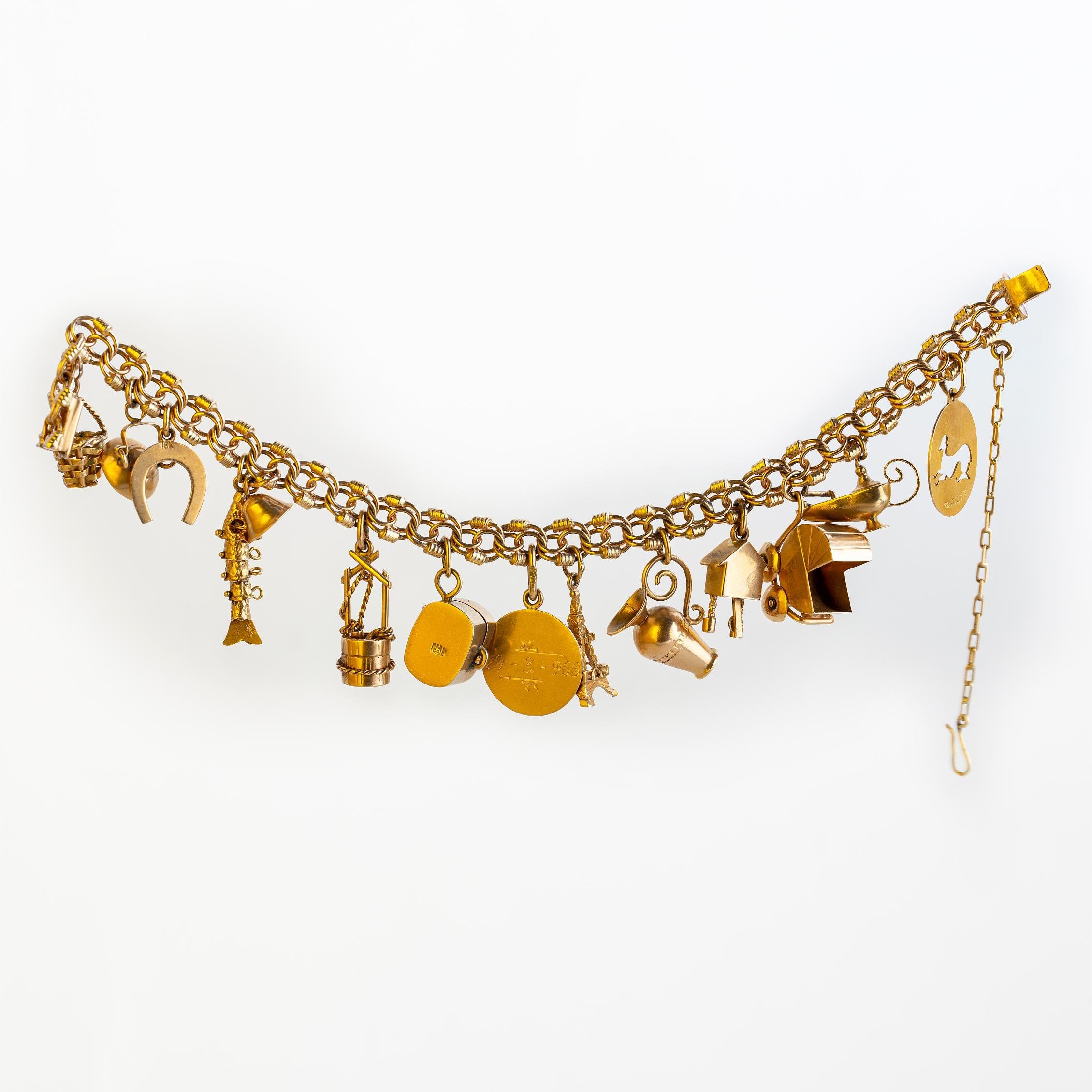 Pulsera en aros de oro 18 K entrelazados, con catorce dijes en oro, diferentes, y cadenita de seguridad. Largo 175 mm. Ancho 7 mm. Peso 35 gr.