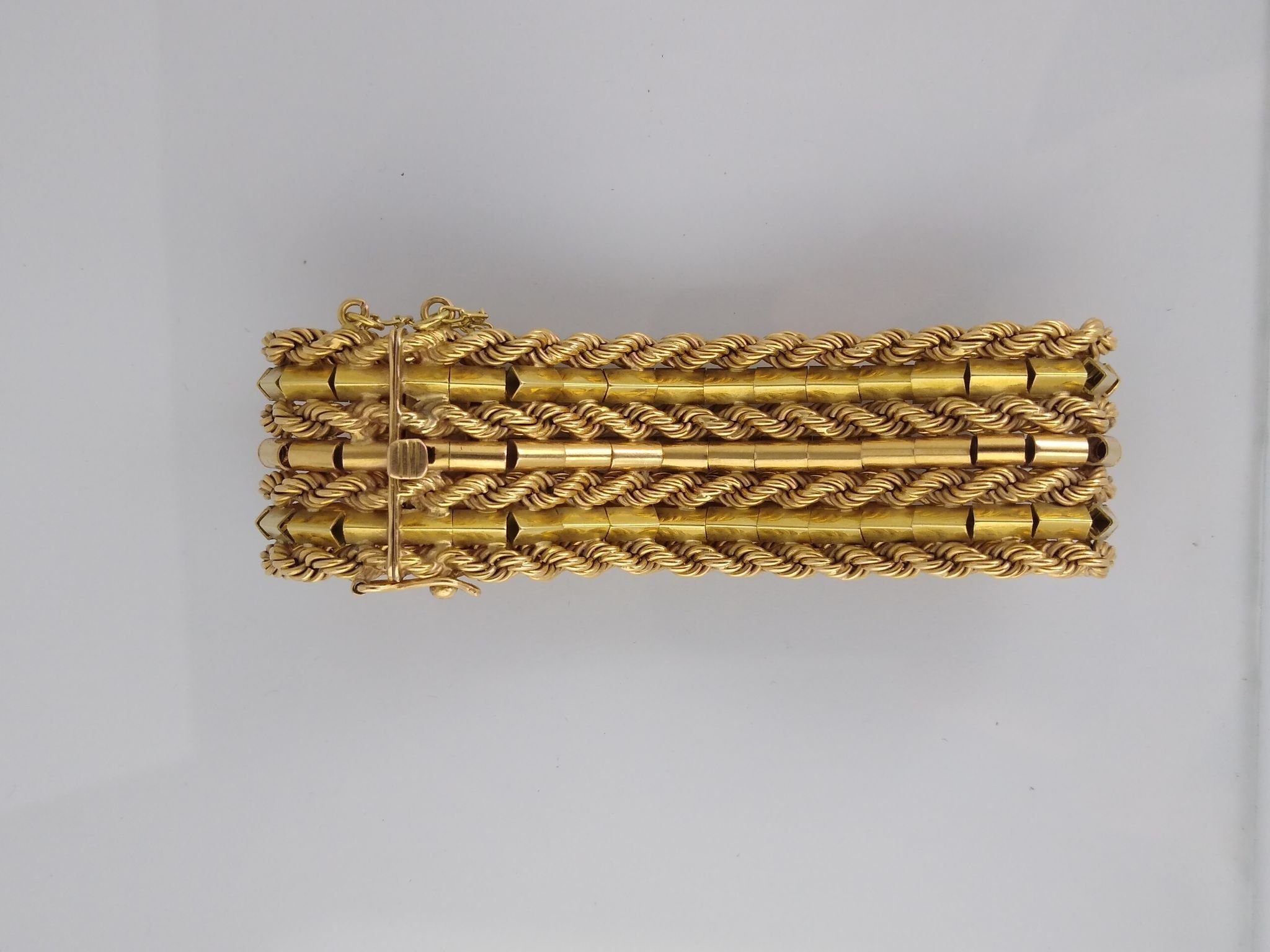 Pulsera tipo brazalete en oro 18 K amarillo trenzado y articulado. Ancho 25 mm. Peso 70 gr.