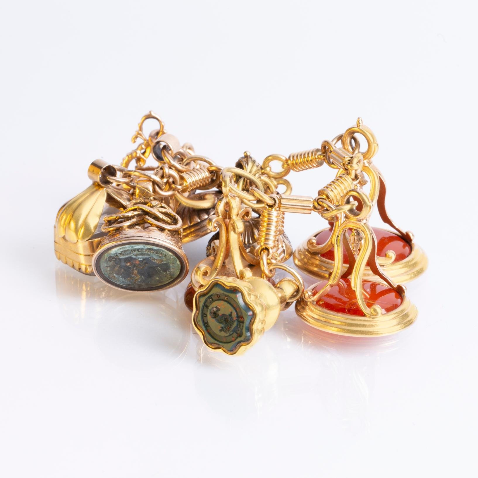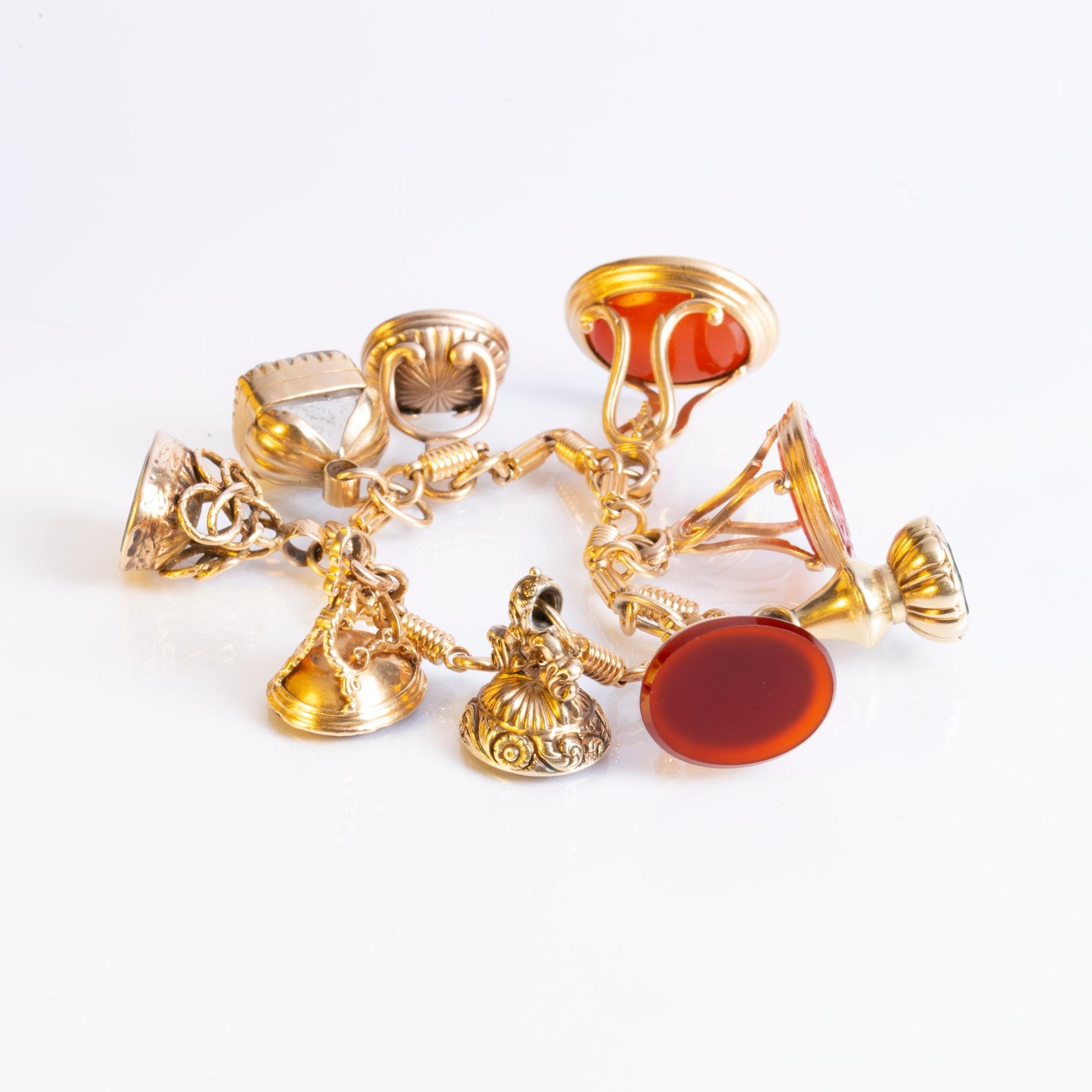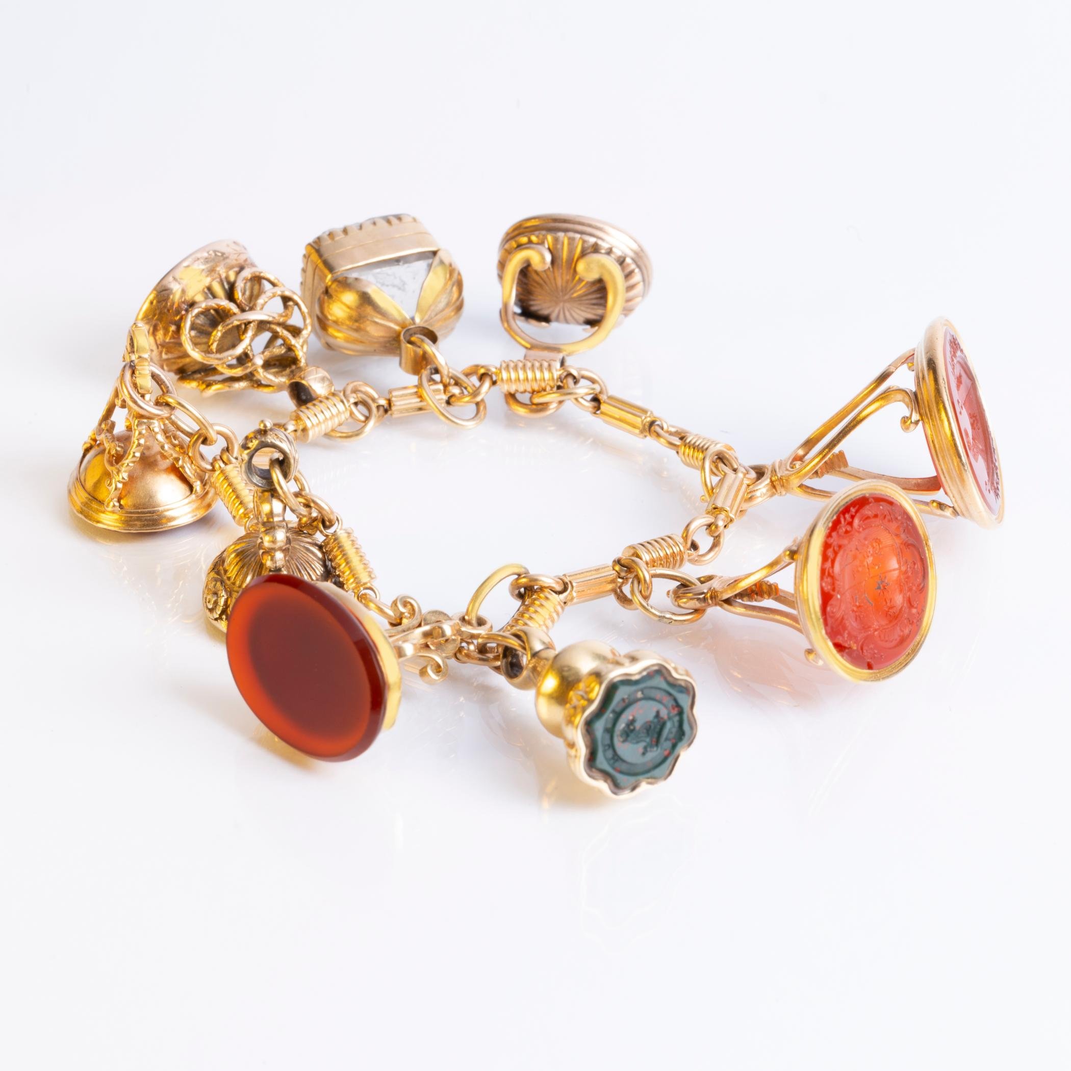 Pulsera en eslabones de oro 18 K amarillo con nueve matasellos para lacre en oro amarillo con diferentes piedras talladas «blasones». Peso bruto 71 gr.