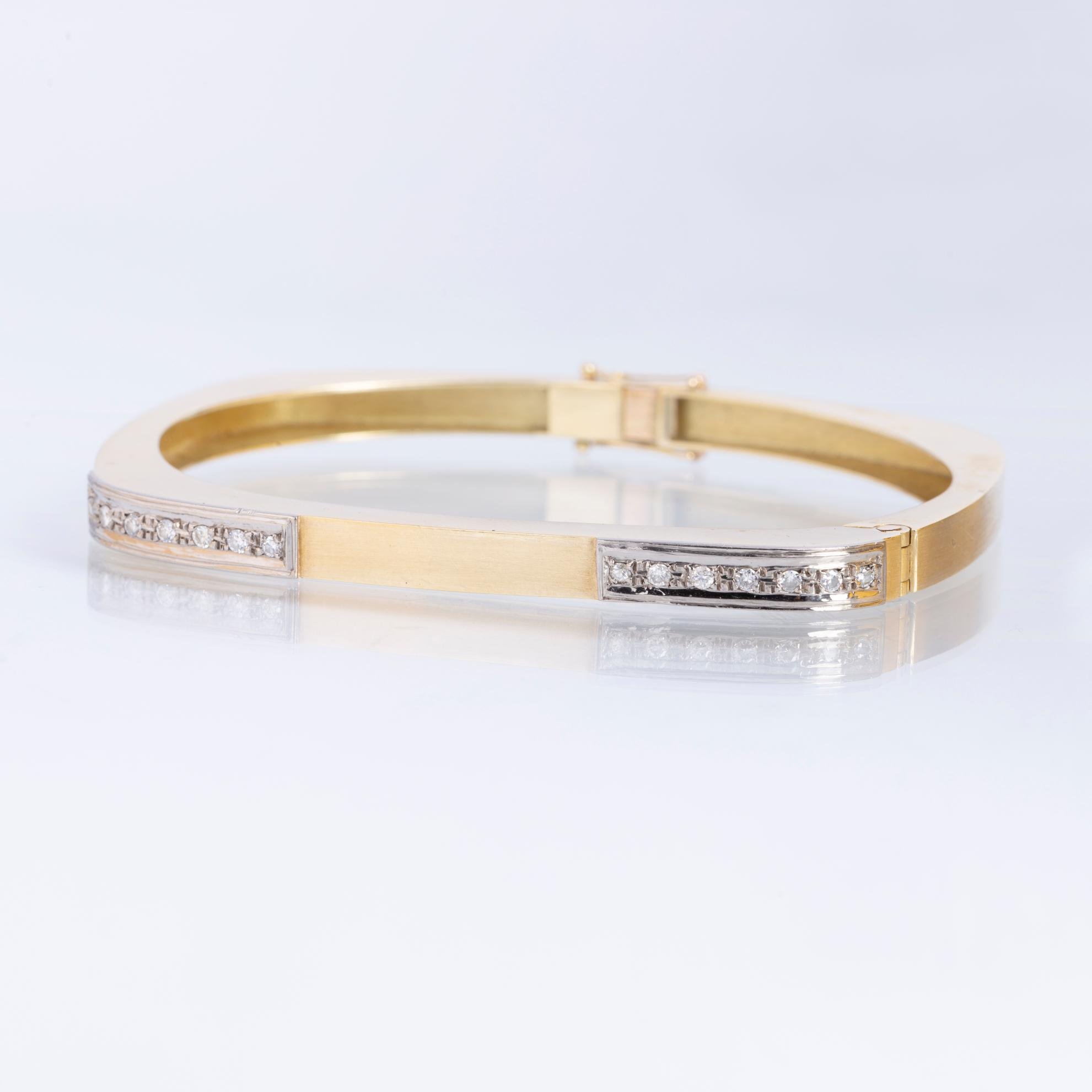Pulsera rígida en oro 18 K amarillo con ángulos en oro 18 K blanco y catorce pequeños diamantes talla brillante. Medida interna 61 x 43 mm. Peso bruto 21 cm.