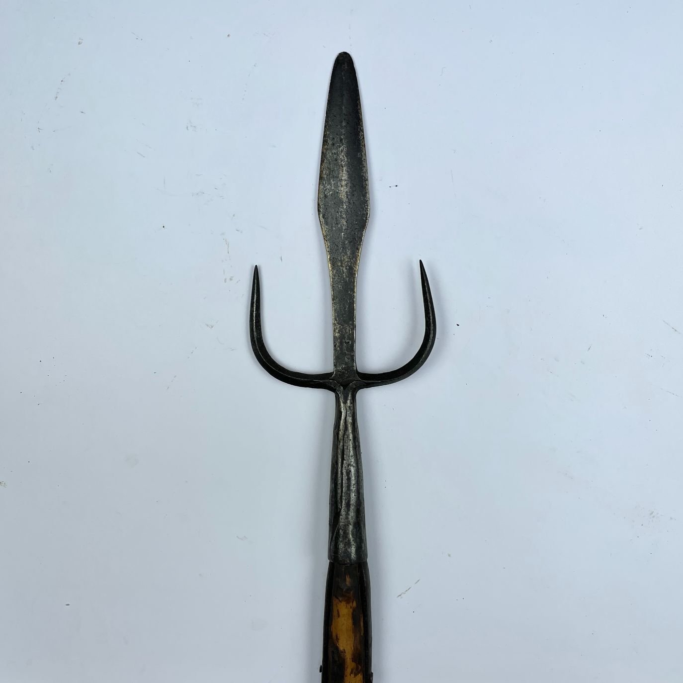 Punta de lanza con hoja de tres caras en hierro forjado, con costillas averiadas. Largo 24 cm.