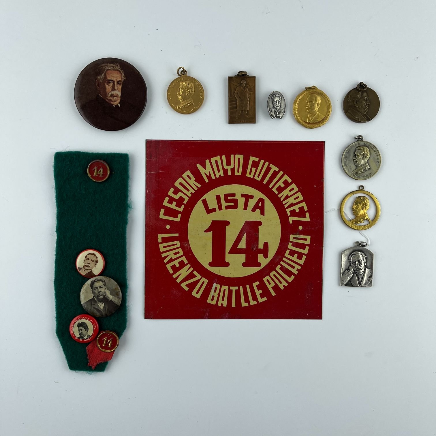 Quince piezas. Placa en hojalata con propaganda de la Lista 14 del Partido Colorado para las elecciones de 1950 con inscripción «César Mayo Gutiérrez. Lorenzo Batlle Pacheco», seis pines y ocho medallas de temática batllista.