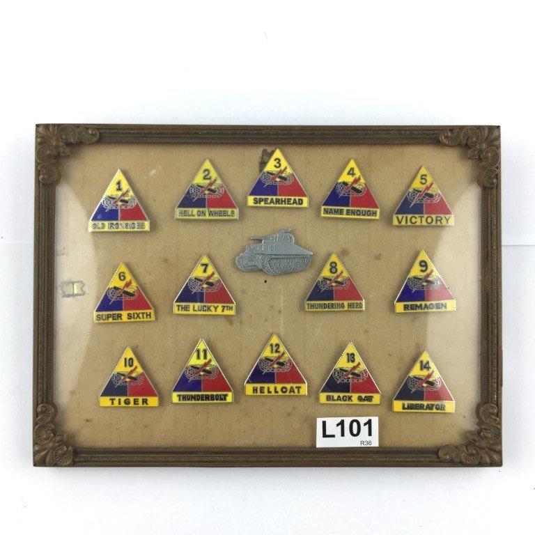 Lote de quince pins en metal y esmalte para tanquistas del ejército estadounidense, divisiones uno a catorce.