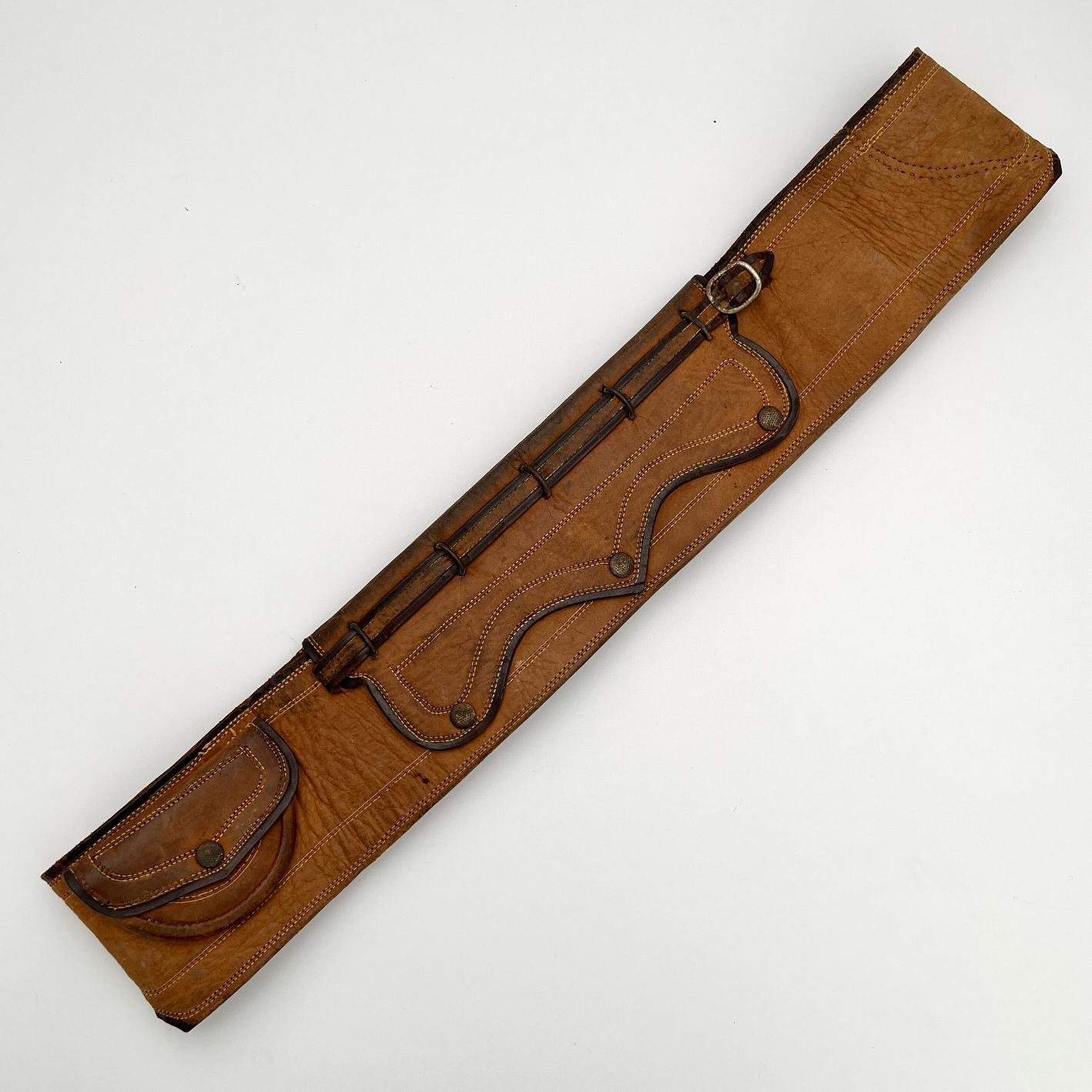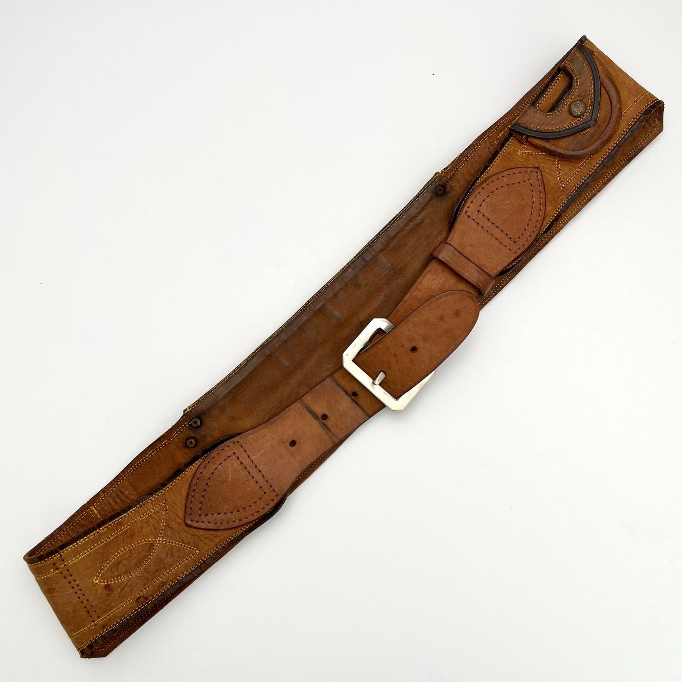 Rastra en cuero crudo con detalles en fino cuero trenzado y medallón central en plata y oro esculturados «flor», con tirador en cuero crudo con detalles en fino cuero trenzado.