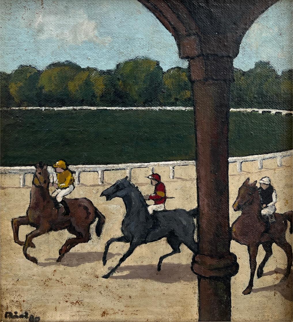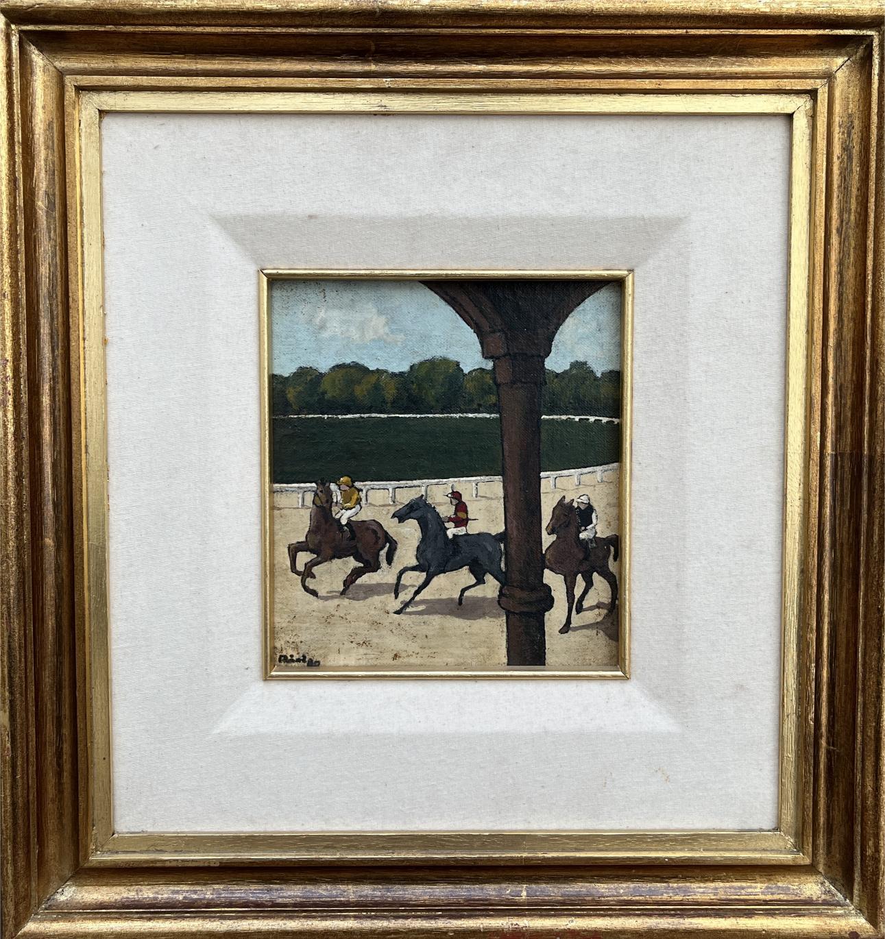 RAÚL RIAL (escuela uruguaya, 1936-2001). Óleo sobre fibra. «En las carreras.» Firmado y fechado 80 abajo a la izquierda. 16.5 x 15 cm.