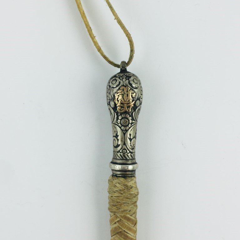 Rebenque forrado en cuero trenzado. Cabo en plata cincelado «hojas y flores» con iniciales «J.M.C.» en oro.