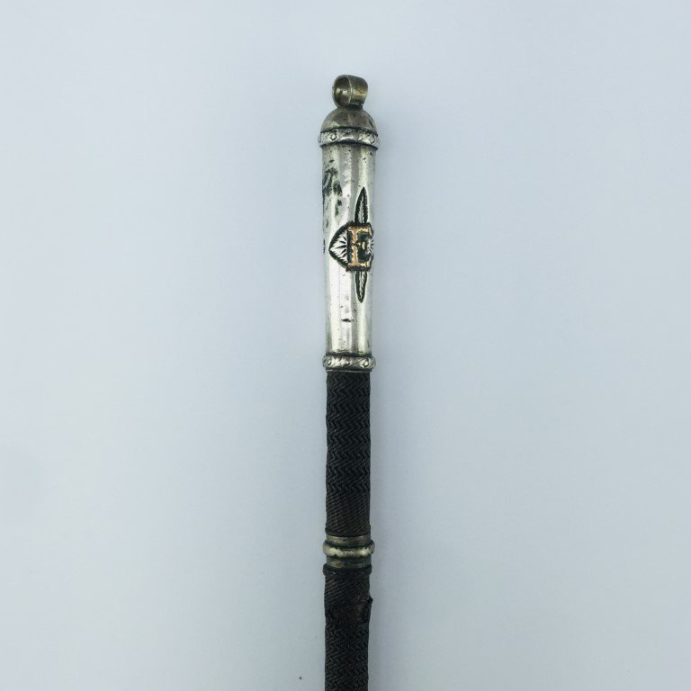 Rebenque forrado en fino cuero trenzado, con pequeñas averías. Cabo y pasador en plata cincelada «hojas» con iniciales «N.E.» en oro.