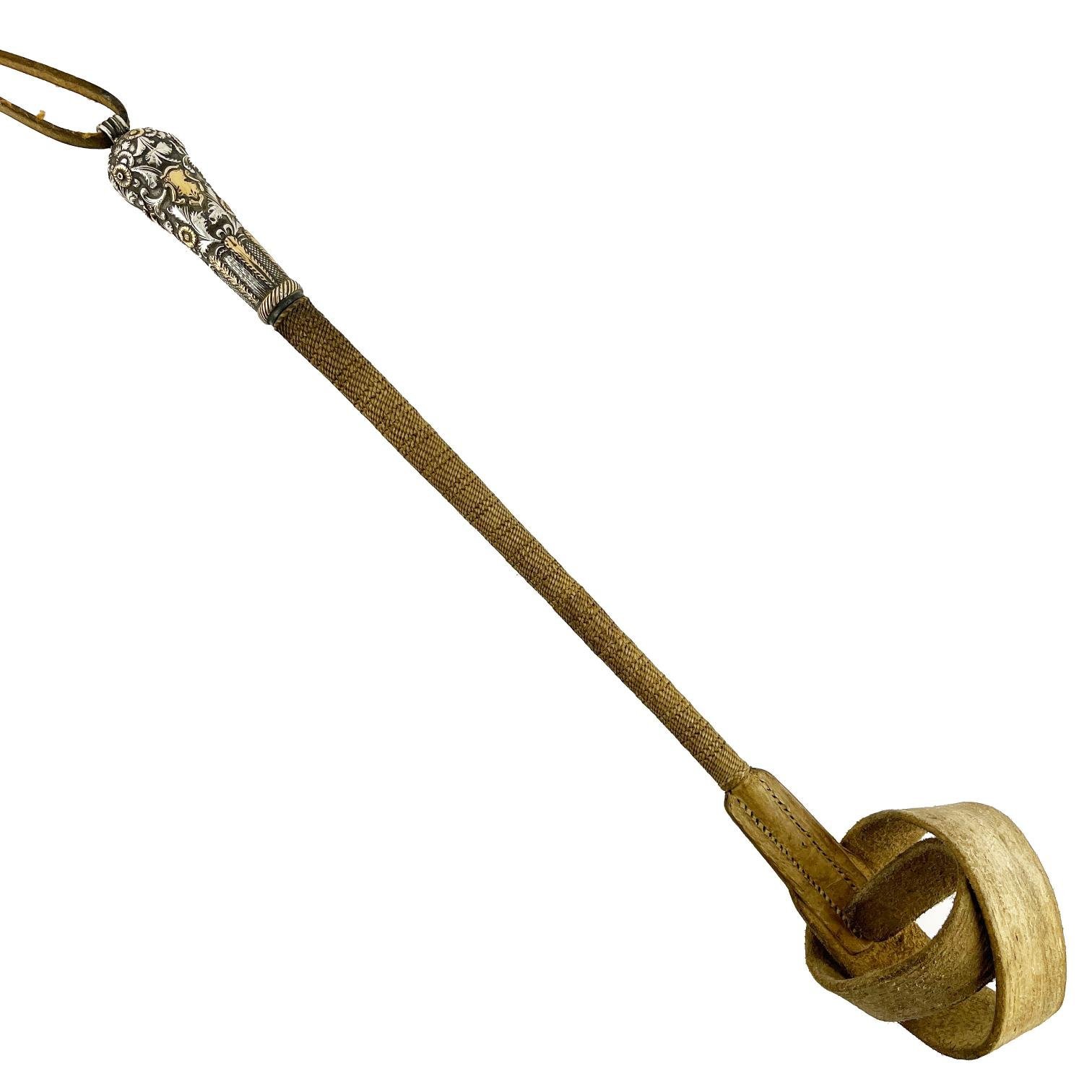 Rebenque forrado en fino cuero trenzado, con cabo en plata y oro cincelado «hojas y flores» y manija en cuero crudo.