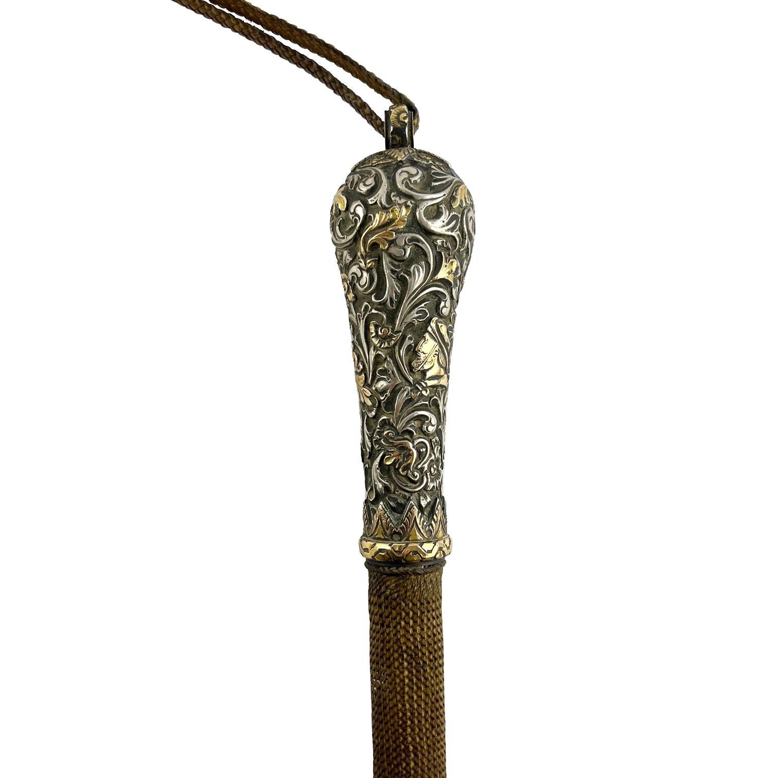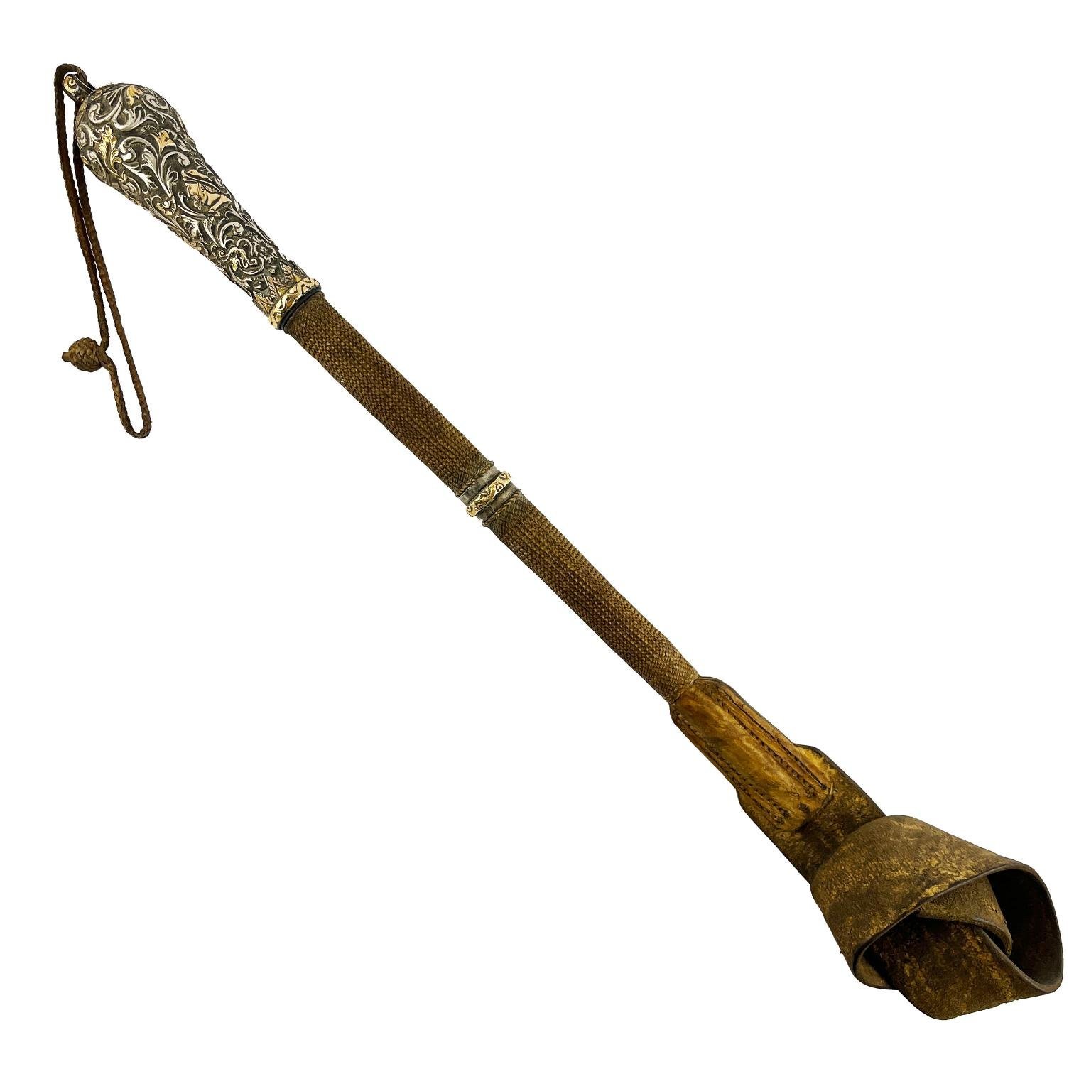Rebenque forrado en fino cuero trenzado, con pasador en plata y oro cincelado «hojas y flores», cabo en plata y oro cincelado «hojas, flores y cabeza de gaucho» y cartela con iniciales «H.U.B.», y manija en fino cuero trenzado.