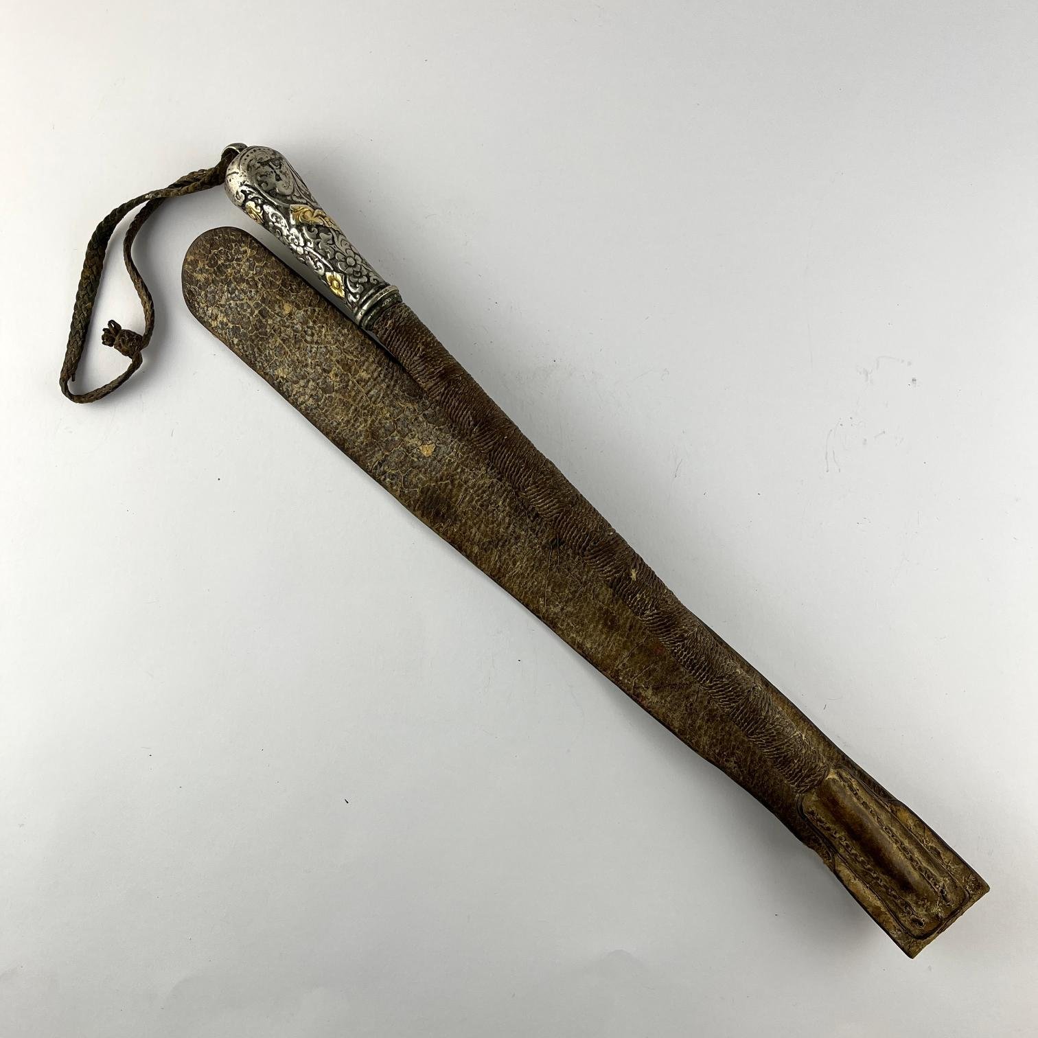 Rebenque forrado en fino cuero trenzado, con empuñadura en plata y oro cincelada «hojas y flores».