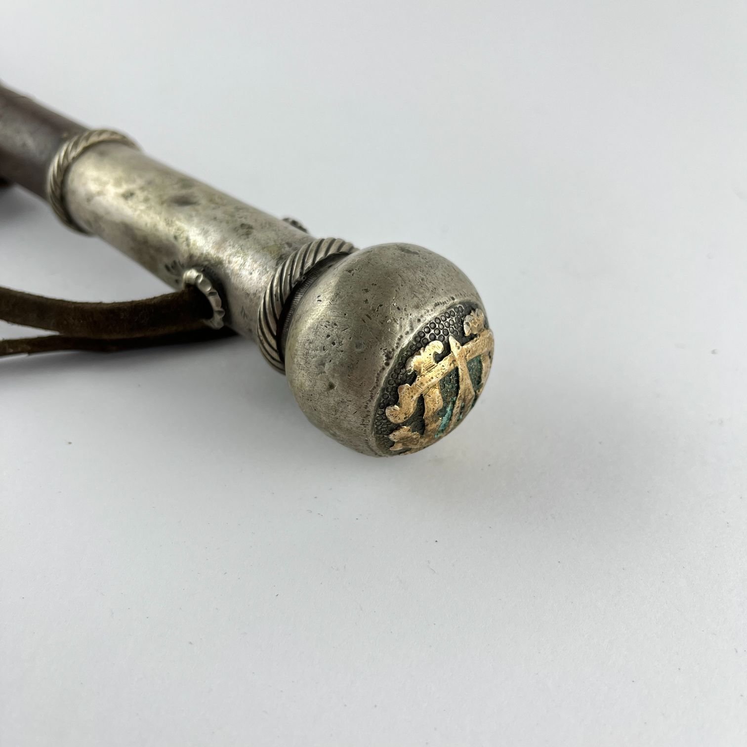 Rebenque forrado en cuero marrón con cabo en plata lisa con iniciales «M.C.» en oro.