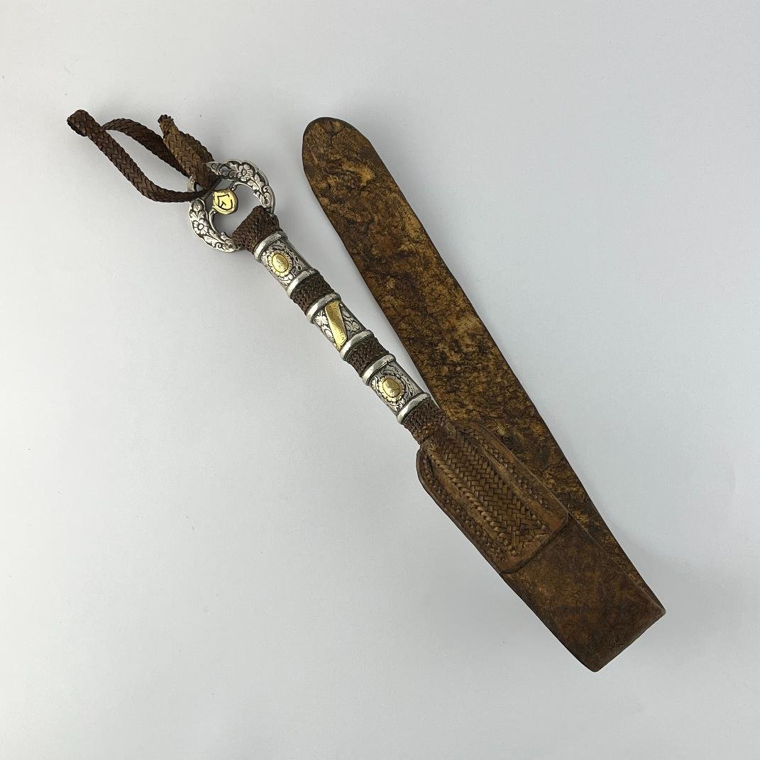 Rebenque de argolla forrado en cuero trenzado con tres pasadores en plata y oro cincelados «hojas y flores», uno de ellos con inscripción «Semana Criolla de Montevideo 1928», correspondiente al premio otorgado en dicha exposición. Argolla en plata calada y cincelada «hojas y flores», con cartelas en oro grabadas «marca de estancia» y asa en cuero trenzado.