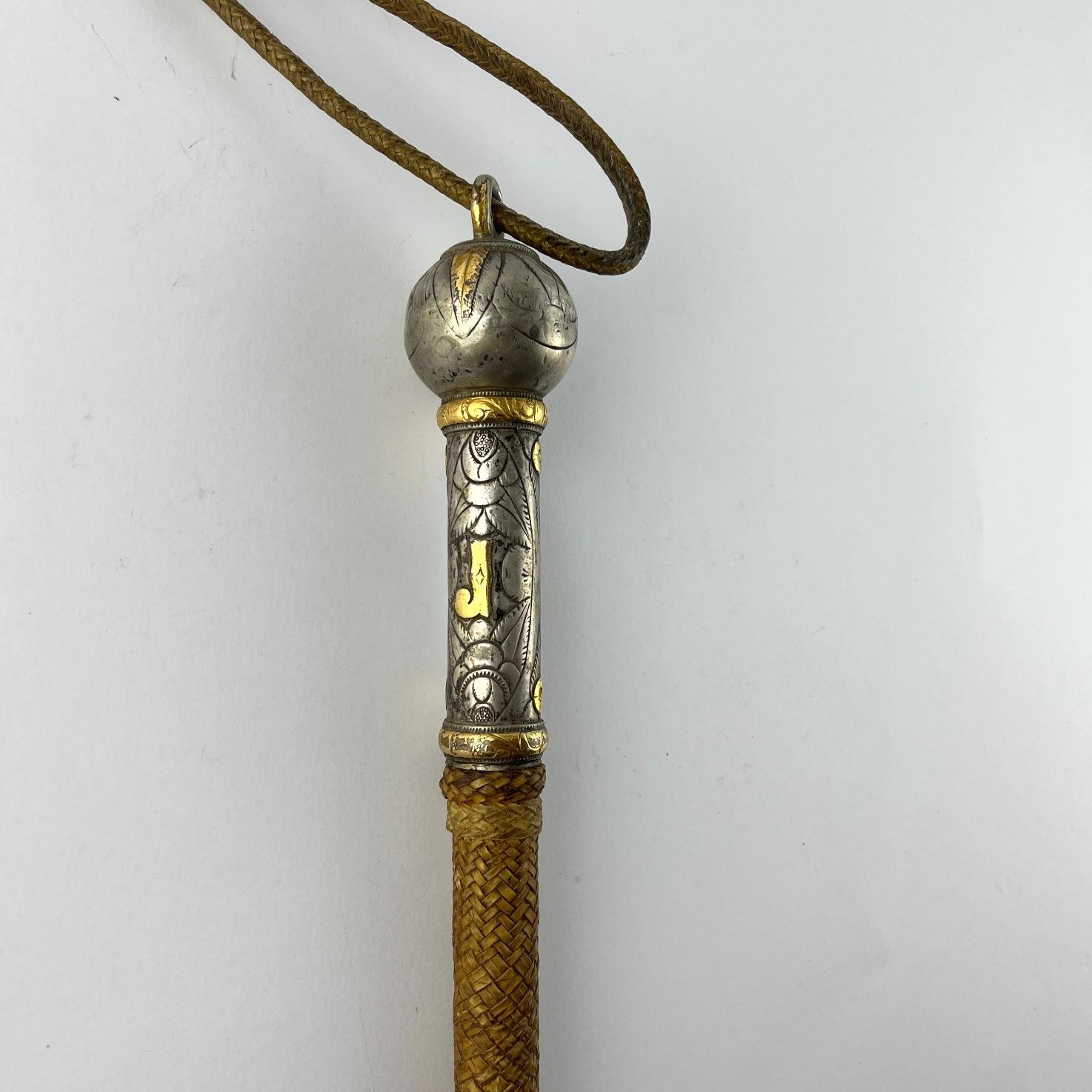 Rebenque forrado en fino cuero trenzado con cabo en plata y oro cincelado «hojas y flores», con iniciales «J.S.» en oro.