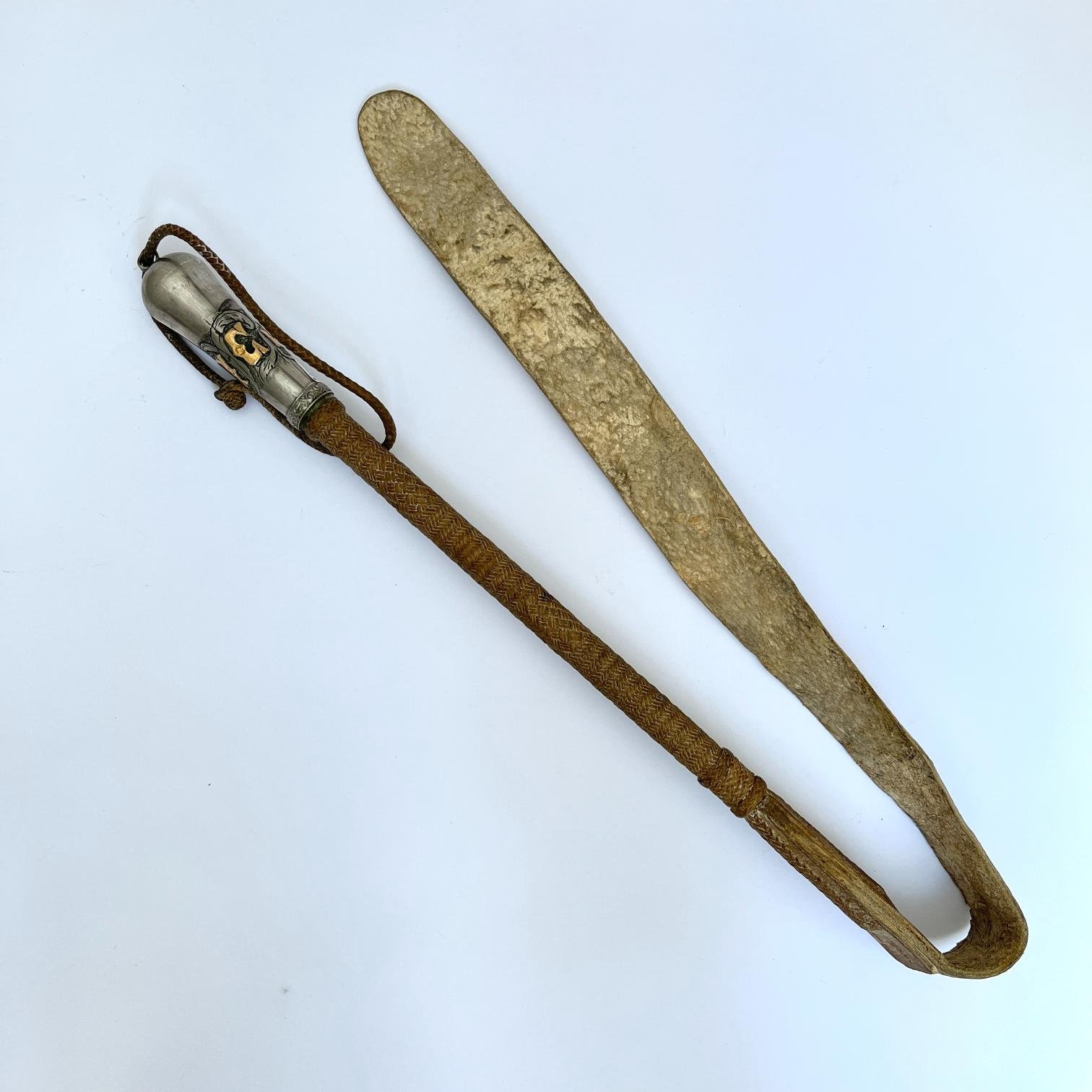 Rebenque forrado en fino cuero trenzado con cabo en plata cincelado «hojas y flores» e iniciales «J.A.V.C.» en oro, con punzón del platero Edelmiro Suárez, Sarandí del Yi.