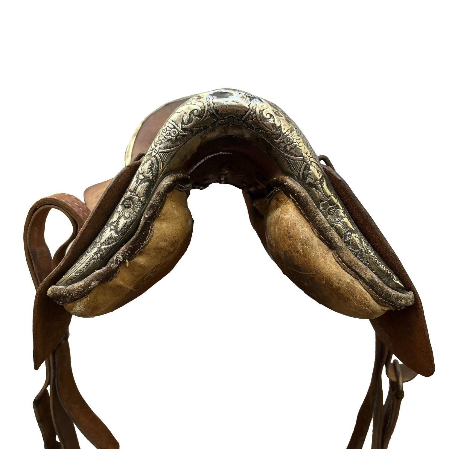 Recado tipo cola de pato en cuero marrón repujado, con cabezada en plata cincelada «hojas y flores» y cola en plata lisa. Estriberas en suela marrón con estribos tipo ingleses en hierro forjado. Acompañado por freno en hierro forjado con cabezada y riendas en cuero crudo con treinta y dos pasadores en plata lisa.