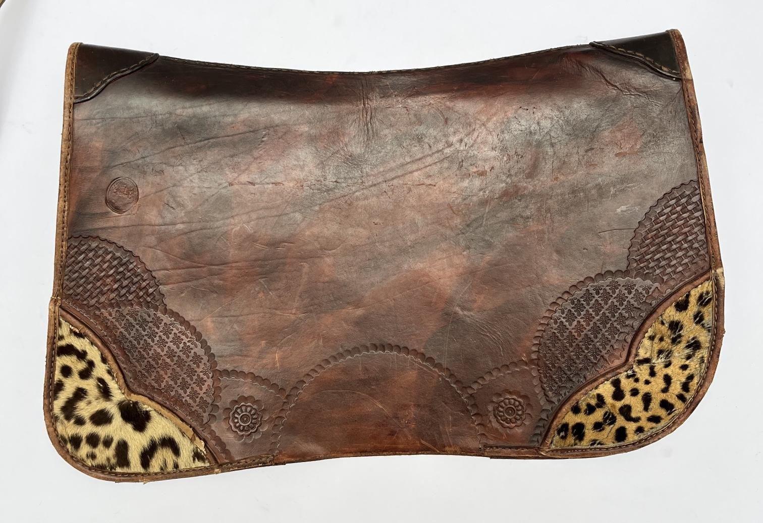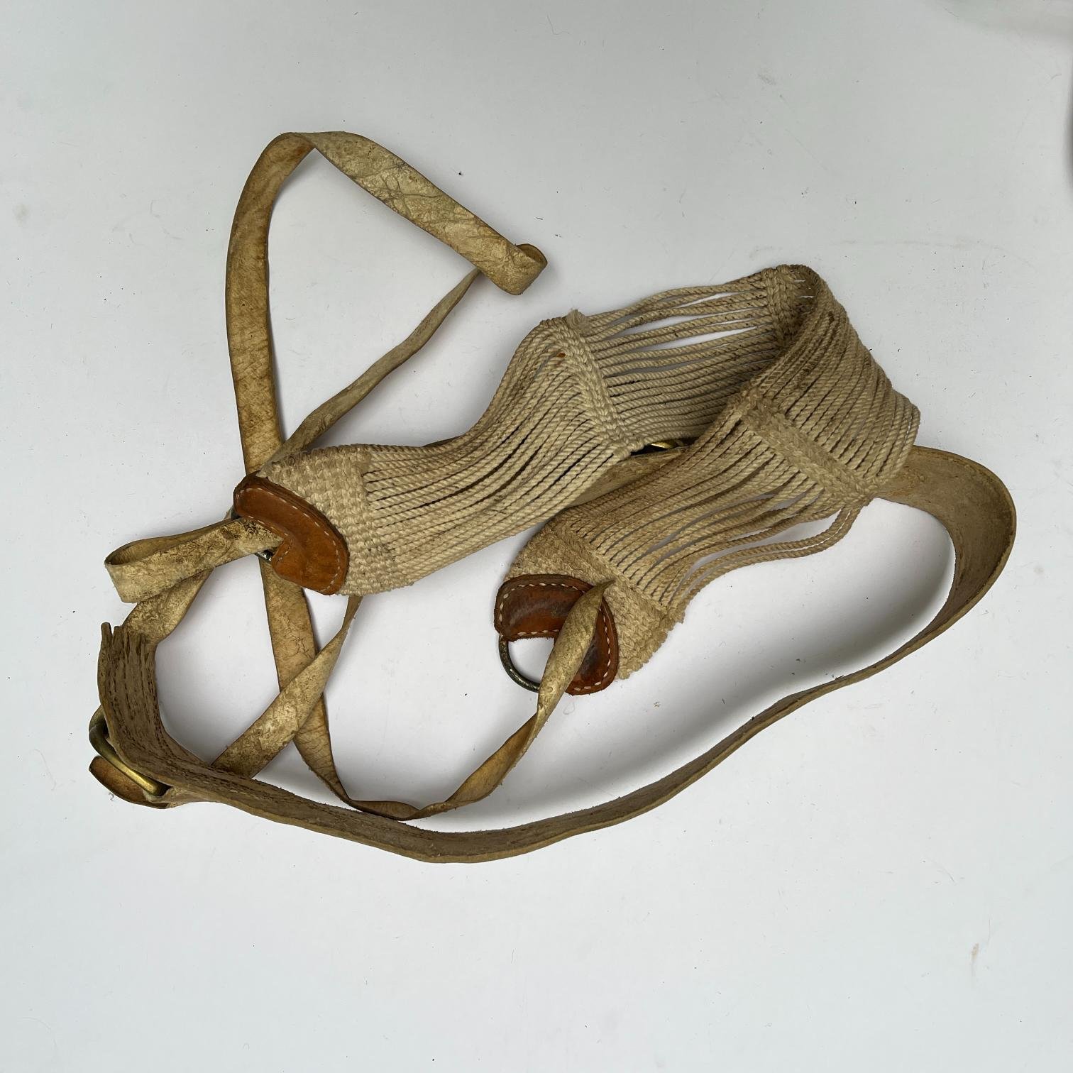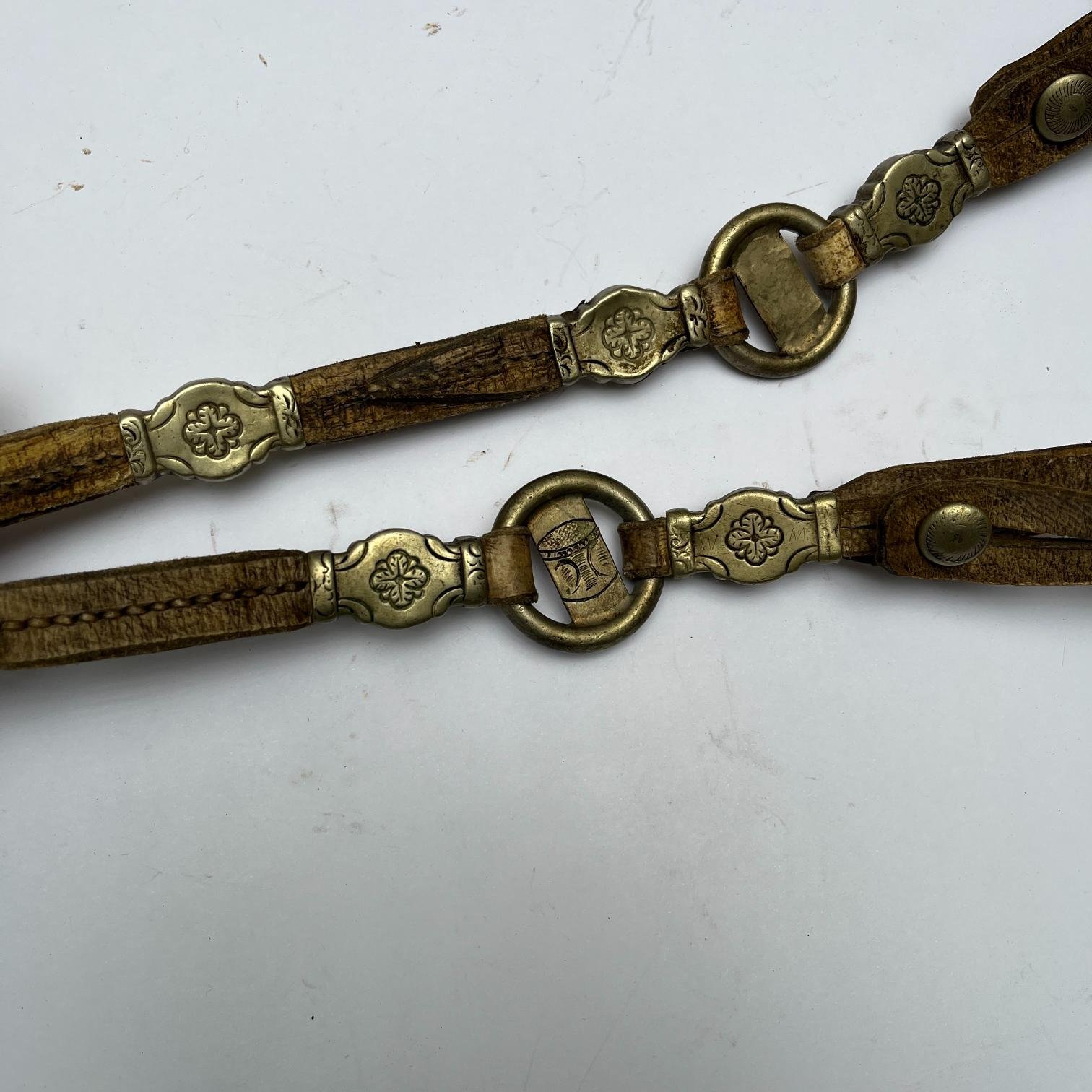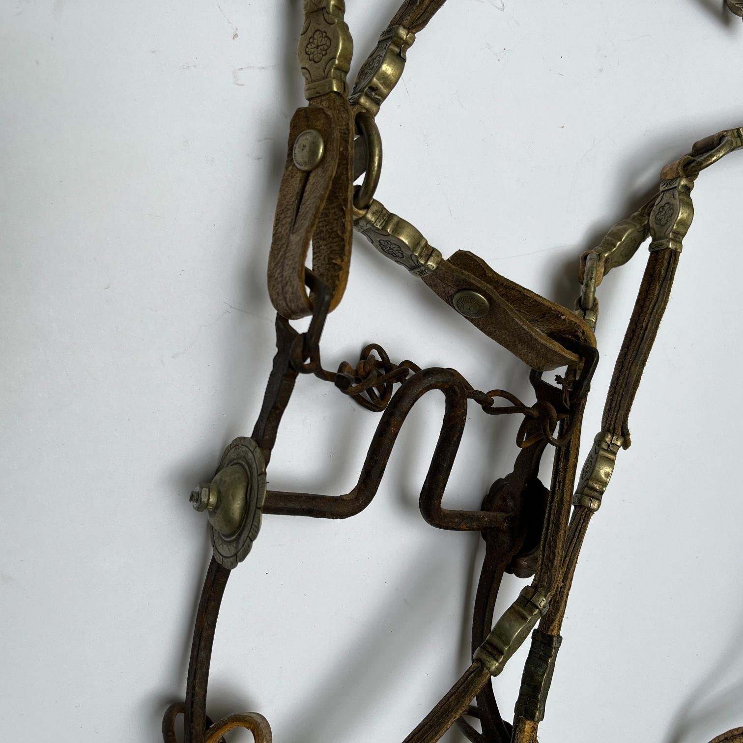 Recado completo. Compuesto por: recado tipo cola de pato en cuero marrón repujado «flores», con marca de estancia, con cabezada en plata cincelada «hojas y flores» (con punzón del platero Podestá); estriberas en suela marrón con pasadores chatos en plata y par de estribos tipo campana en metal, decorados «leones»; freno en hierro forjado, con copas en metal «Sol» (de un diámetro de 5 cm), con par de riendas y cabezadas en cuero crudo, con veinticuatro pasadores en metal decorado «flores»; baticola en cuero crudo, con medallón central en metal «Sol» y once pequeños pasadores; carona en suela marrón, con punteras en piel de yaguareté, con dos cinchas en lonja de yegua, trenzadas, y sobrecincha en cuero crudo; manea en cuero crudo, con dos pasadores en plata y oro y argolla en metal «Sol».