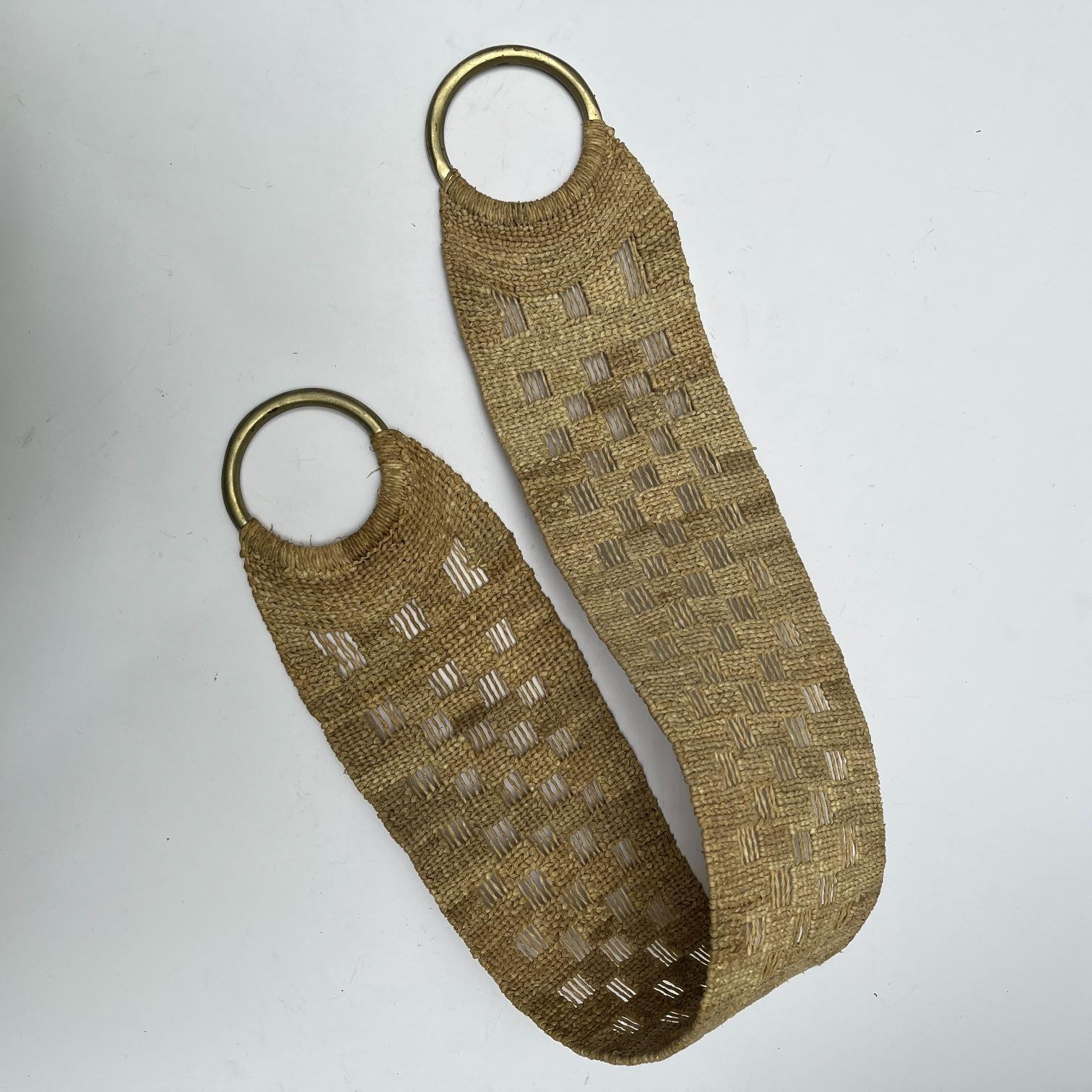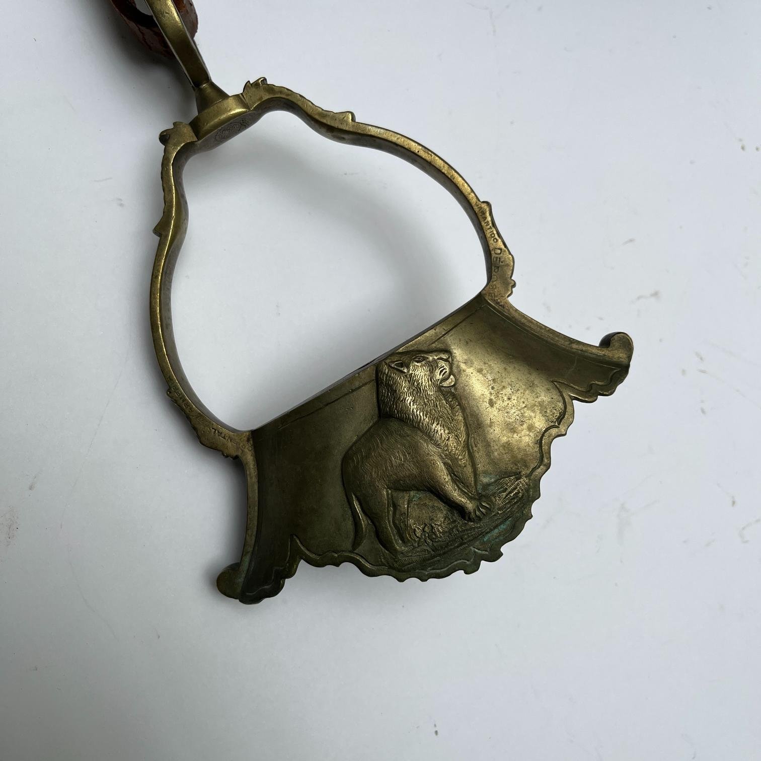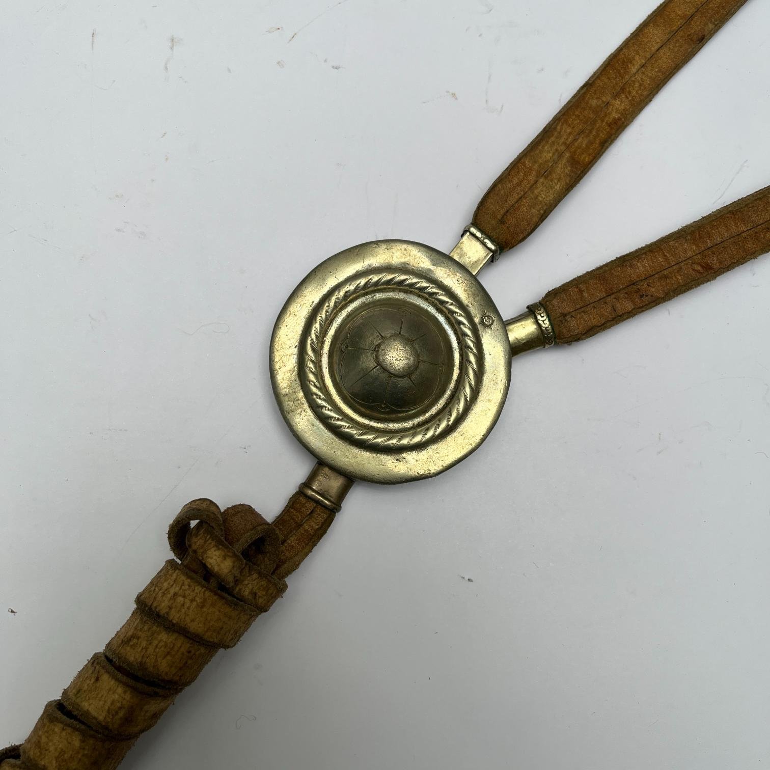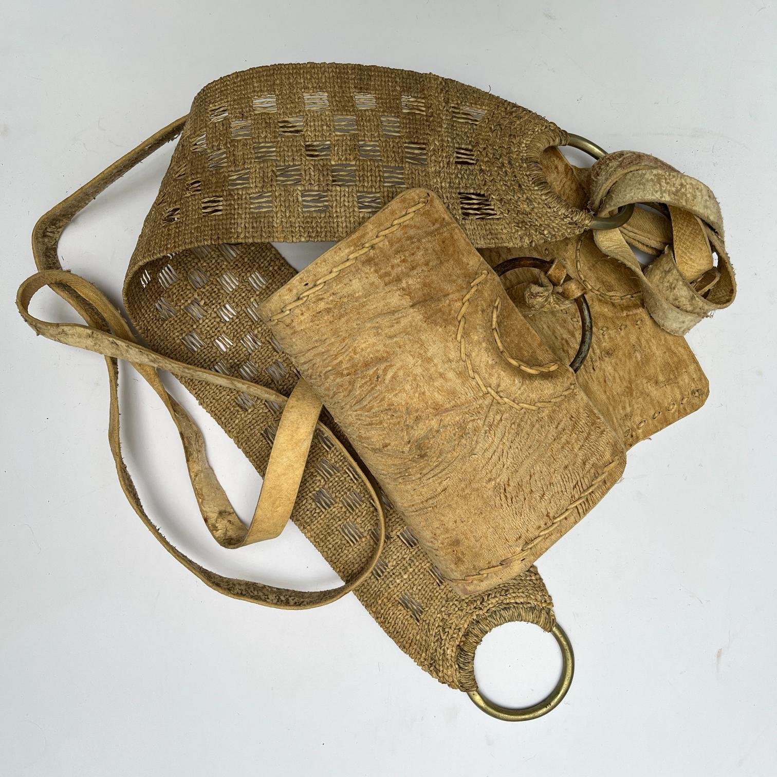 Recado completo. Compuesto por: recado tipo cola de pato en cuero marrón repujado «flores», con marca de estancia, con cabezada en plata cincelada «hojas y flores» (con punzón del platero Podestá); estriberas en suela marrón con pasadores chatos en plata y par de estribos tipo campana en metal, decorados «leones»; freno en hierro forjado, con copas en metal «Sol» (de un diámetro de 5 cm), con par de riendas y cabezadas en cuero crudo, con veinticuatro pasadores en metal decorado «flores»; baticola en cuero crudo, con medallón central en metal «Sol» y once pequeños pasadores; carona en suela marrón, con punteras en piel de yaguareté, con dos cinchas en lonja de yegua, trenzadas, y sobrecincha en cuero crudo; manea en cuero crudo, con dos pasadores en plata y oro y argolla en metal «Sol».