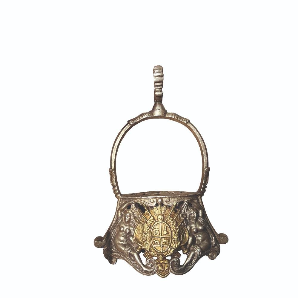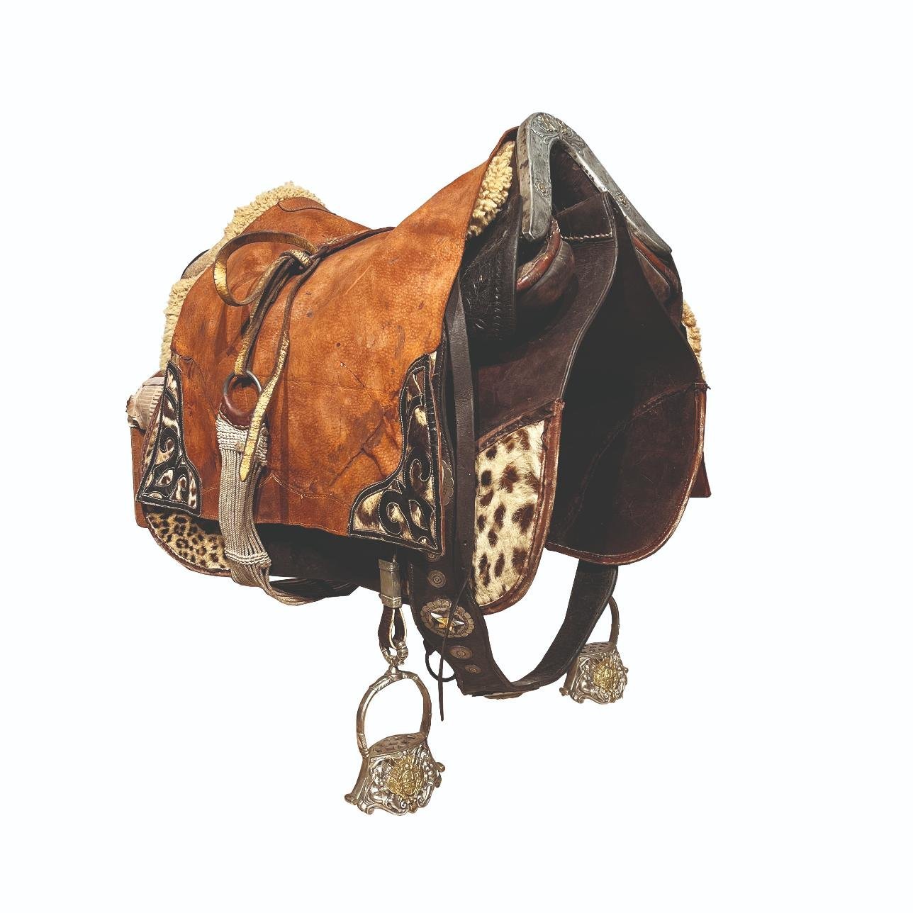 Recado completo tipo sirigote en cuero negro repujado «hojas y flores», con cabezadas en plata y oro cinceladas «hojas y flores», con punzón del platero Alipio Suárez e iniciales «R.S.» en oro. Estriberas en cuero marrón decorado con fino cuero trenzado. Par de estribos tipo campana en metal decorado «desnudos femeninos» y “escudos de armas uruguayos antiguos» en bronce, con par de pasadores chatos en metal «Sol» de Broqua & Scholberg. Carona en suela marrón, con punteras en cuero de yaguareté. Freno en hierro forjado con copas en plata y oro cinceladas «hojas y flores» (falta una), cabezas y riendas en cuero crudo, con doce pasadores en plata y oro cincelados «flor», cuatro botones en plata y oro cincelados «flor» y medallón de freno en metal estampado «Sol». Cincha y sobrecincha en hilo trenzado y badana en cuero de carpincho con punteras en piel de yaguareté. Pechera en cuero negro, decorada con cinco medallones en plata y oro decorados «estrella» y trece monedas imperiales brasileñas con «flor» estampada en oro.