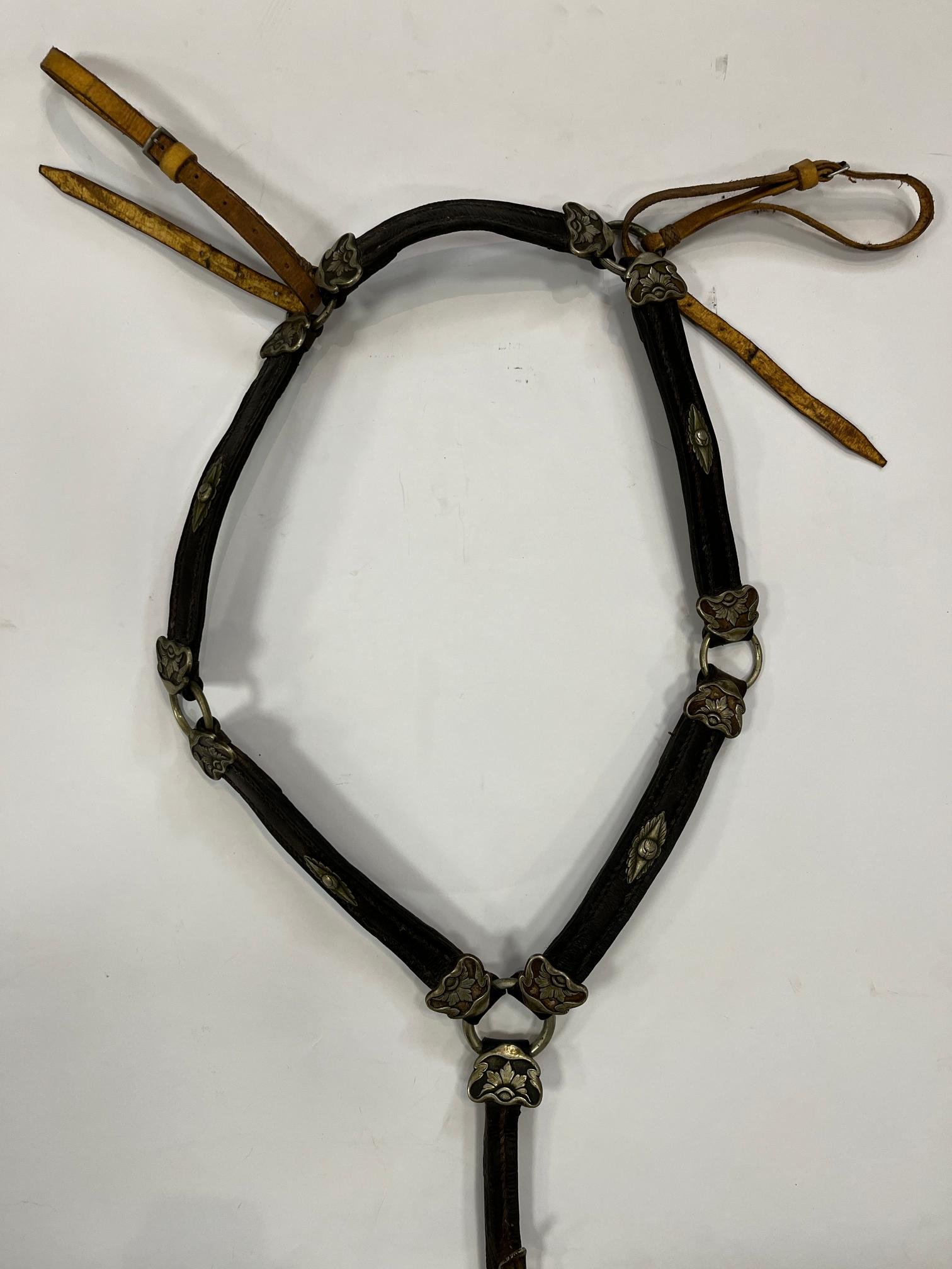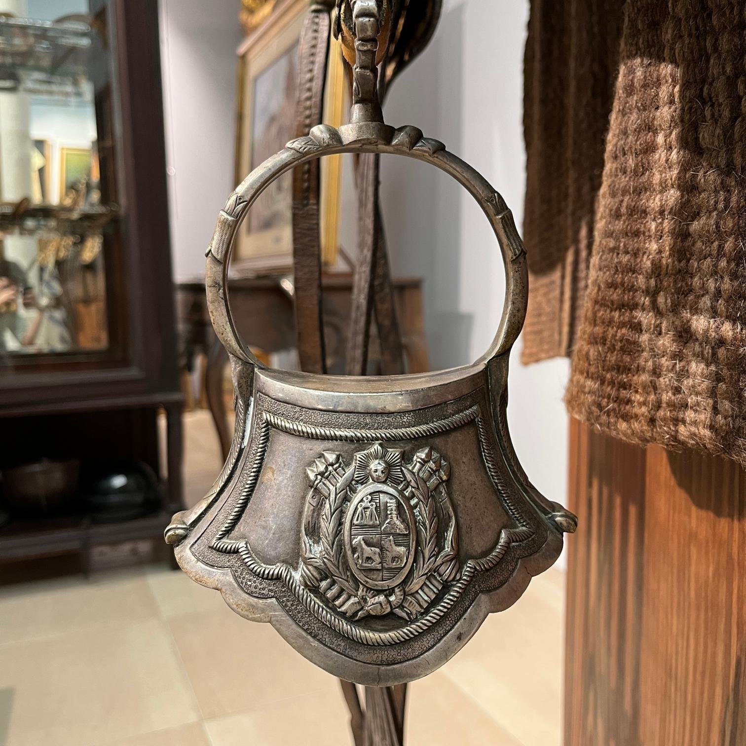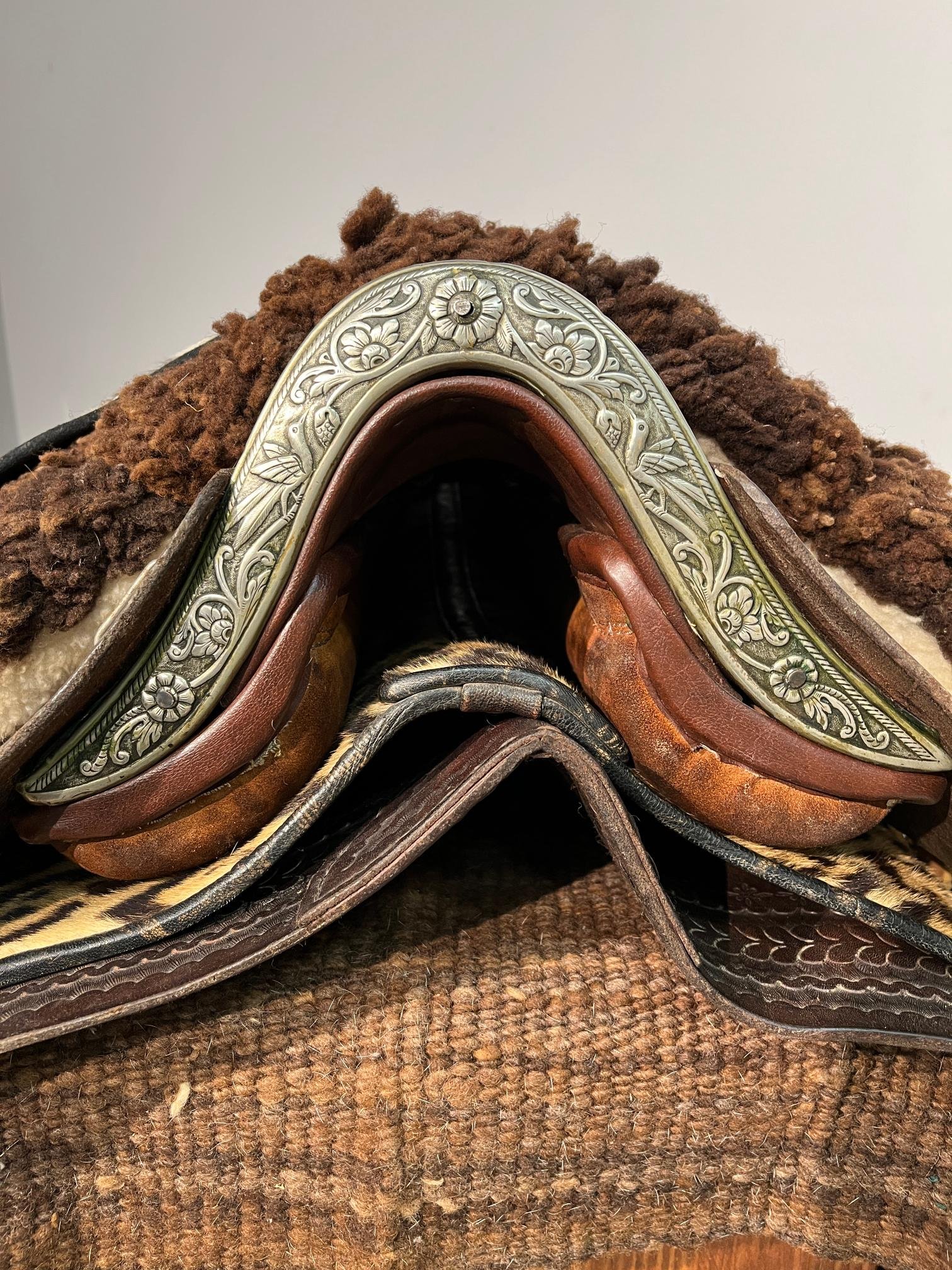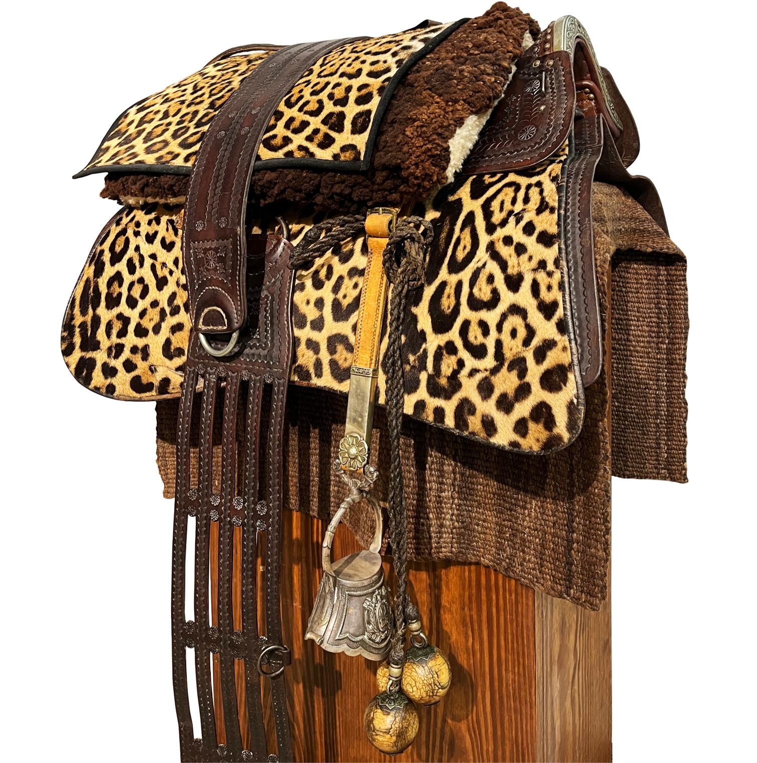 Recado completo compuesto por: sirigote en cuero marrón repujado «hojas y flores», con cabezadas en metal blanco decorado «aves y flores», selladas «Sol» de Broqua & Scholberg, Montevideo; par de estriberas en cuero crudo, con pasadores en metal decorado «flores» y estribos en metal decorado «escudo de armas uruguayo antiguo»; freno en hierro forjado, con patas en metal «Sol» de Broqua & Scholberg decorados «indias aladas», con cabezada de freno y riendas en cuero crudo con argollas, pasadores y bombas en metal «Sol»; bozal en cuero crudo, con pasadores chatos y argollas en metal; pechera en cuero crudo, con pasadores decorados «flores»; baticola en cuero crudo, con pasadores chatos y medallón central en metal decorado «flor»; par de espuelines en metal sellados «Sol» y decorados «flores», con rodajas en hierro; juego de tres boleadoras en marfil, con tientos en cuero crudo trenzado; jergón en lana marrón; carona en suela marrón repujada, correspondiente a la decoración del sirigote; carona forrada en piel de yaguareté; cincha en suela repujada, correspondiente a la decoración del sirigote, con encimera en cuero crudo y argollas en bronce; cojinillo en lana negra y lana blanca; sobrepuesto en piel de yaguareté forrado en terciopelo negro; sobrecincha en cuero marrón repujado, correspondiente la decoración del sirigote, con argollas en metal.