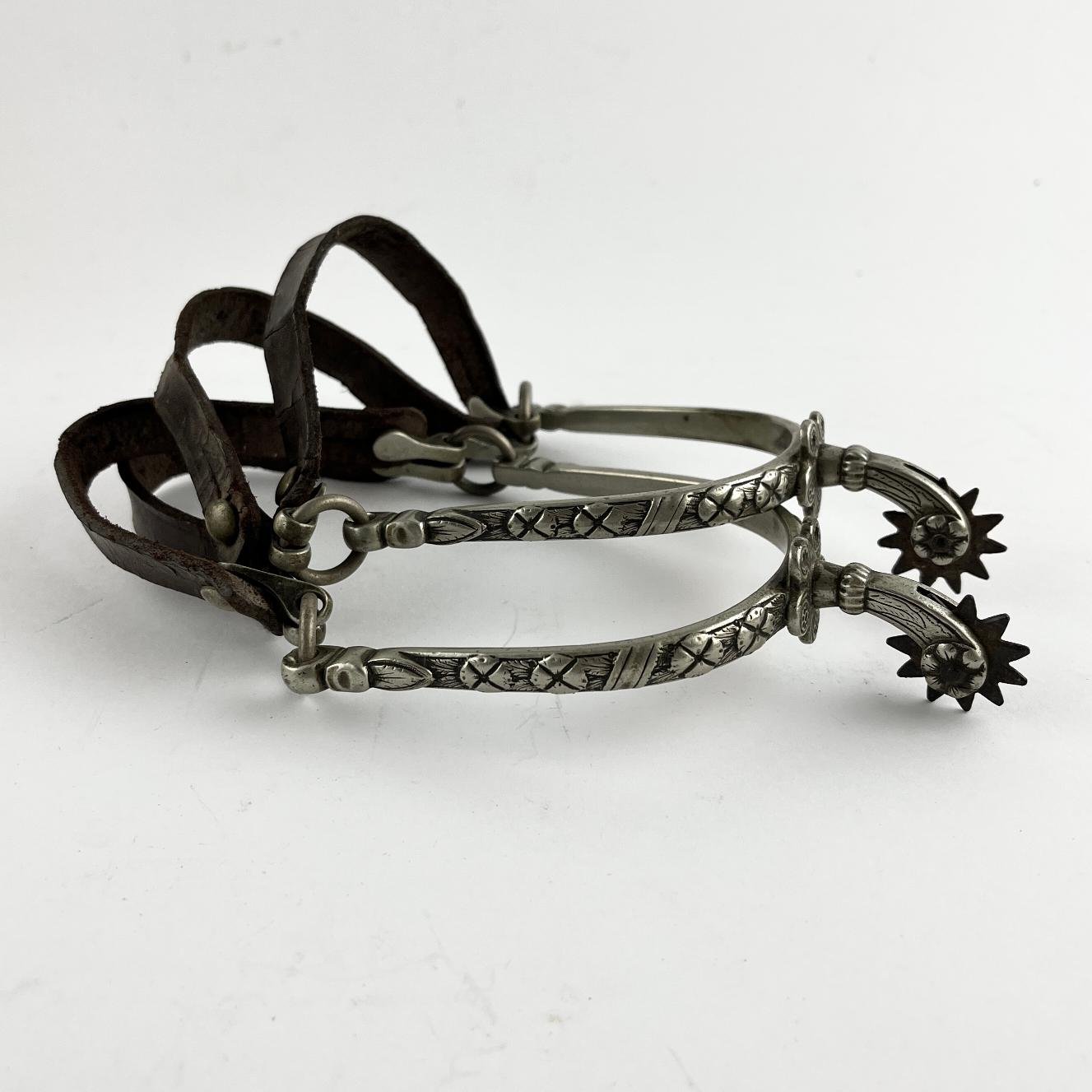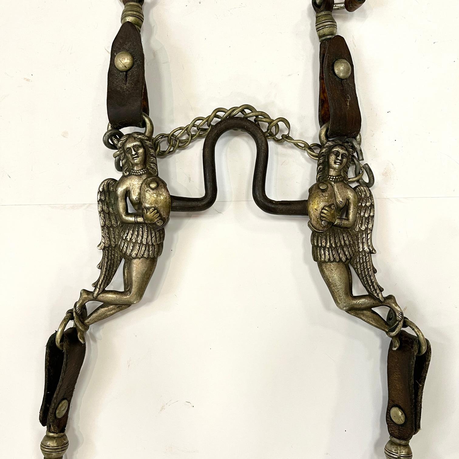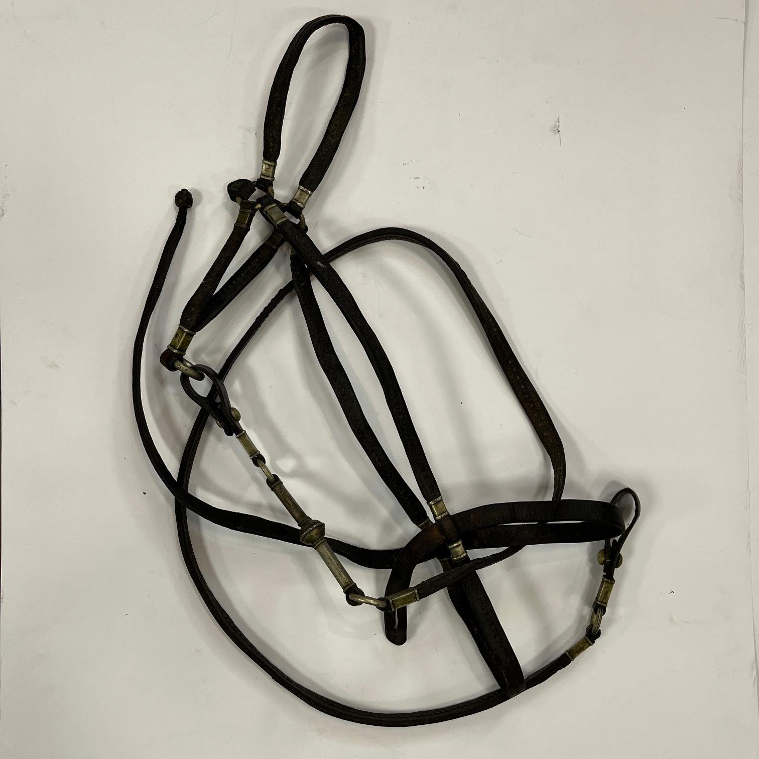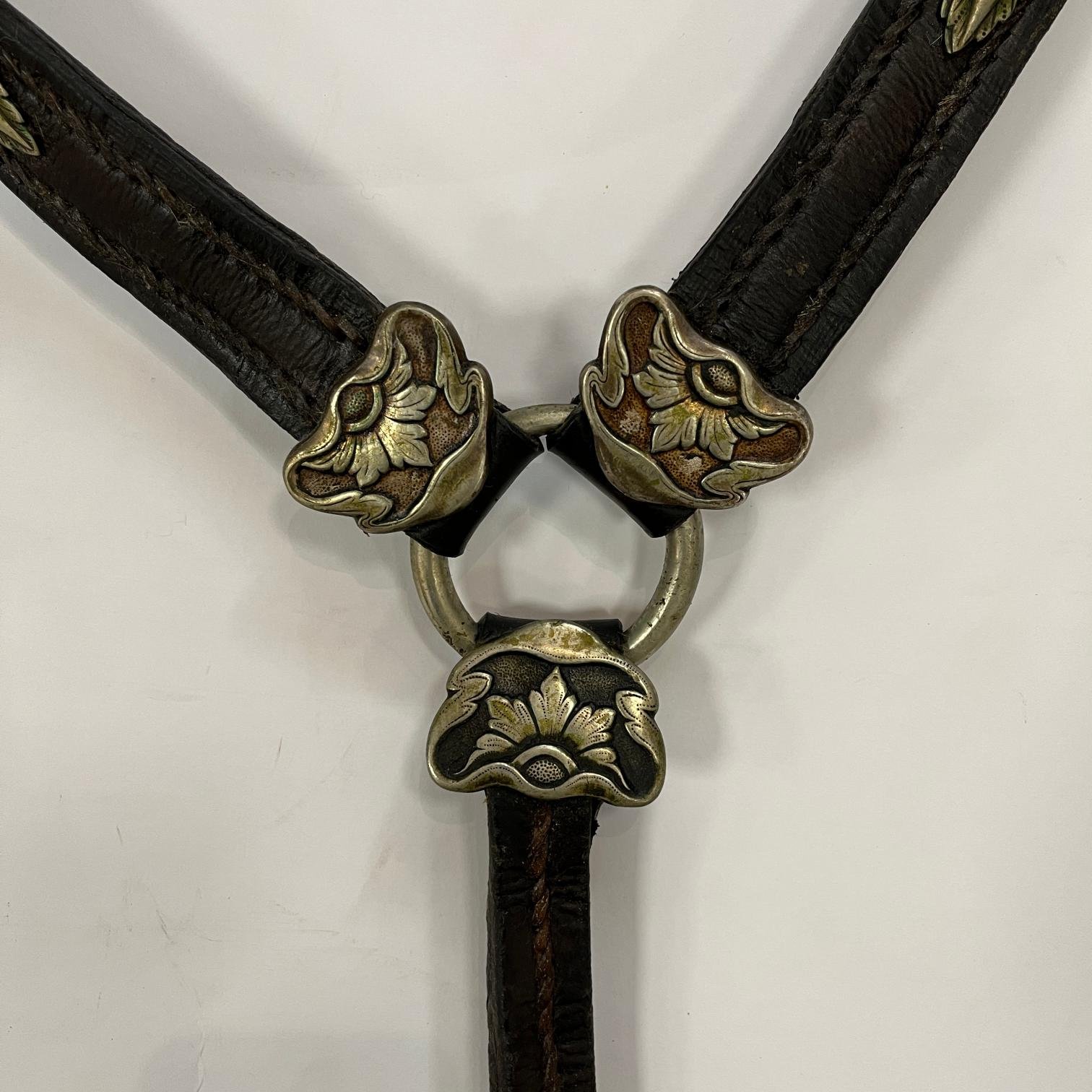 Recado completo compuesto por: sirigote en cuero marrón repujado «hojas y flores», con cabezadas en metal blanco decorado «aves y flores», selladas «Sol» de Broqua & Scholberg, Montevideo; par de estriberas en cuero crudo, con pasadores en metal decorado «flores» y estribos en metal decorado «escudo de armas uruguayo antiguo»; freno en hierro forjado, con patas en metal «Sol» de Broqua & Scholberg decorados «indias aladas», con cabezada de freno y riendas en cuero crudo con argollas, pasadores y bombas en metal «Sol»; bozal en cuero crudo, con pasadores chatos y argollas en metal; pechera en cuero crudo, con pasadores decorados «flores»; baticola en cuero crudo, con pasadores chatos y medallón central en metal decorado «flor»; par de espuelines en metal sellados «Sol» y decorados «flores», con rodajas en hierro; juego de tres boleadoras en marfil, con tientos en cuero crudo trenzado; jergón en lana marrón; carona en suela marrón repujada, correspondiente a la decoración del sirigote; carona forrada en piel de yaguareté; cincha en suela repujada, correspondiente a la decoración del sirigote, con encimera en cuero crudo y argollas en bronce; cojinillo en lana negra y lana blanca; sobrepuesto en piel de yaguareté forrado en terciopelo negro; sobrecincha en cuero marrón repujado, correspondiente la decoración del sirigote, con argollas en metal.