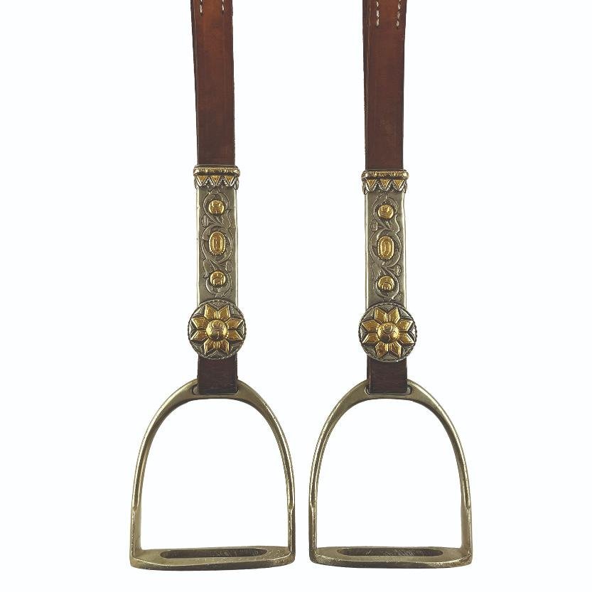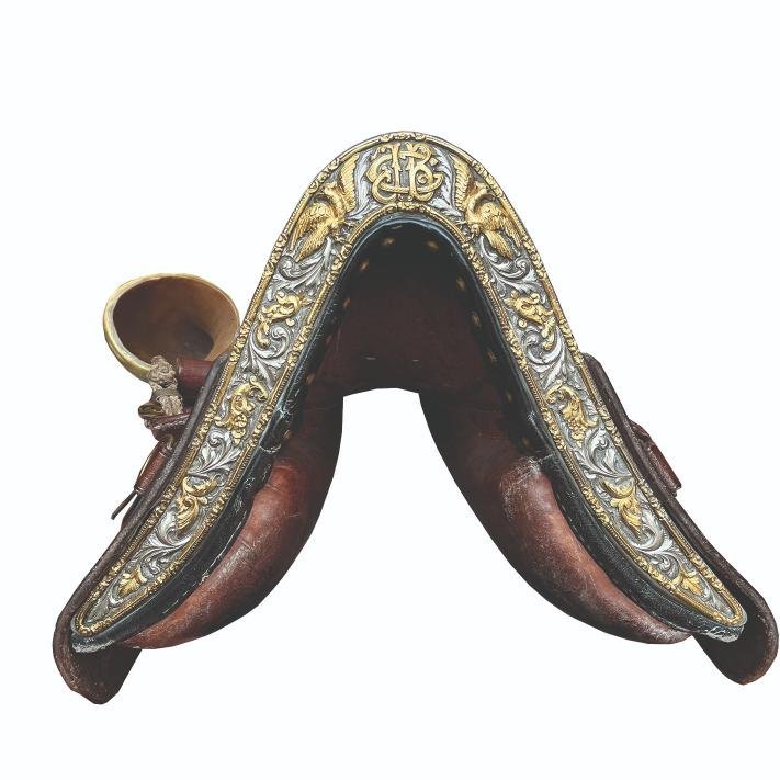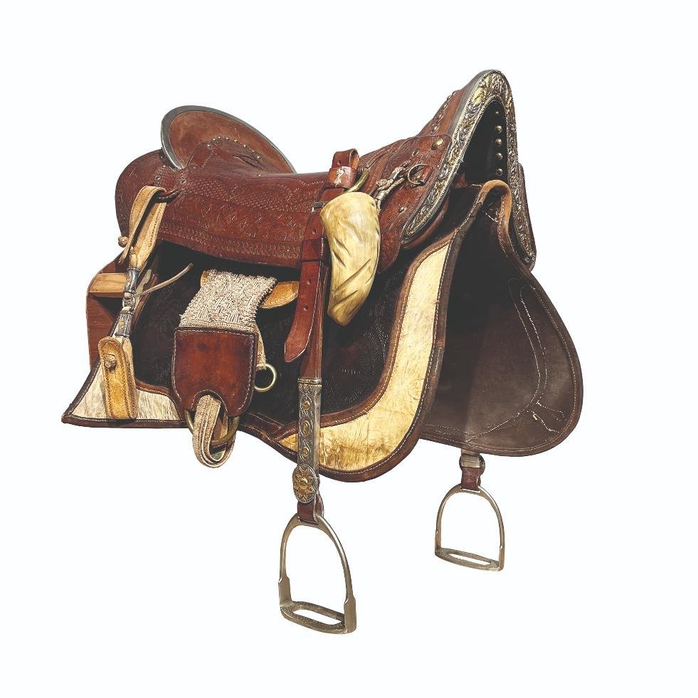 Importante recado tipo cola de pato en cuero marrón repujado «flores y arabescos», con cabezada frontal en plata y oro cincelada «águilas, hojas y flores», con iniciales «J.G.B.» en oro. Cola de pato con cabezada en plata lisa. Recado marcado por la talabartería Casa Ananía, Montevideo. Acompañado por par de estriberas en suela marrón con par de pasadores chatos en plata y oro cincelados «hojas, flores y estrella federal», con punzón del platero Cheroni, de un largo de 16 cm; par de estribos tipo ingleses en metal blanco; manea en cuero crudo decorado con fino cuero trenzado; dos pasadores en plata y oro cincelados «flor»; argolla en plata y oro calada y cincelada «flor»; vaso tropero en guampa tallada, con asa en cuero trenzado; carona en marrón oscuro repujado, con punteras en cuero crudo; sobrepuesto en gamuza marrón; sobrecincha en gamuza marrón; cincha en cuero crudo; sobrecincha en hilo trenzado, con argollas en metal.