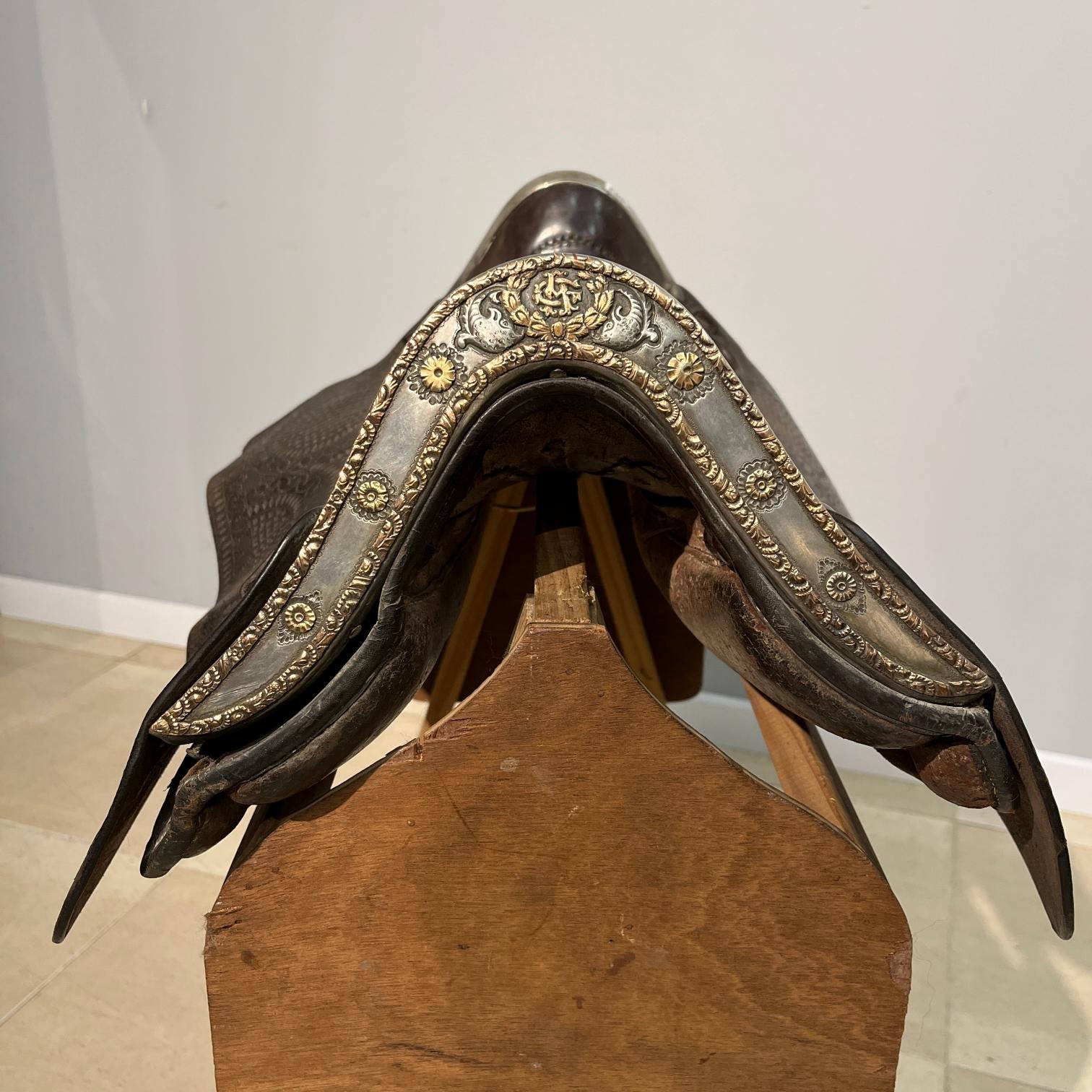 Recado tipo sirigote en cuero marrón repujado con cabezadas en plata y oro cinceladas «hojas, flores y delfines» e iniciales «A.G.», con punzón del platero Risso.