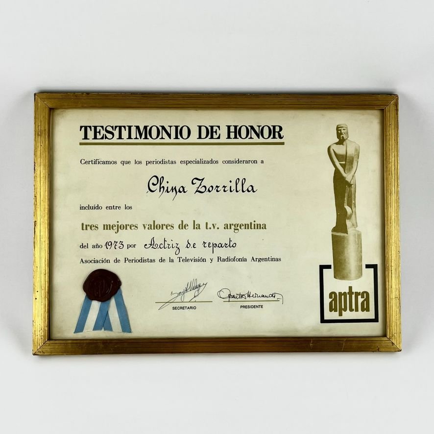 Reconocimiento otorgado por APTRA. “Testimonio de Honor. Certificamos que los periodistas especializados consideraron a China Zorrilla incluido entre los tres mejores valores de la T.V. argentina del año 1973 por Actriz de reparto.” Papel impreso y manuscrito, con firmas y sello de lacre. Enmarcado 25 x 35 cm.