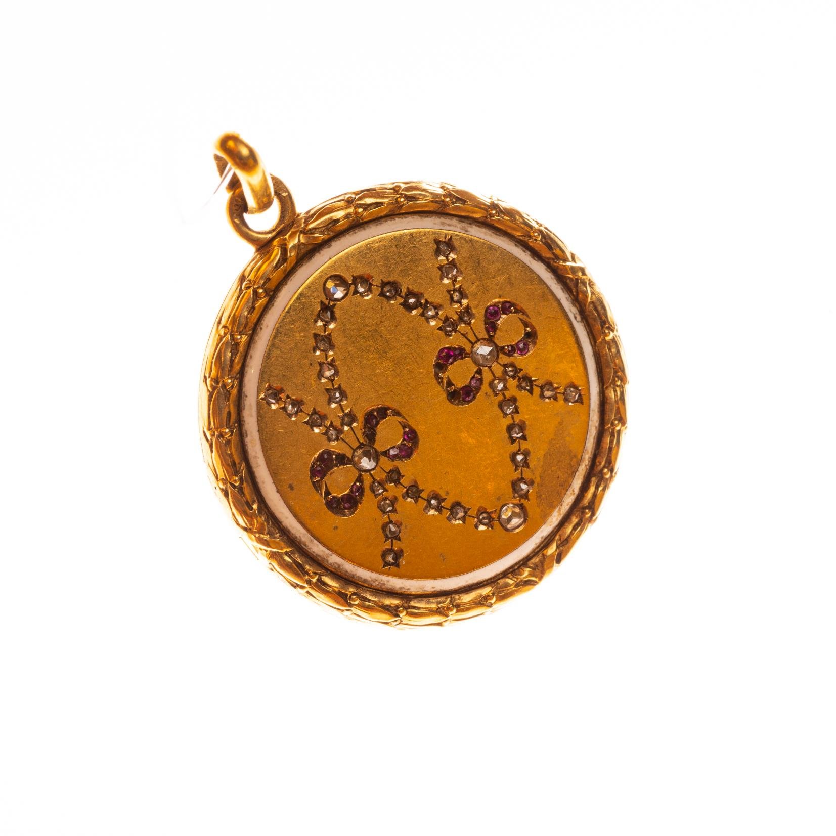 Relicario en oro 18 K amarillo con detalles en esmalte blanco, decorado «moños» en rubíes y diamantes. Diámetro 33 mm. Peso bruto 21,2 gr.