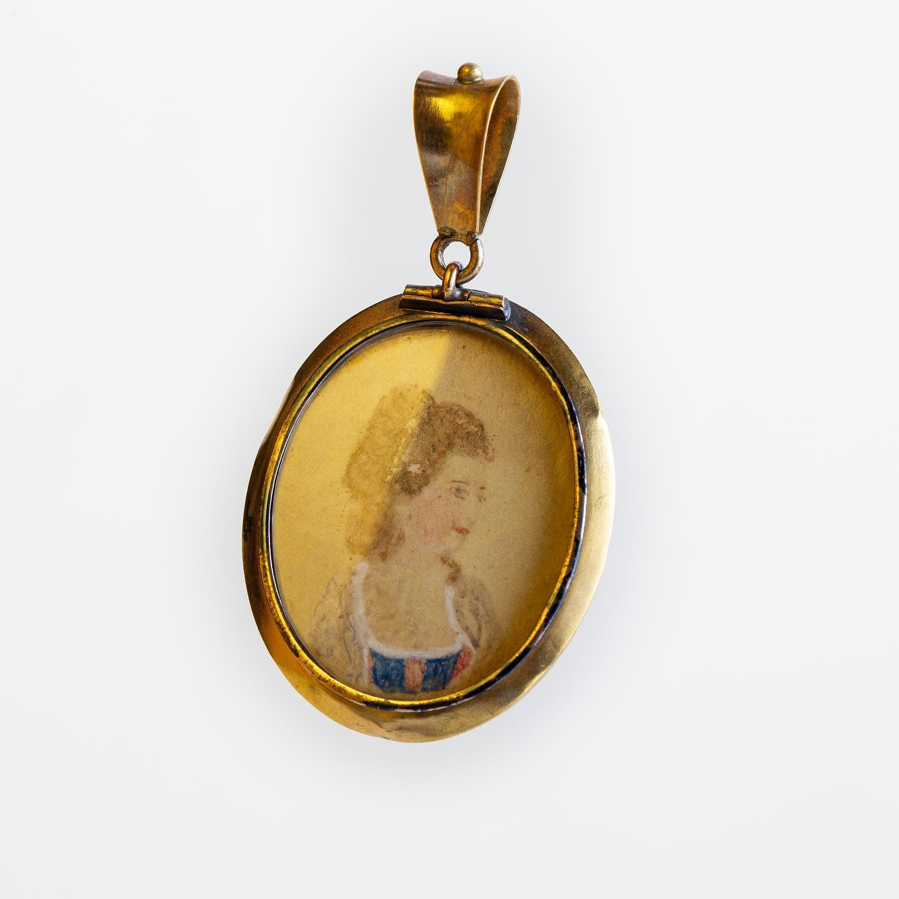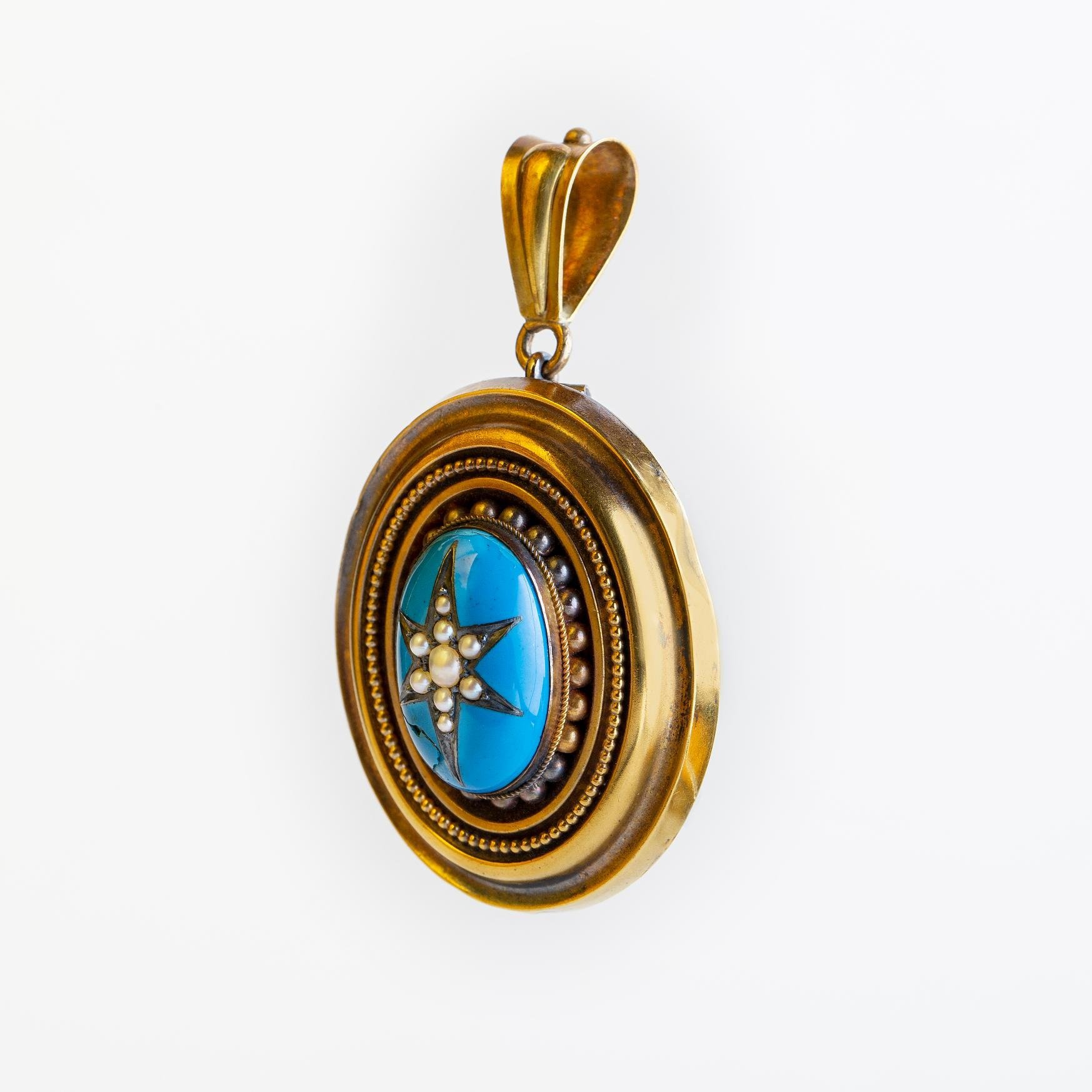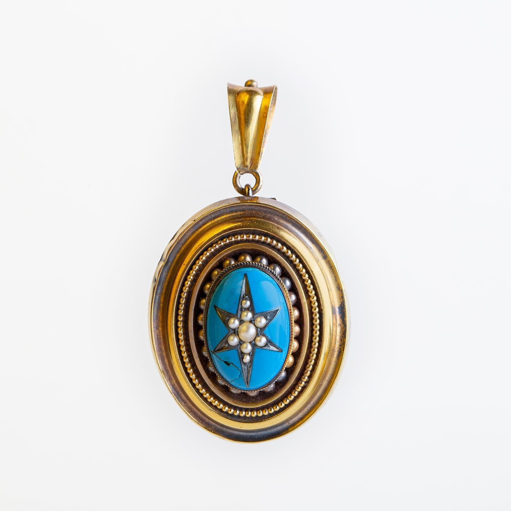 Relicario en oro amarillo y plata con óvalo central en esmalte azul, decorado “estrella” con nueve pequeñas perlas naturales. Al dorso miniatura anónima oval pintada en acuarela sobre papel. «Joven dama.» 6 x 3.2 cm.