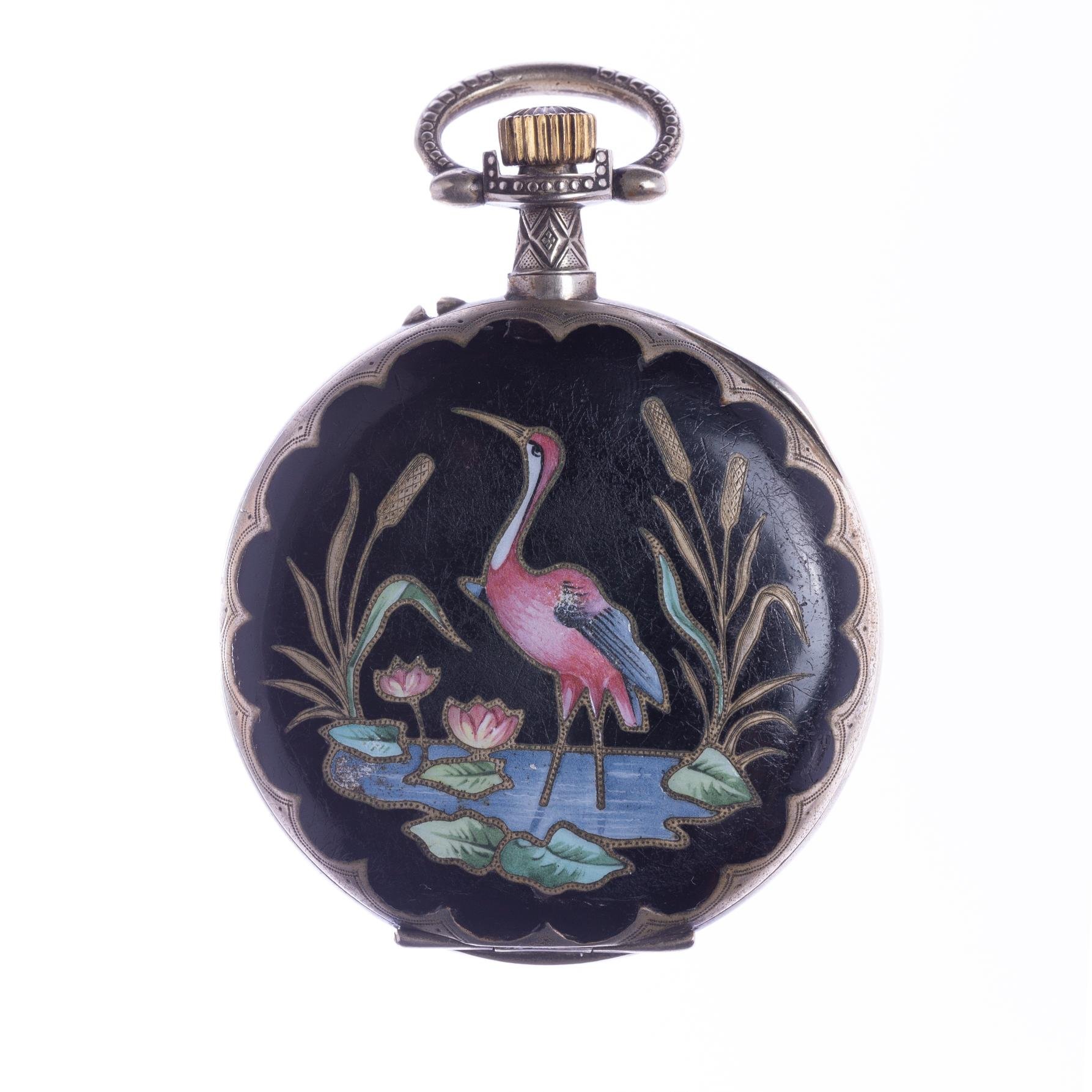 Reloj de bolsillo art decó. Esfera color blanco, restaurada. Caja en metal decorada en esmalte «garza, hojas y flores». Diámetro 68 mm. Funcionando.
