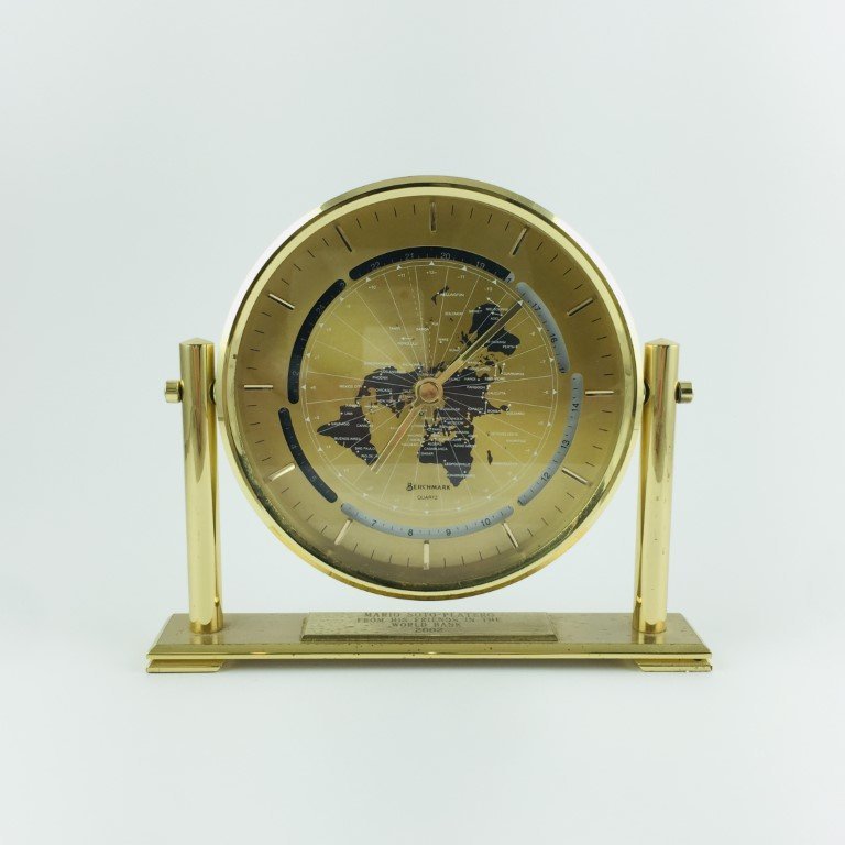 Reloj de sobremesa, cuarzo, fabricado por Berchmark. Caja en bronce. Esfera pintada en esmalte. No funciona. 17 x 20 cm.