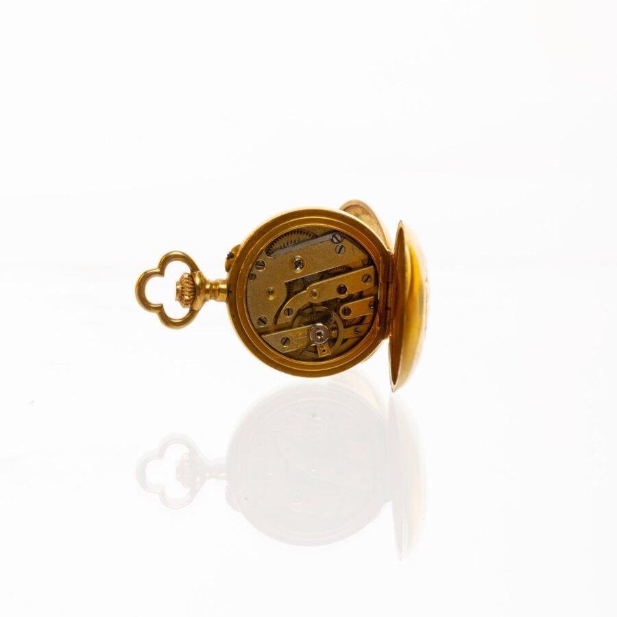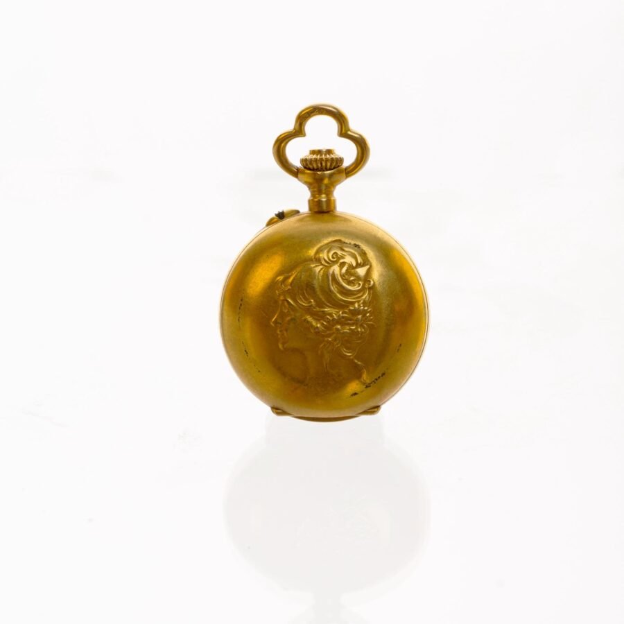 Reloj broche art nouveau. Esfera color blanco, con números arábigos. Caja en oro 18 K amarillo, con tapas decoradas «damas». Diámetro de caja 20 mm. No funciona. Vidrio averiado. Peso bruto 12,3 gr.