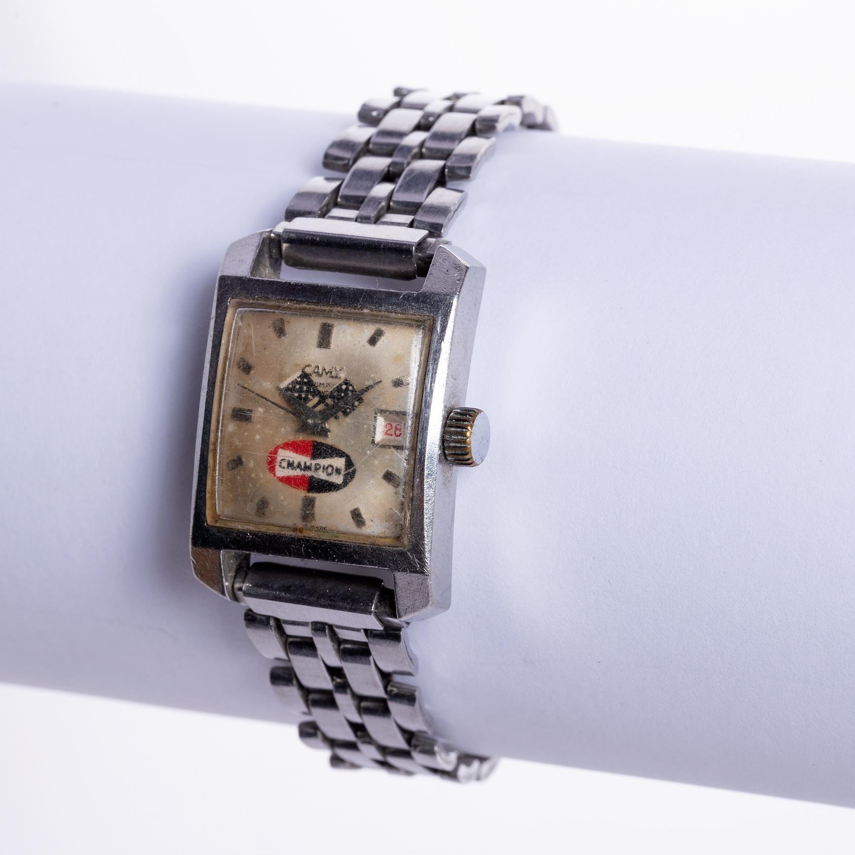 Reloj pulsera marca Camy, modelo realizado para Champion, a cuerda manual. Caja cuadrada. Esfera color plateado, decorada con publicidad de la marca, con calendario. Caja y malla en acero. Funcionando.