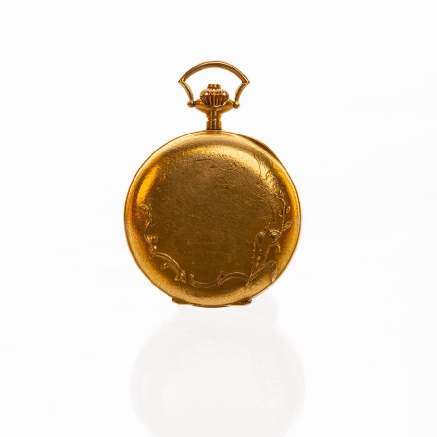 Reloj de châtelaine suizo art nouevau. Esfera color blanco con números arábigos. Caja en oro 18 K amarillo, de tres tapas, decorado «efigie de dama». Diámetro 32 mm. Peso bruto 29 gr. Funcionando.