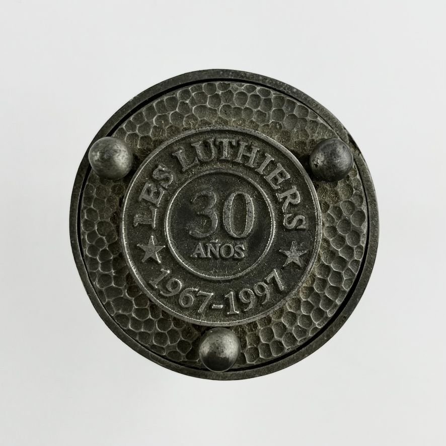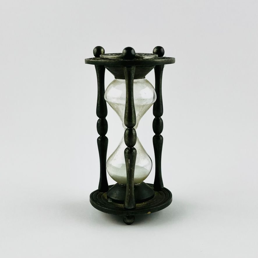 Reloj de arena en peltre con depósito de vidrio. Realizado en homenaje a los treinta años de Les Luthiers, 1967-1997. 12 x 6.5 cm.