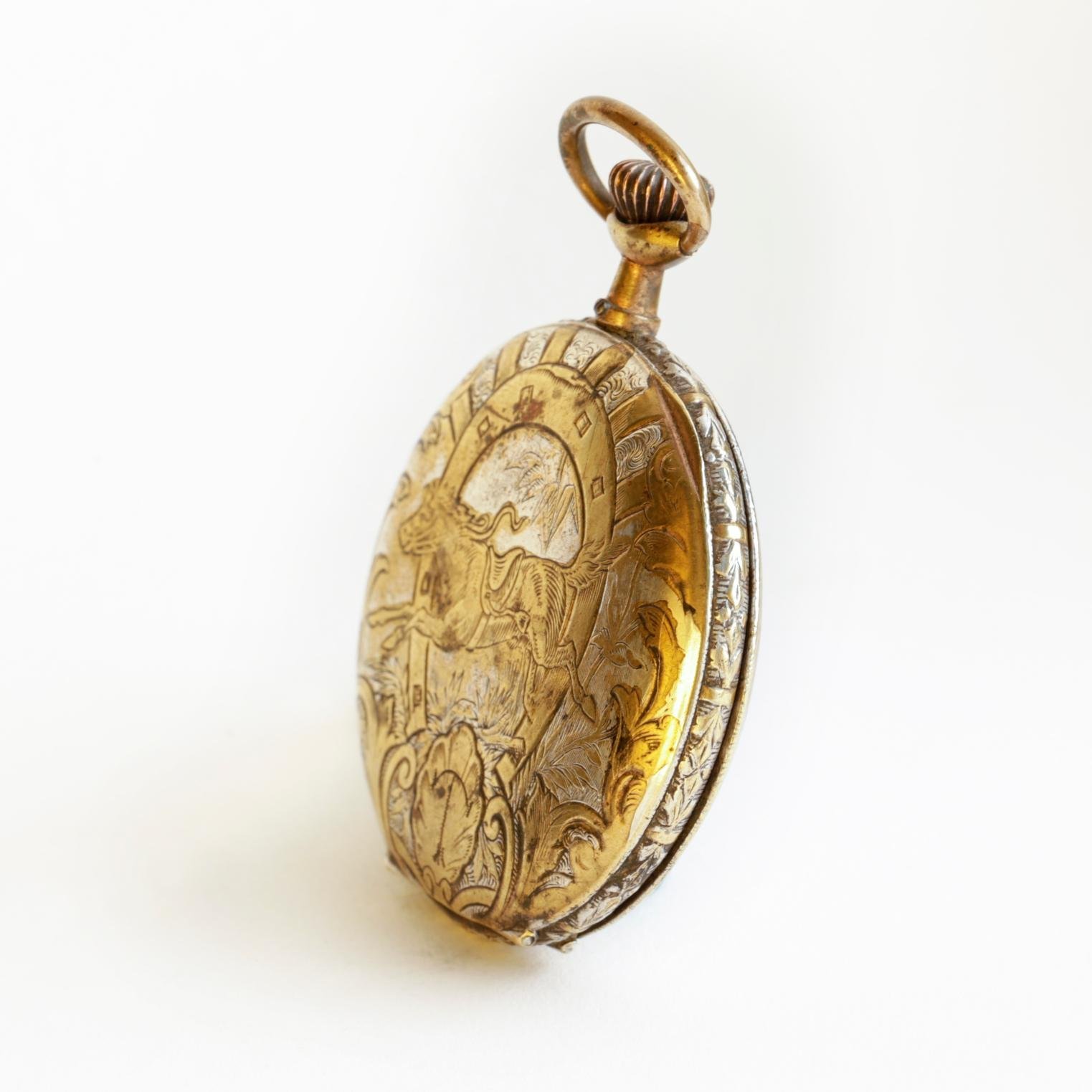 Reloj de bolsillo estadounidense marca Atlanta. Esfera esmaltada con números arábigos, con pequeña fisura. Caja en bronce de dos tapas, cincelada “escenas ecuestres con cowboys”, grabada con iniciales » R.T.». Diámetro 50 mm. No funciona, Faltan agujas y flexo.