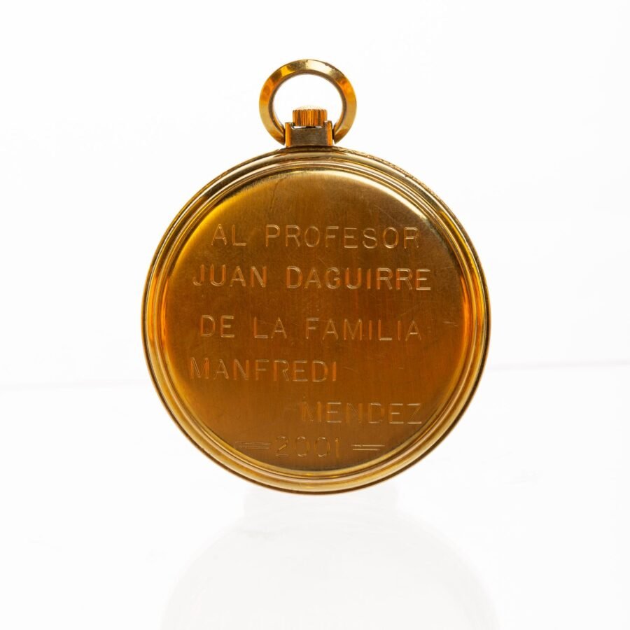 Reloj de bolsillo art decó marca Girard-Perregaux, a cuerda manual. Esfera color gris, con números romanos. Caja de dos tapas enchapada en oro, la trasera grabada con dedicatoria. Diámetro 45 mm. Funcionando.