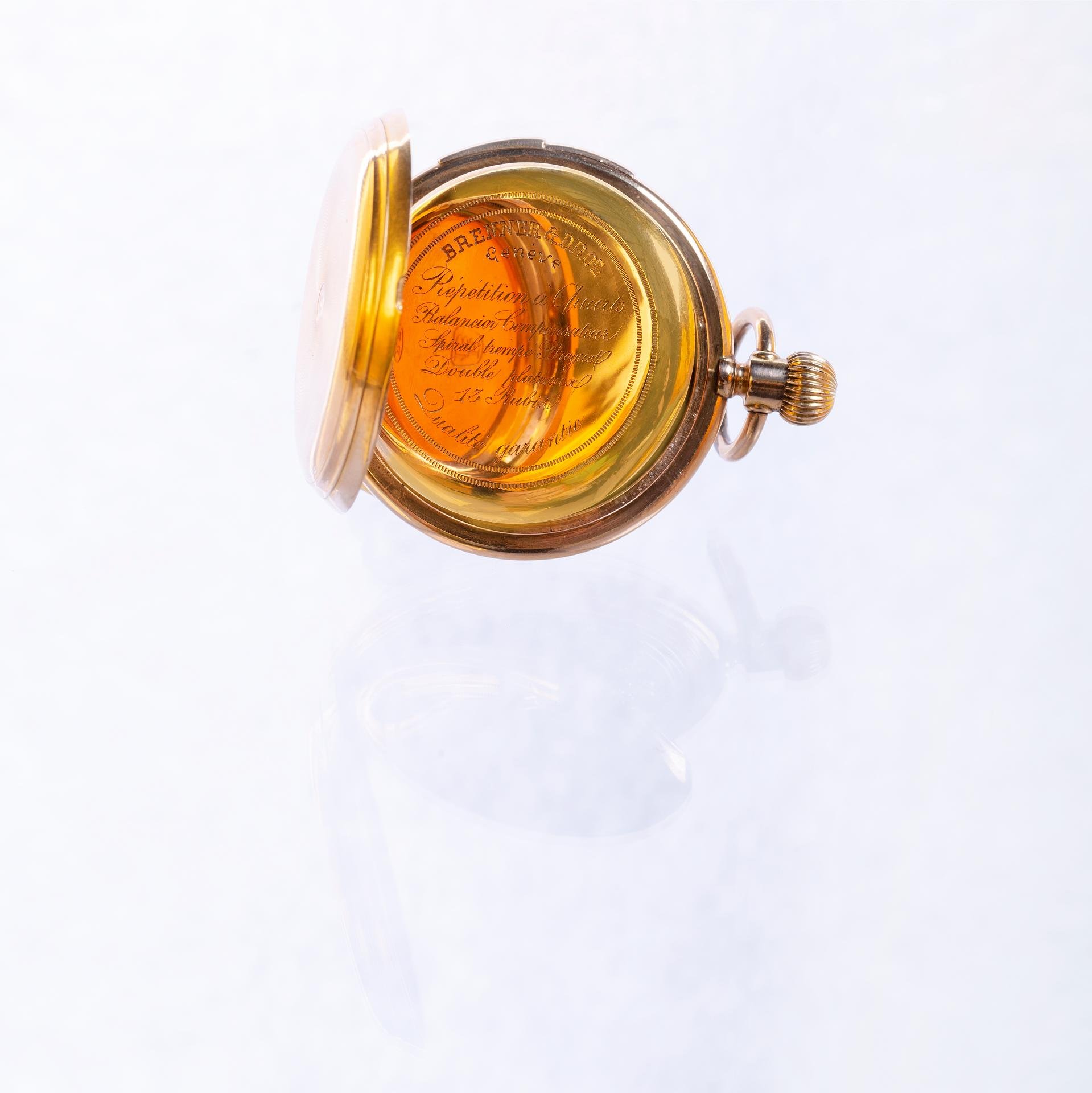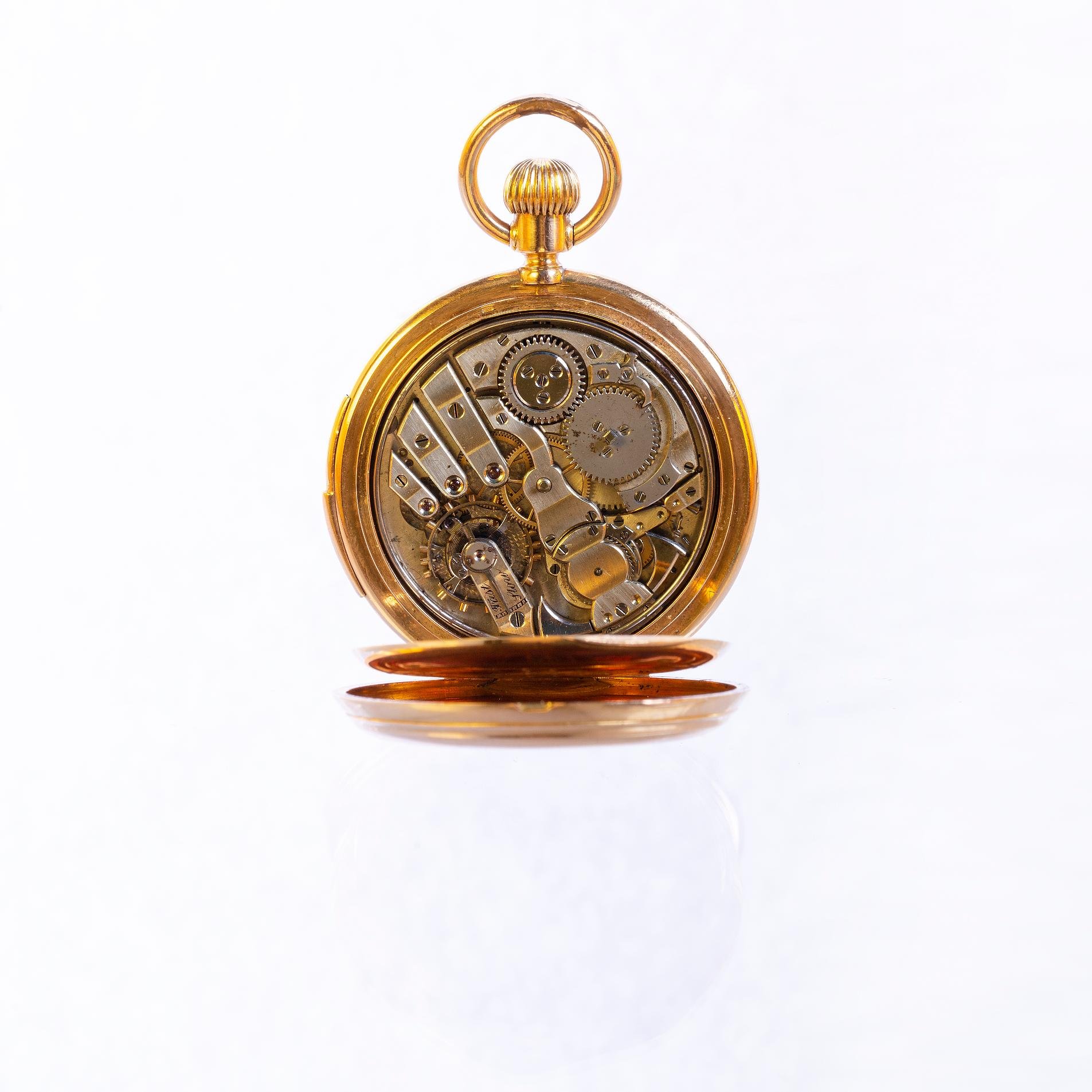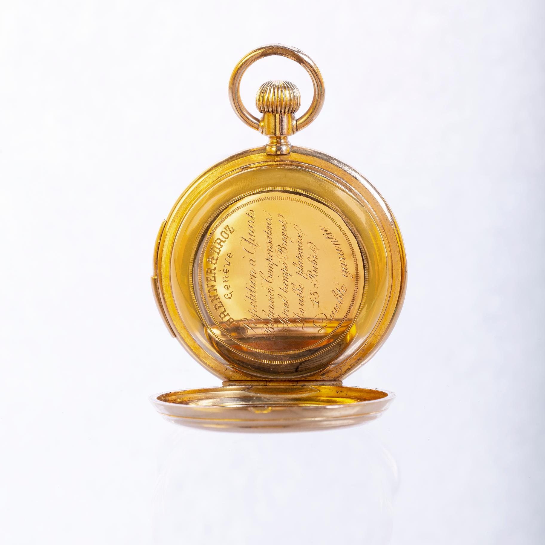 Reloj de bolsillo suizo fabricado por Brenner & Droz, Ginebra, a cuerda manual con sonería de repetición en cuartos. Esfera esmaltada en color blanco con números romanos, con pequeña fisura. Caja de tres tapas en oro 18 K amarillo cincelado «hojas», de un diámetro de 53 mm. Funcionando, sin funcionar la sonería. Presentado en caja de madera forrada en paño azul.