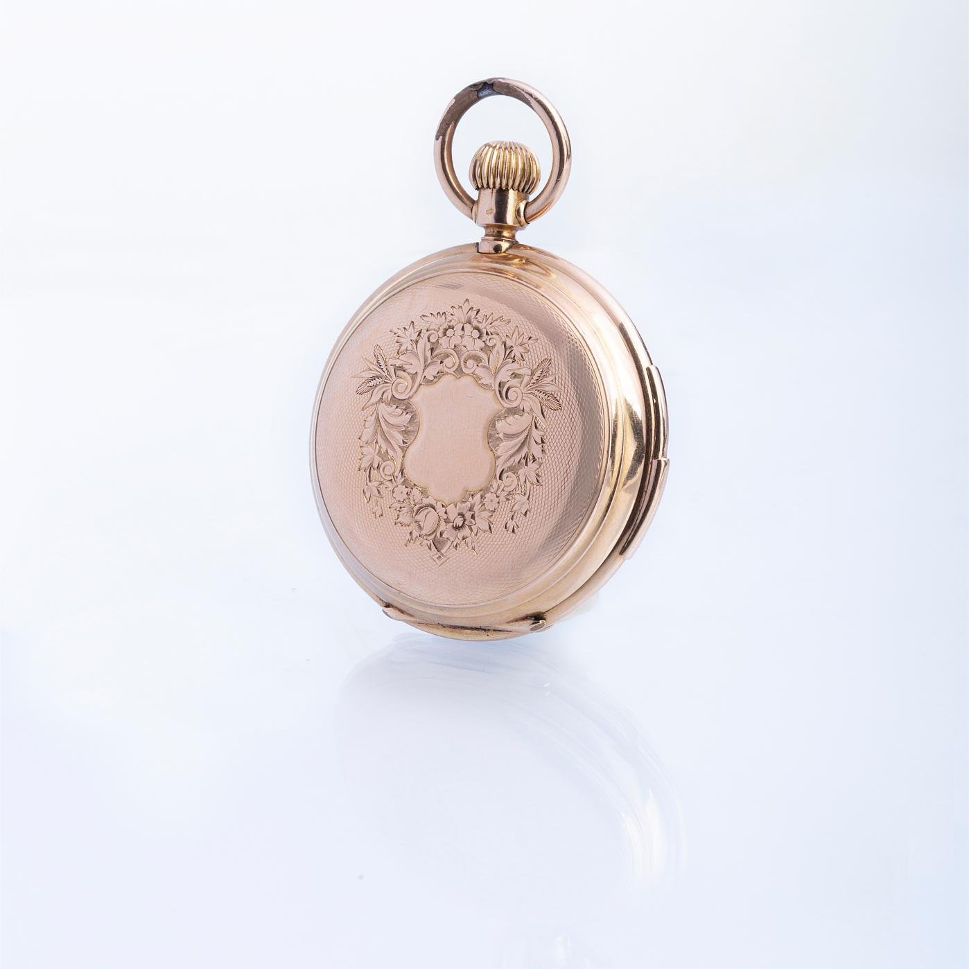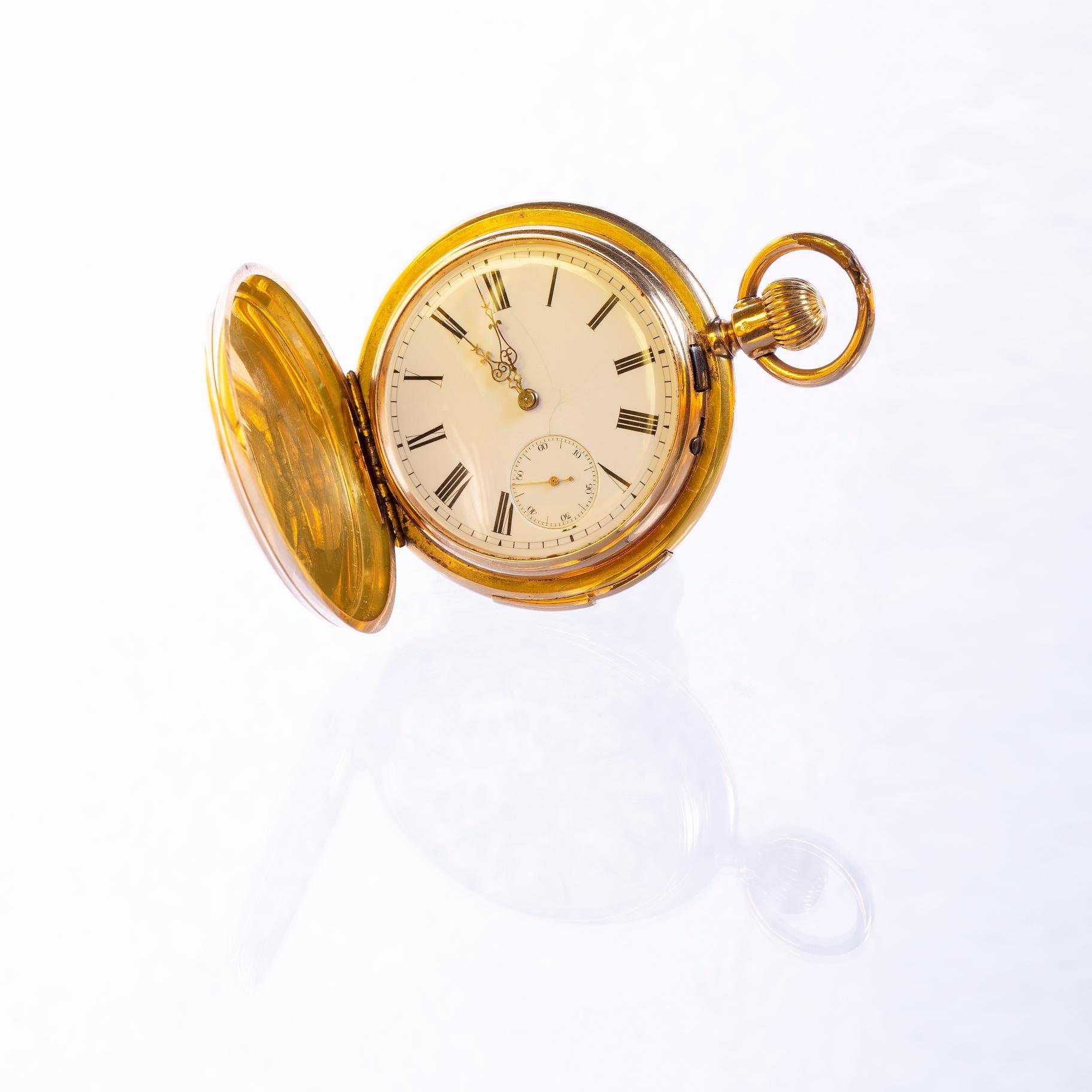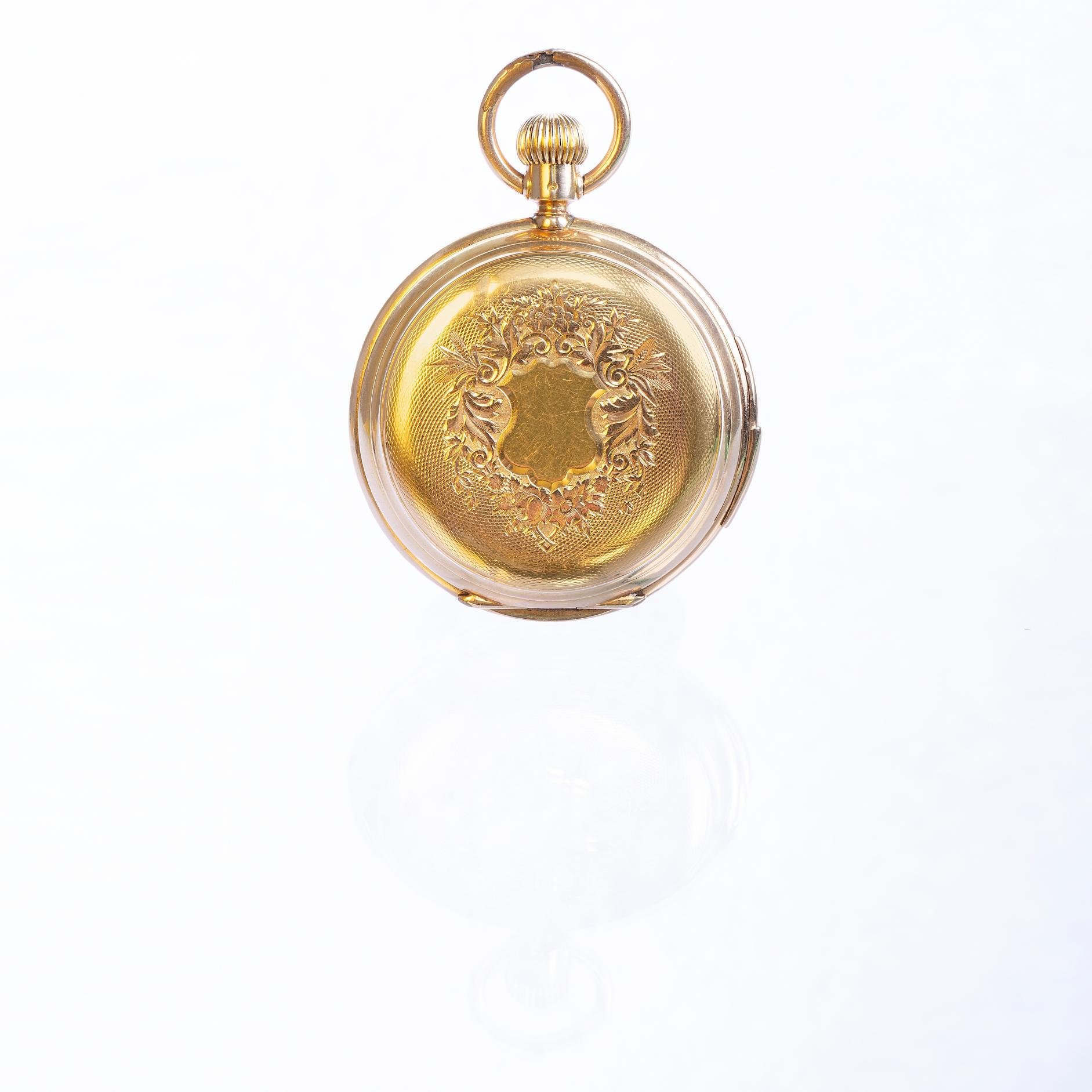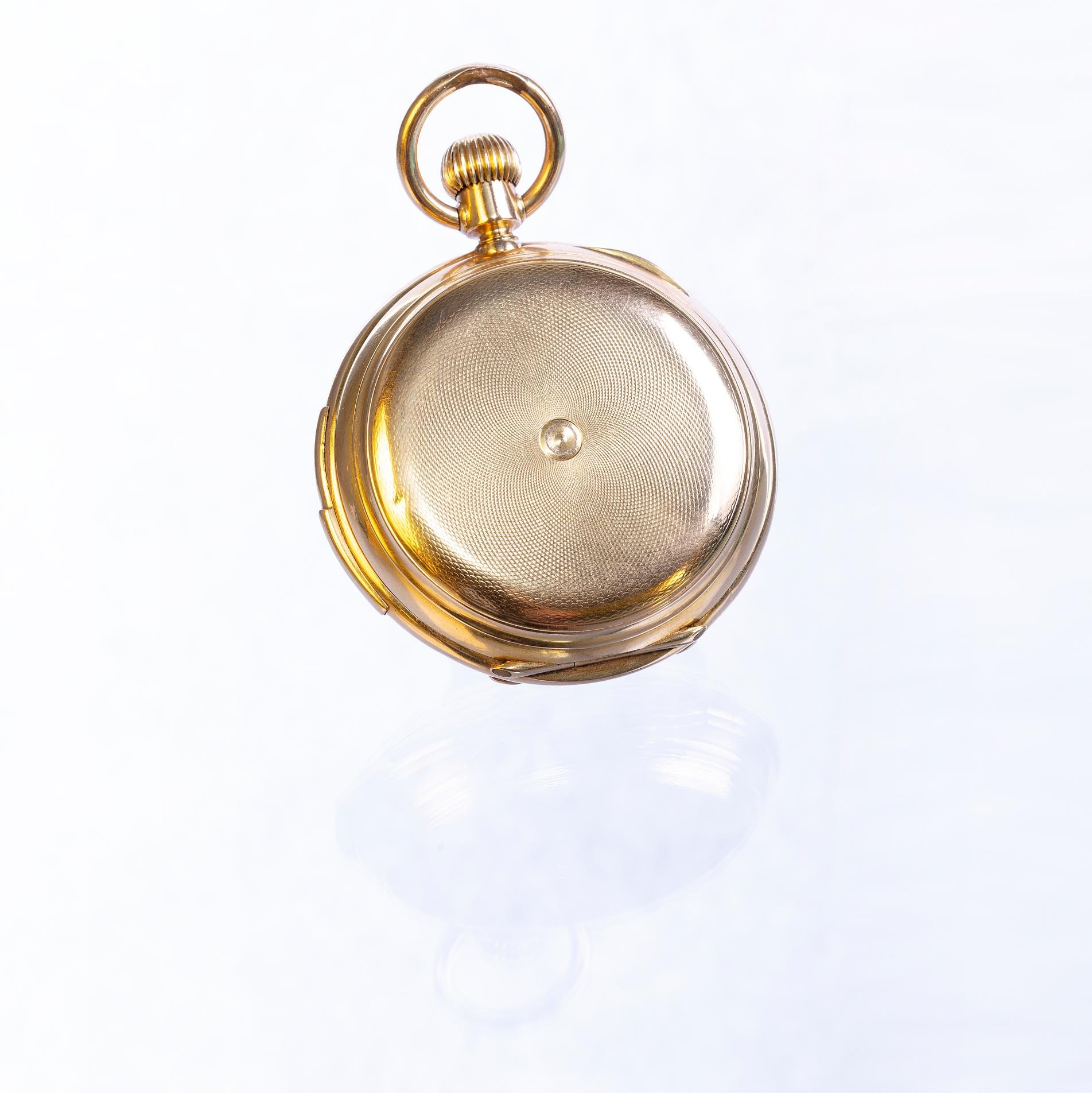 Reloj de bolsillo suizo fabricado por Brenner & Droz, Ginebra, a cuerda manual con sonería de repetición en cuartos. Esfera esmaltada en color blanco con números romanos, con pequeña fisura. Caja de tres tapas en oro 18 K amarillo cincelado «hojas», de un diámetro de 53 mm. Funcionando, sin funcionar la sonería. Presentado en caja de madera forrada en paño azul.