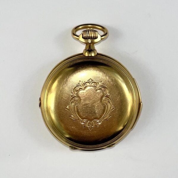 Reloj suizo de bolsillo a cuerda manual, con cronógrafo y repetición, fabricado por Charles Humbert Fils. Caja en oro 18 K segrinado y cincelado «cartela». Tres tapas. Diámetro 62 mm. Funcionando.