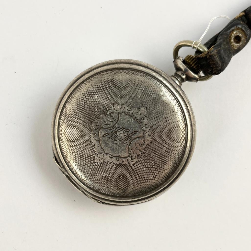 Reloj de bolsillo suizo marca Longines. Caja en plata segrinada y grabada con iniciales “H.E.A.”. Esfera color blanco, con números arábigos. Tapa interna grabada con inscripción » Fabricado expresamente para Nicolás Zito. Gral Rondeau 226 Montevideo». Diámetro de caja 5 cm. No funciona