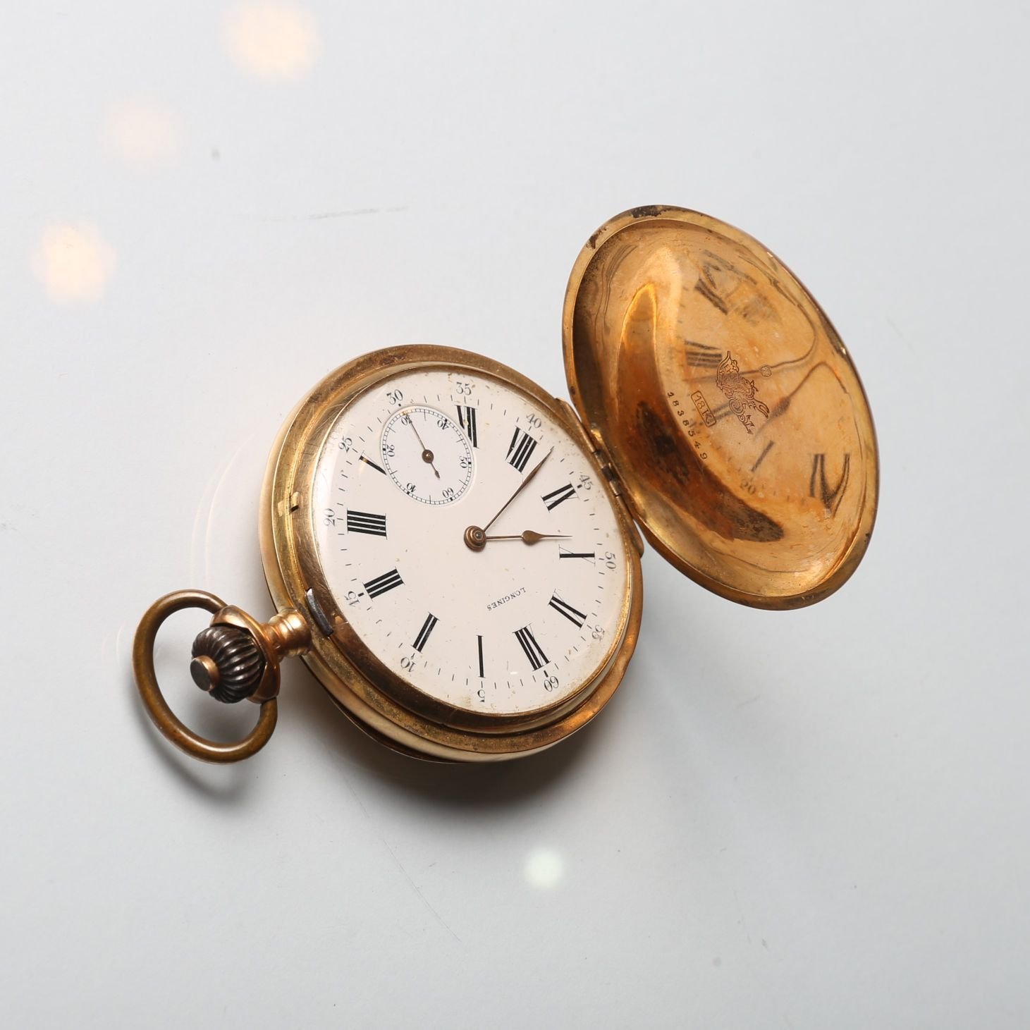 Reloj de bolsillo suizo marca Longines, a cuerda manual. Caja en oro 18 K amarillo cincelado «hojas y flores». Esfera esmaltada con números romanos. Diámetro 50 mm. Peso bruto 93 gr. No funciona. En estuche original, averiado.