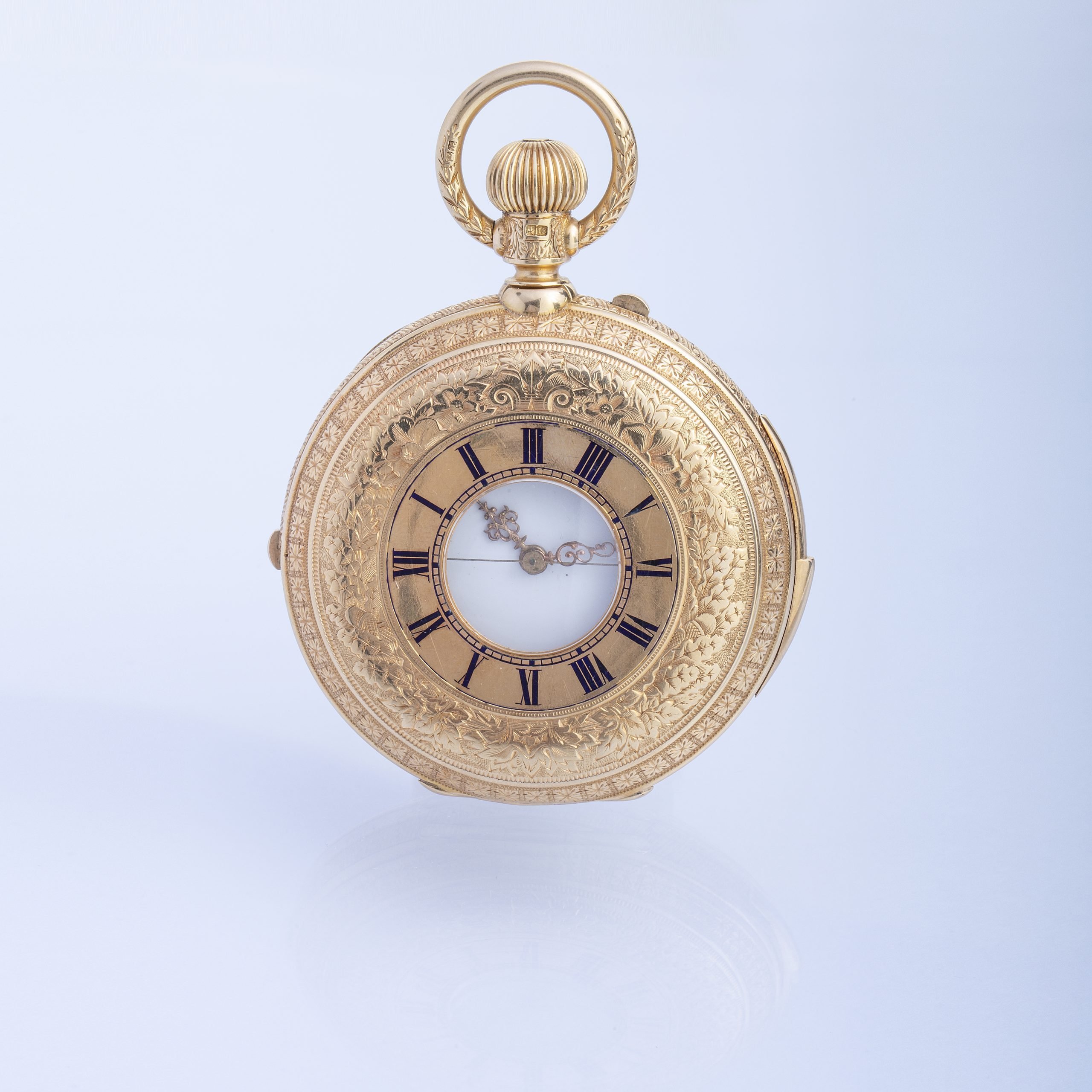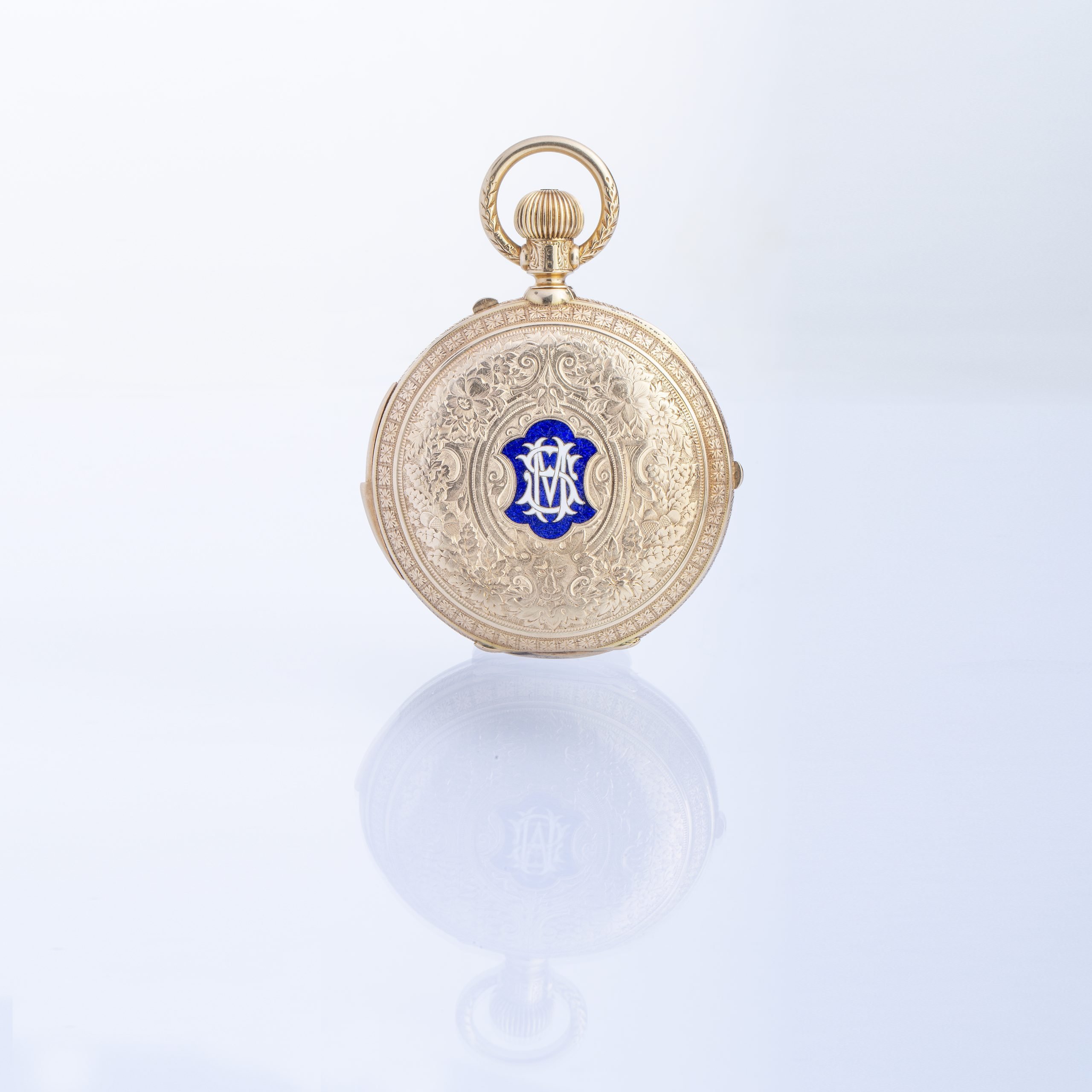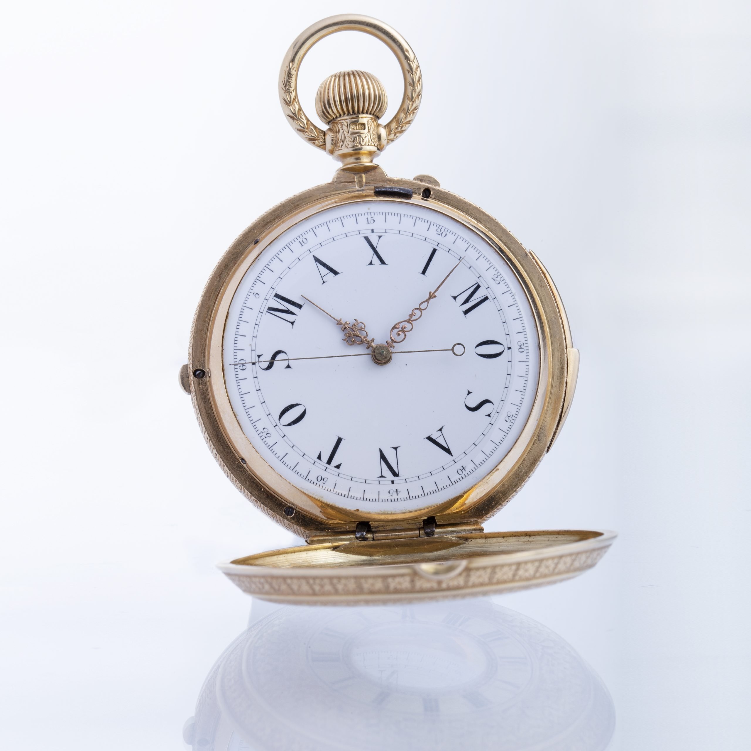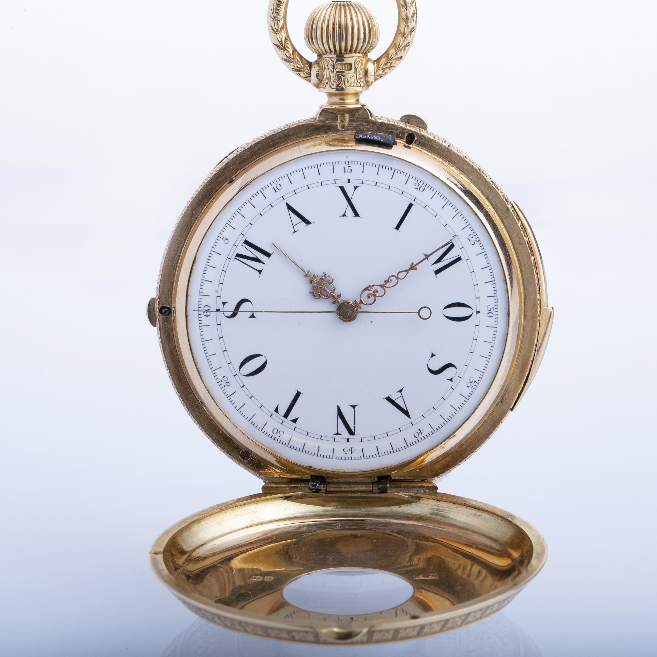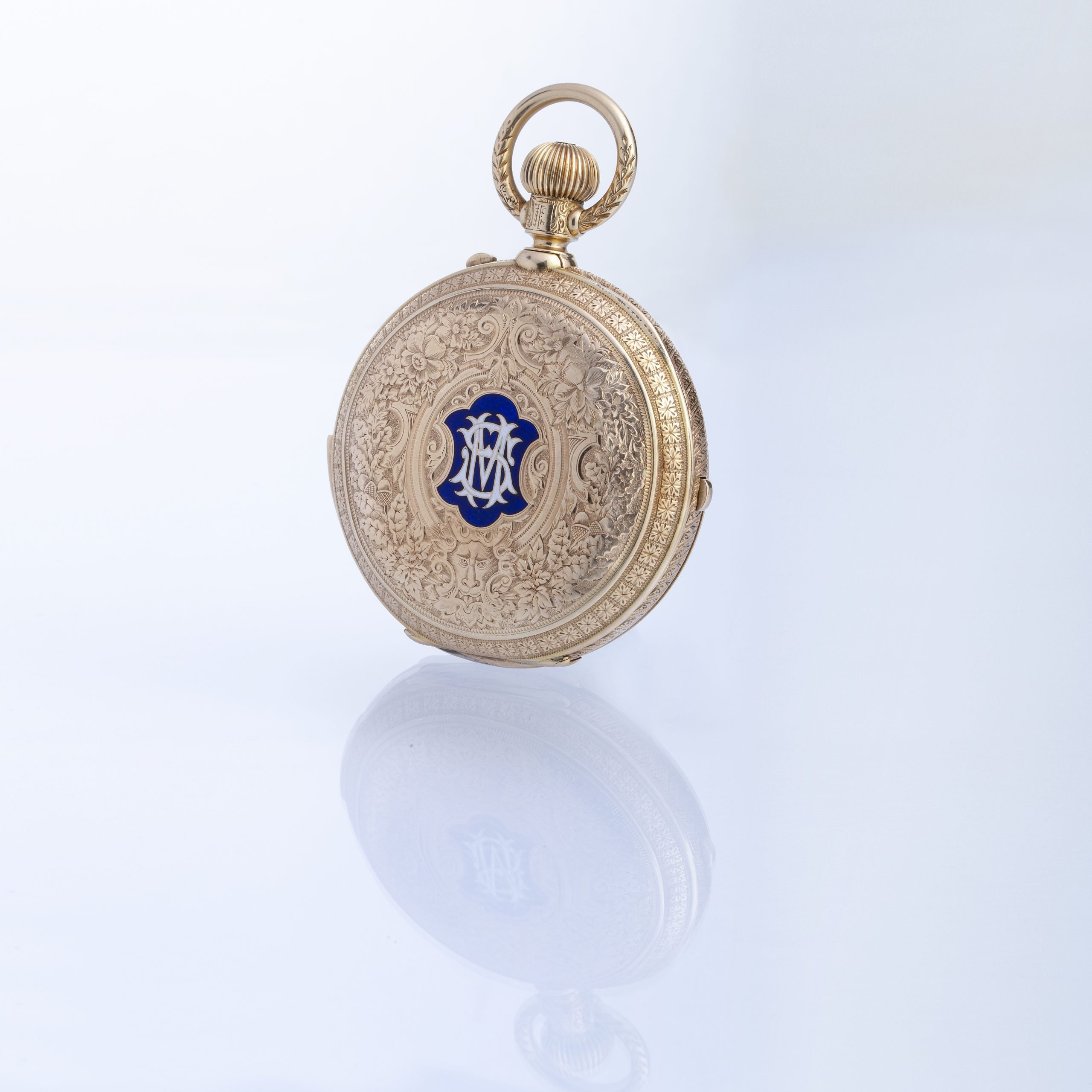 Reloj de bolsillo inglés perteneciente al presidente uruguayo Máximo Santos (1847-1889). Esfera esmaltada en color blanco, con inscripción «Máximo Santos» en esmalte negro. Máquina con sonería en minutos y cronómetro. Caja en oro 18 K totalmente grabada «hojas, flores, máscaras” y guardas de hojas de roble con bellotas. Diámetro de caja 54 mm. Alto con pendant 78 mm. Tres tapas; la frontal con visor de agujas en cristal y aro con números romanos en esmalte azul; la trasera con monograma «M.S.» en esmalte blanco y azul, con punzón «C.F.» perteneciente al fabricante Charles Frodsham, numeración «15561» y punzones o «english hallmarks» correspondientes (¿Londres 1880?). Peso bruto 143 gr. Funcionando. Presentado en estuche forrado en cuero marrón, con interior de tapa forrado en seda y decorado con cinta bicolor celeste y blanca, con guía para exhibir reloj y cadena (ver lote 143).