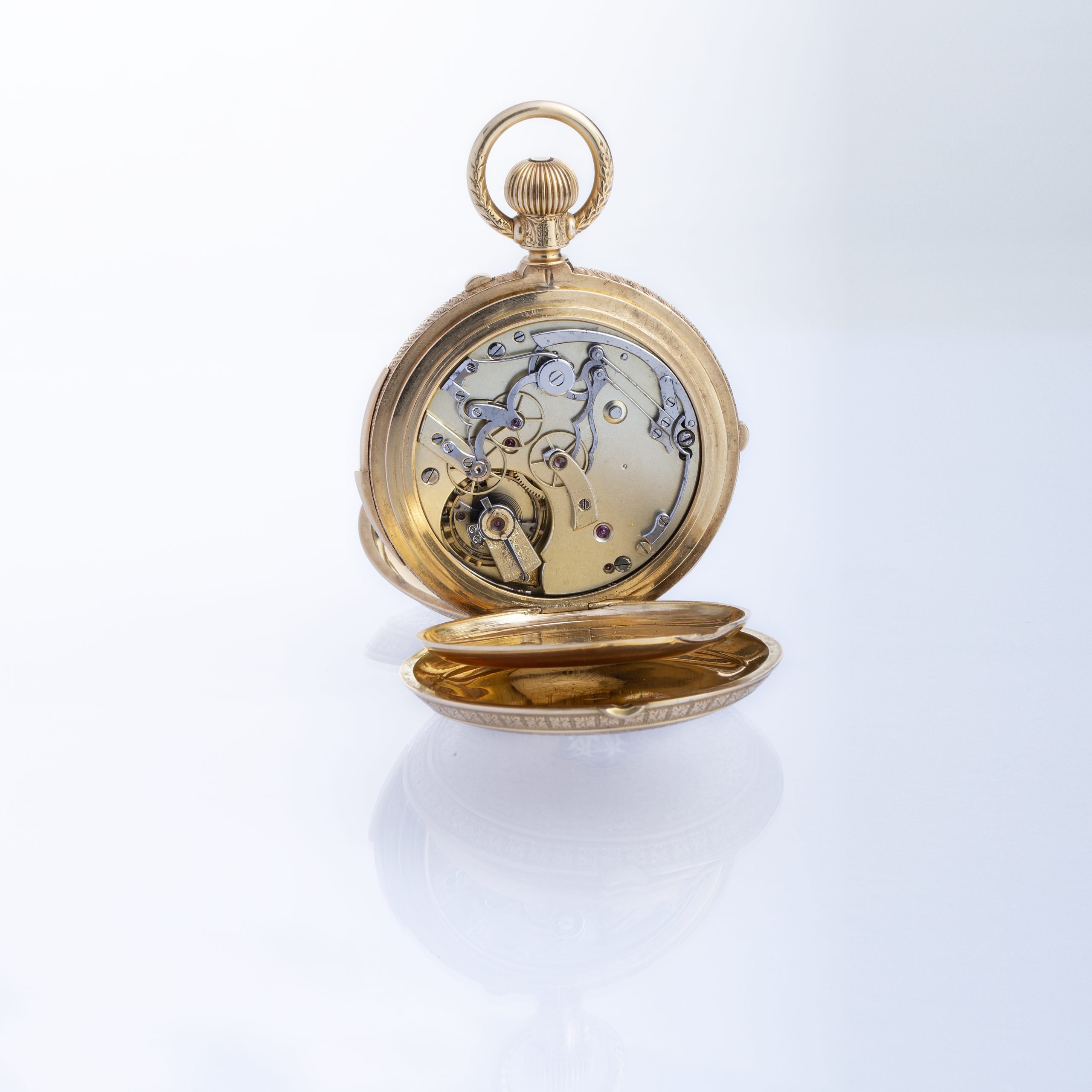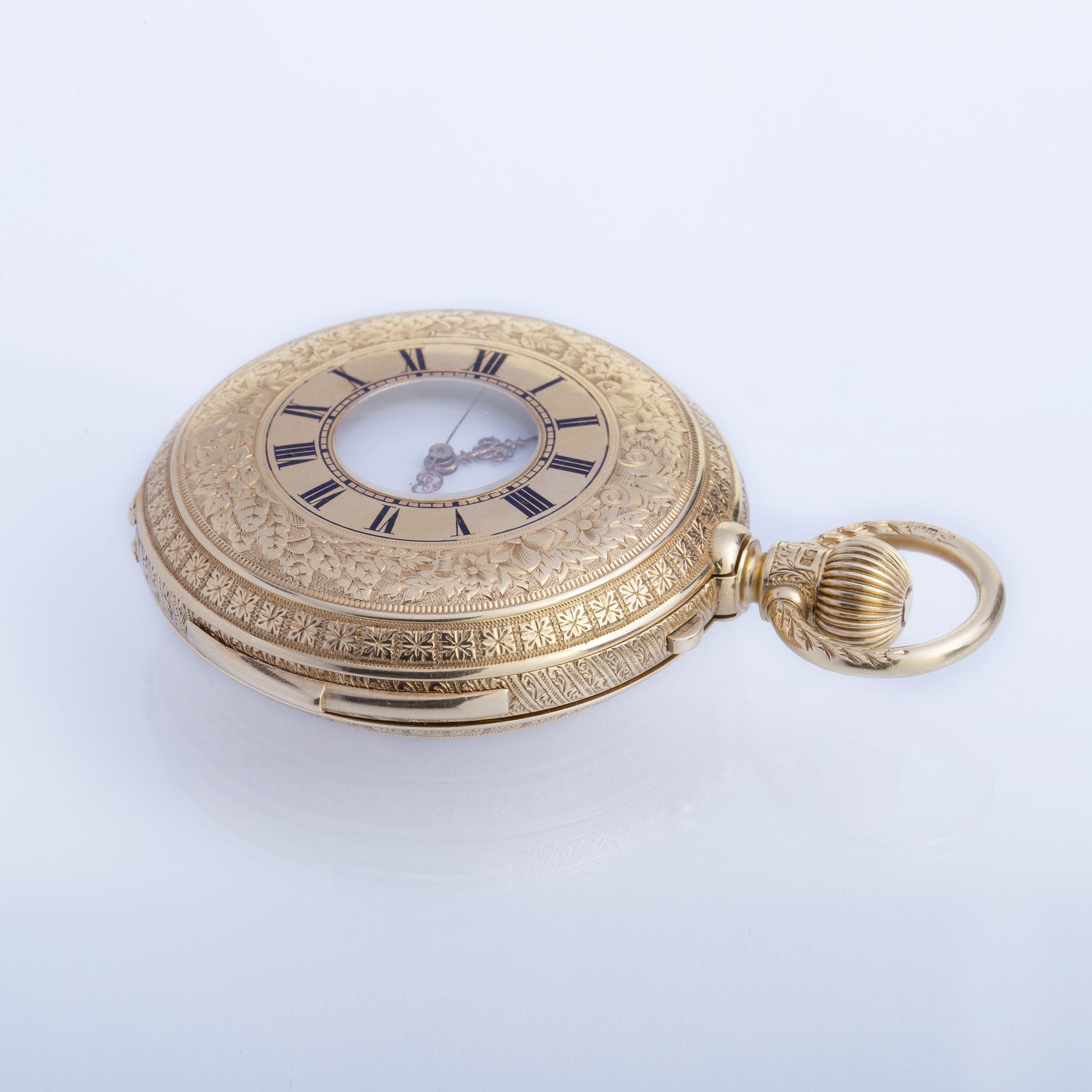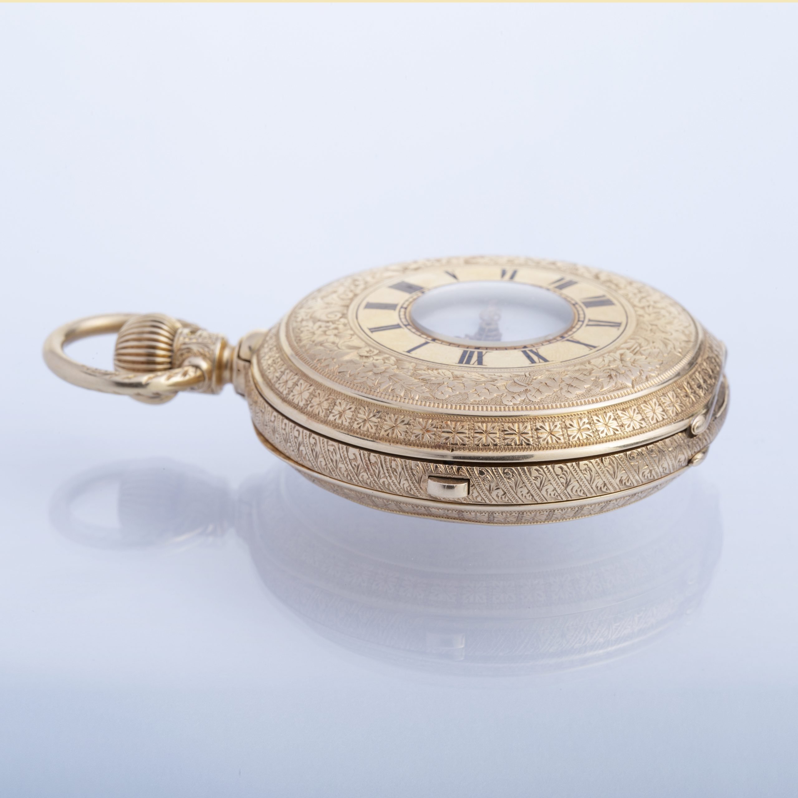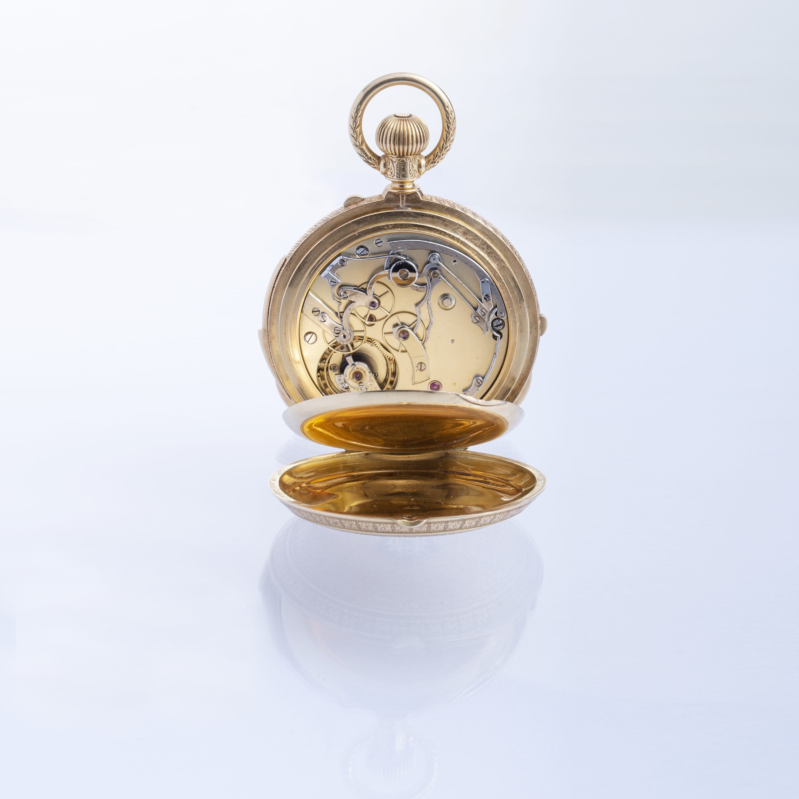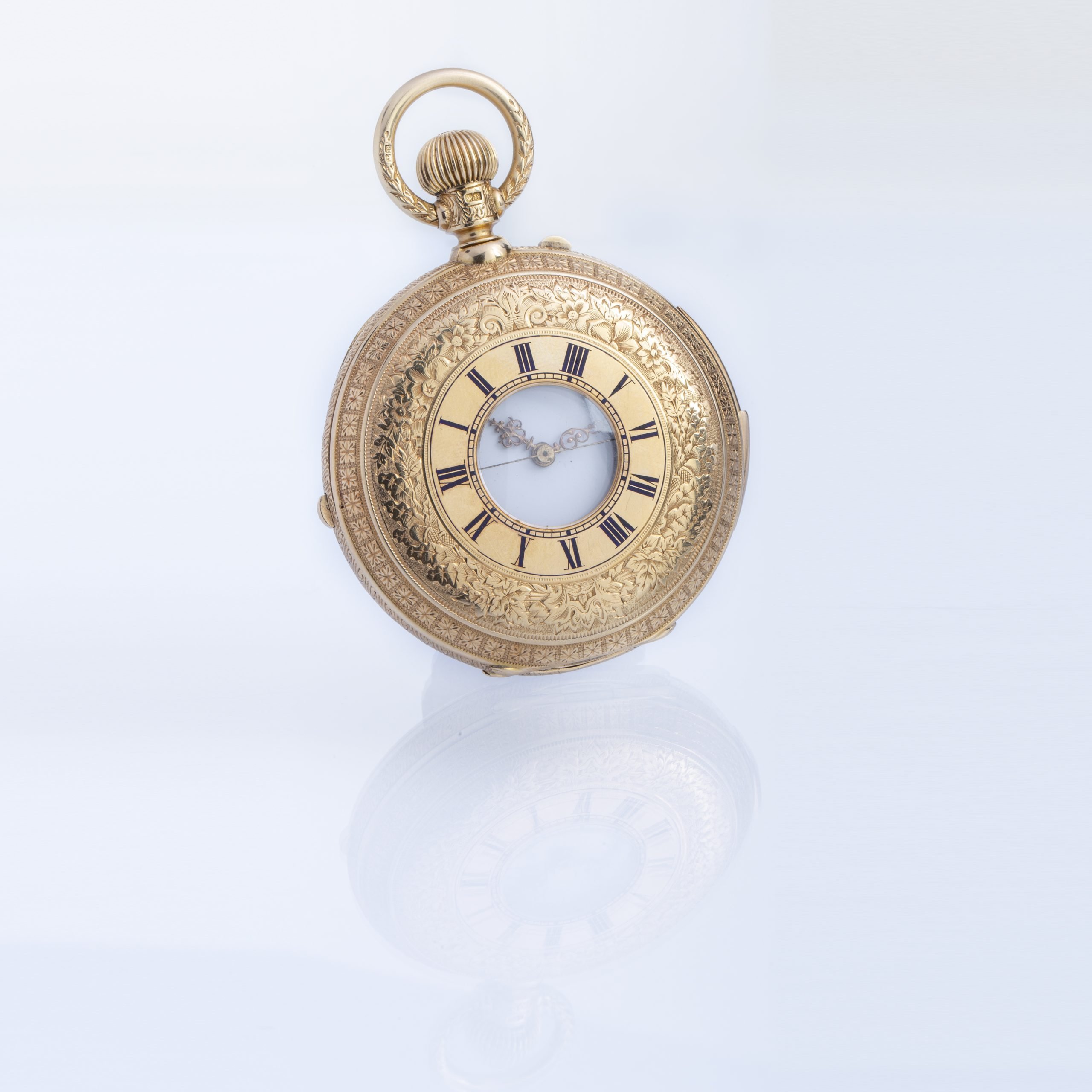 Reloj de bolsillo inglés perteneciente al presidente uruguayo Máximo Santos (1847-1889). Esfera esmaltada en color blanco, con inscripción «Máximo Santos» en esmalte negro. Máquina con sonería en minutos y cronómetro. Caja en oro 18 K totalmente grabada «hojas, flores, máscaras” y guardas de hojas de roble con bellotas. Diámetro de caja 54 mm. Alto con pendant 78 mm. Tres tapas; la frontal con visor de agujas en cristal y aro con números romanos en esmalte azul; la trasera con monograma «M.S.» en esmalte blanco y azul, con punzón «C.F.» perteneciente al fabricante Charles Frodsham, numeración «15561» y punzones o «english hallmarks» correspondientes (¿Londres 1880?). Peso bruto 143 gr. Funcionando. Presentado en estuche forrado en cuero marrón, con interior de tapa forrado en seda y decorado con cinta bicolor celeste y blanca, con guía para exhibir reloj y cadena (ver lote 143).