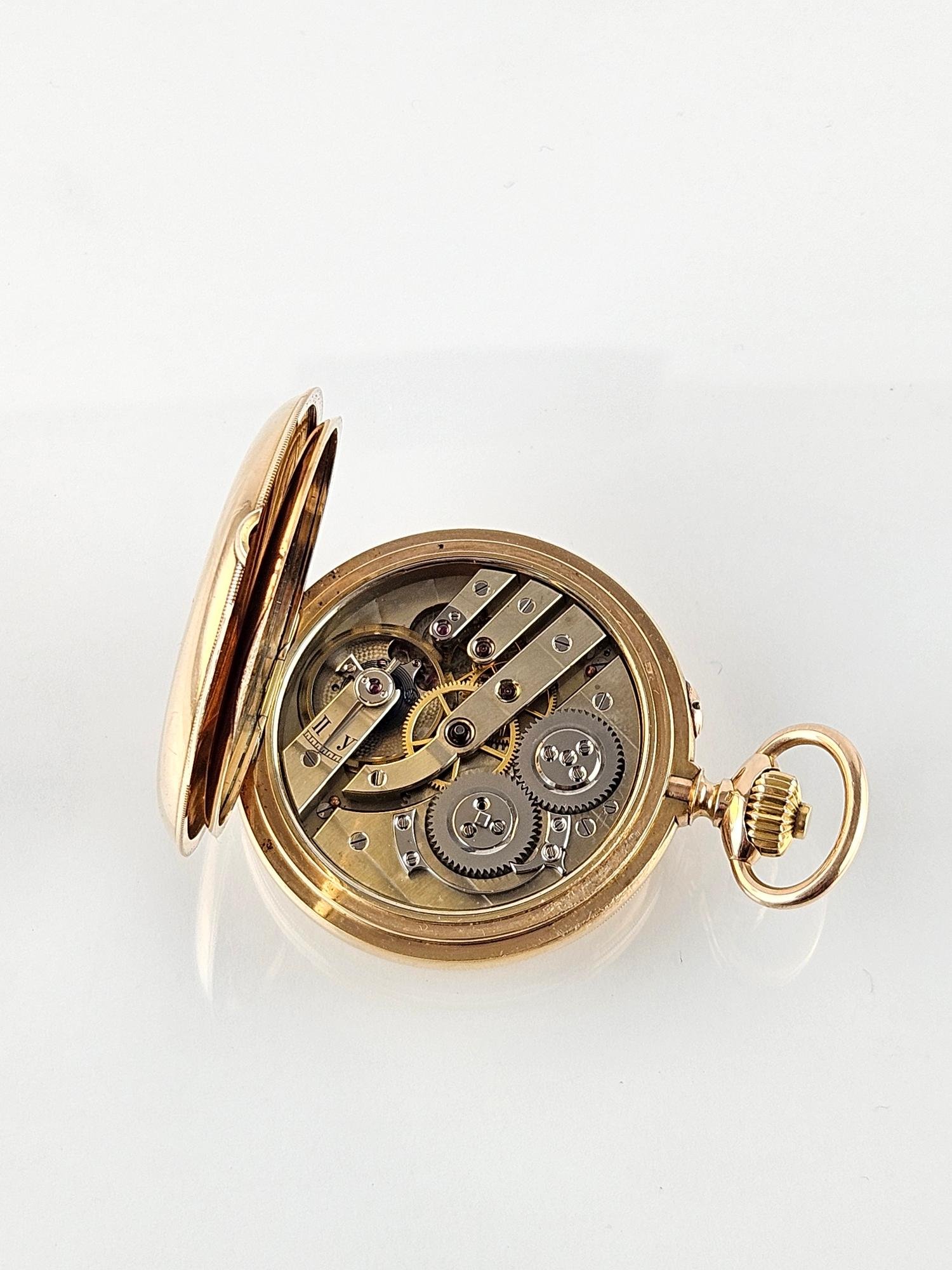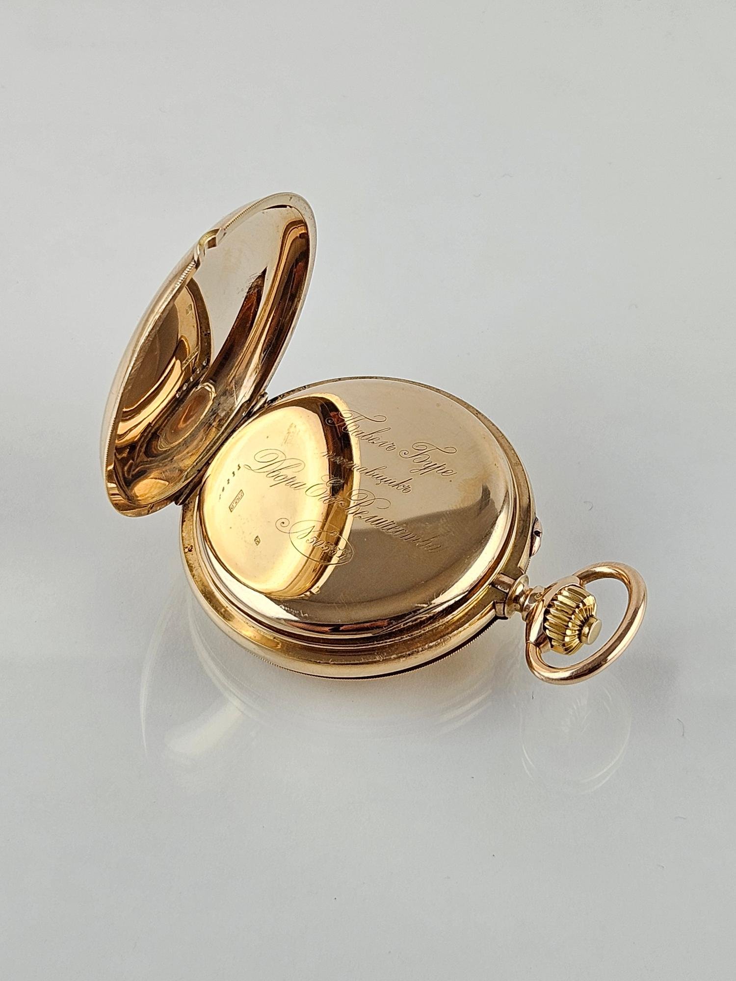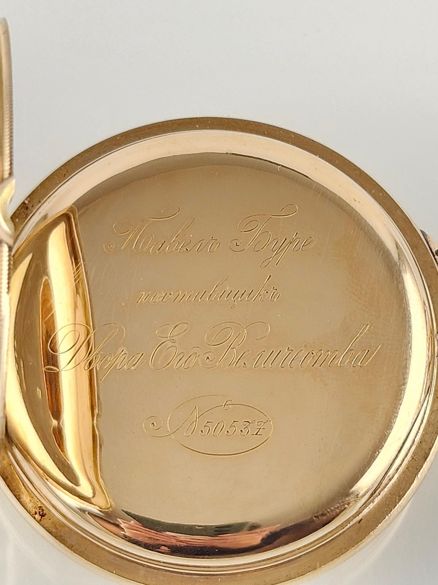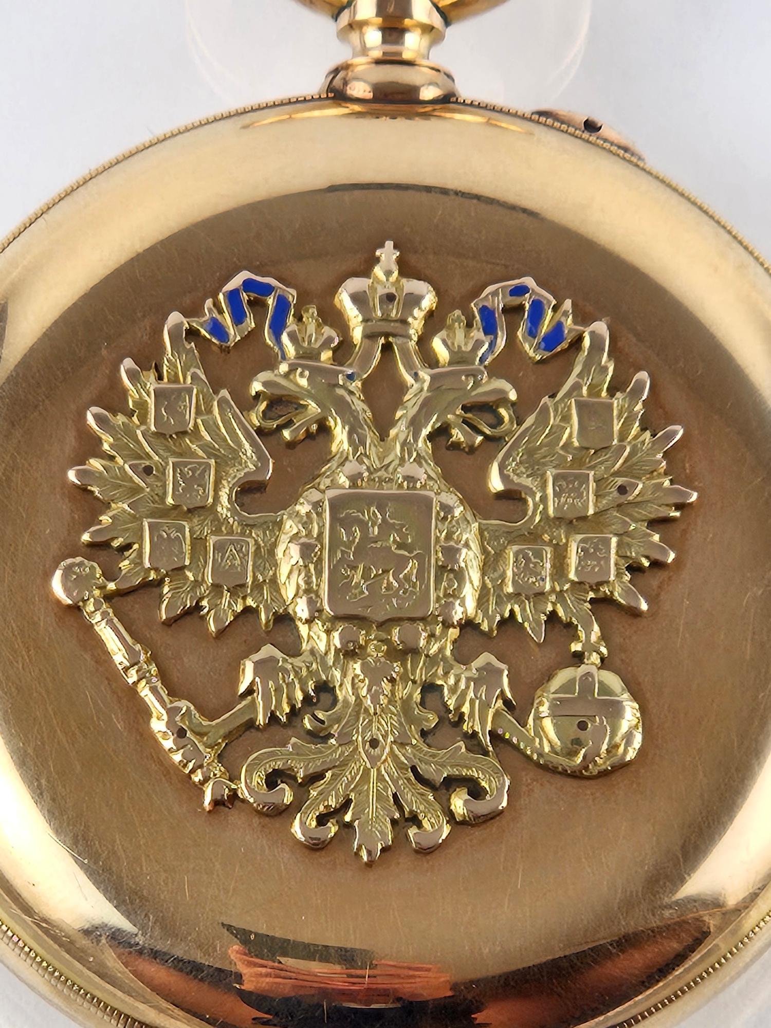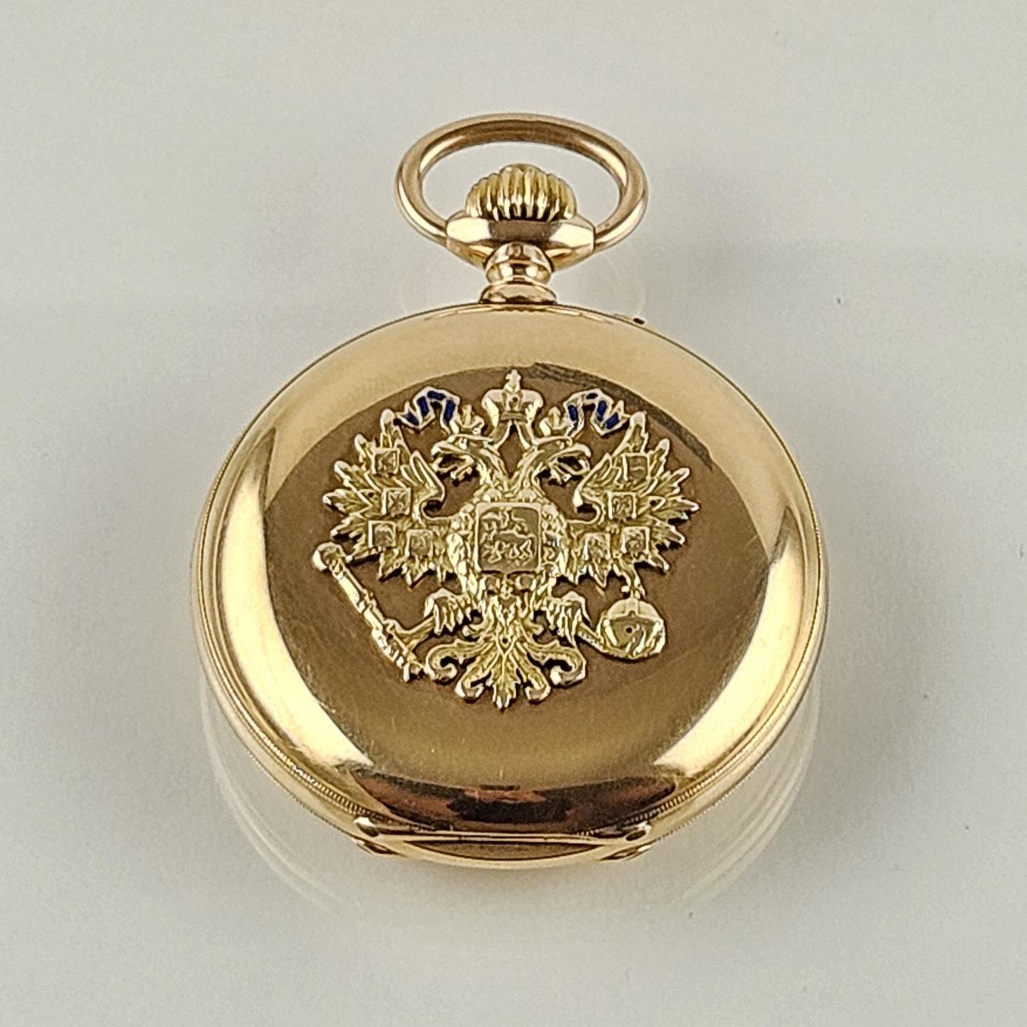 Reloj de bolsillo ruso, realizado por Pavel Bühre para obsequios diplomáticos de la casa real rusa. San Petersburgo, primera década del siglo XX. Esfera esmaltada en color blanco con números romanos en negro. Caja en oro 14 K amarillo, con tres tapas. Diámetro de caja 54,5 mm. Tapa frontal decorada «escudo de los Romanov» en oro amarillo con detalles en esmalte azul. Tapa interna grabada por el fabricante. No. de reloj 50537. Funcionando. Presentado en caja de caoba de Indias, no original.