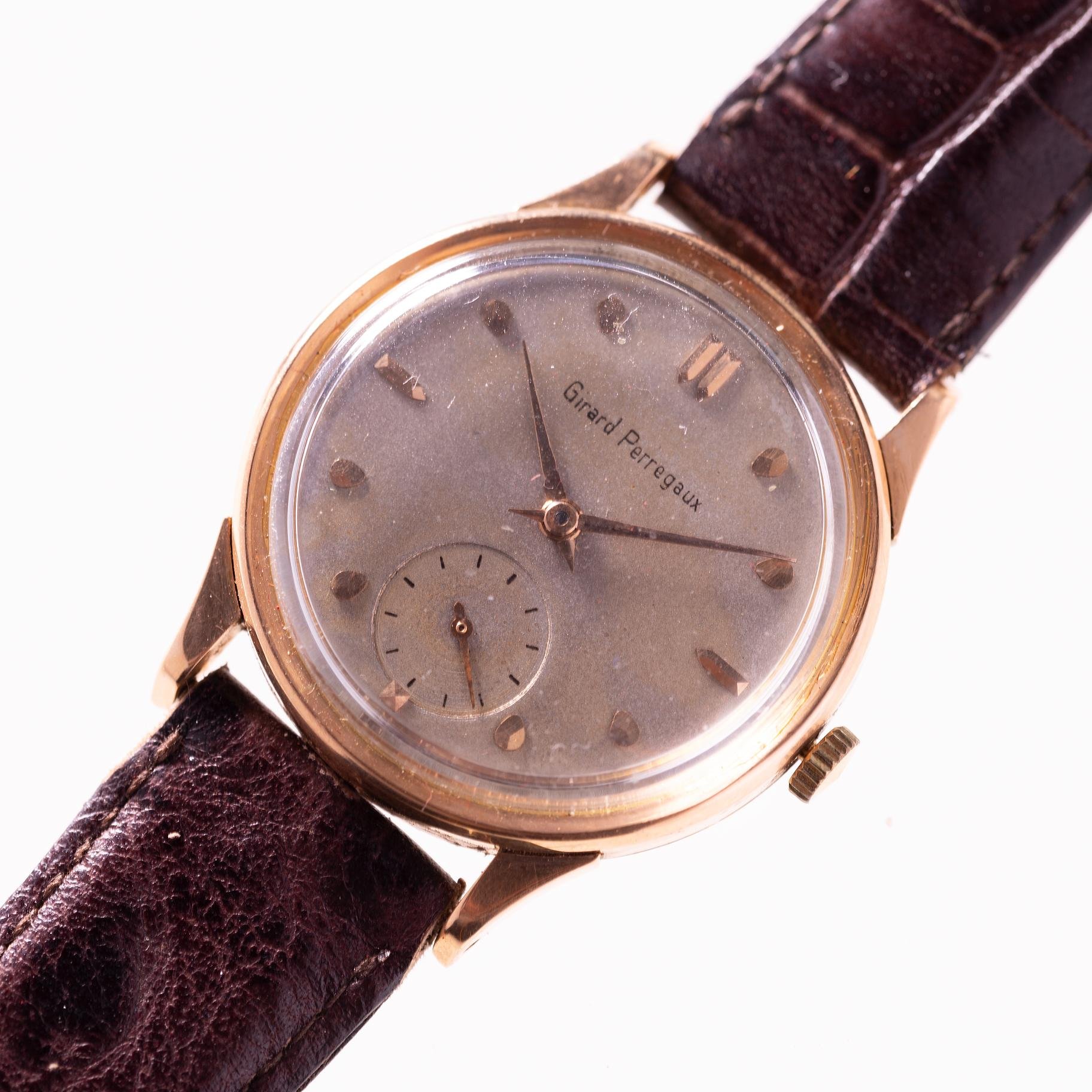 Reloj pulsera para hombre marca Girard-Perregaux, a cuerda manual. Esfera color plateado, con agujas e índex en oro. Caja en oro 18 K amarillo. Diámetro de caja 34 mm. Esfera repintada. Funcionando. Correa en cuero marrón.