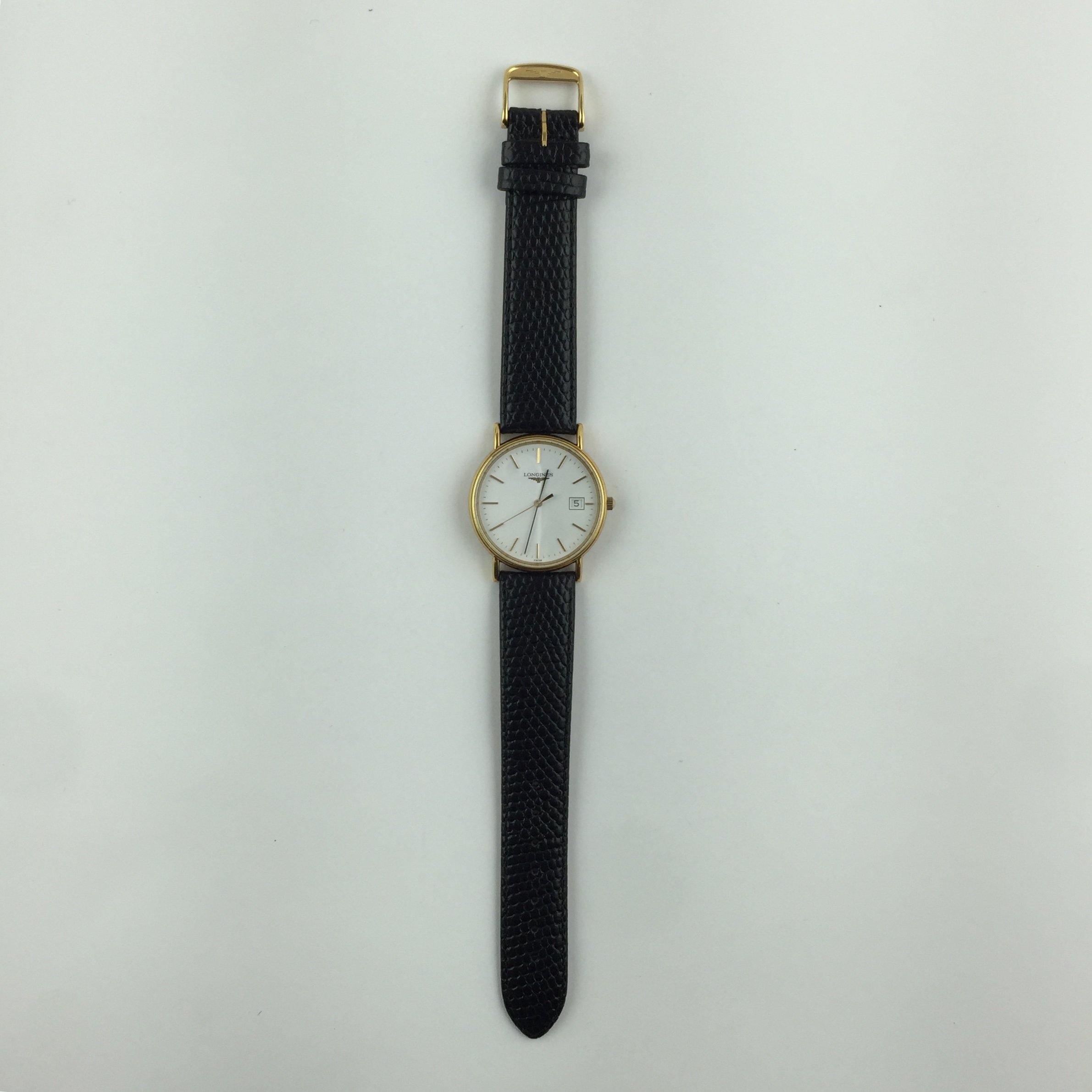 Reloj pulsera para hombre marca Longines, cuarzo. Esfera blanca, con calendario. Caja enchapada en oro amarillo, con tapa en acero inoxidable. Malla original en cuero símil cocodrilo. Sin uso, funcionando.